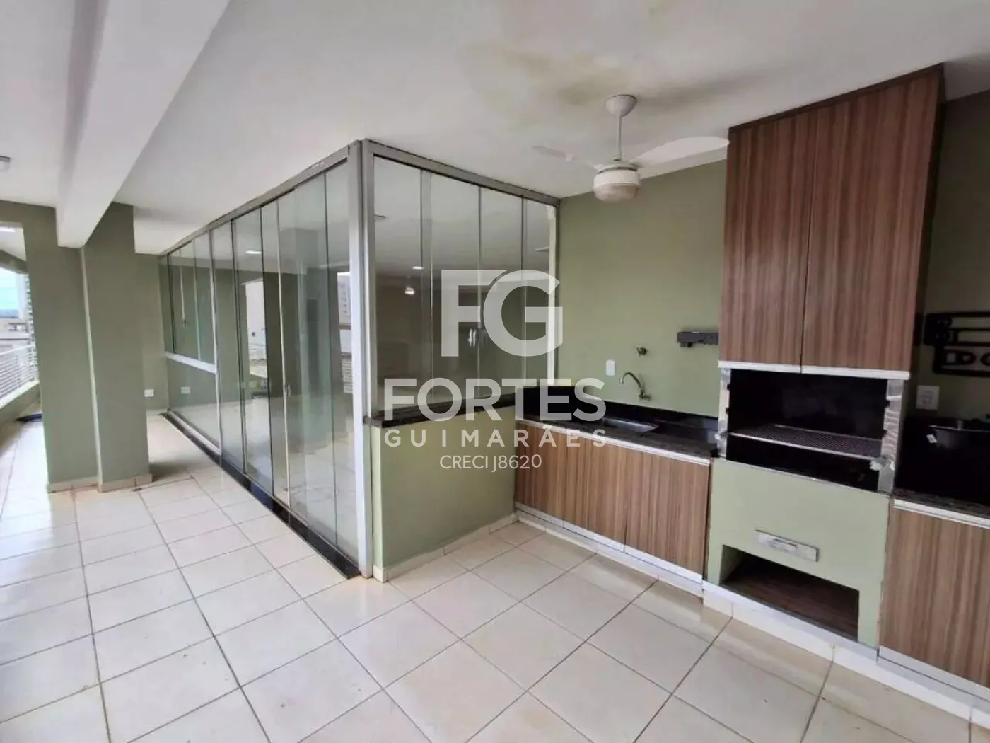 Varanda Gourmet com armário gabinete, churrasqueira e ventilador de teto