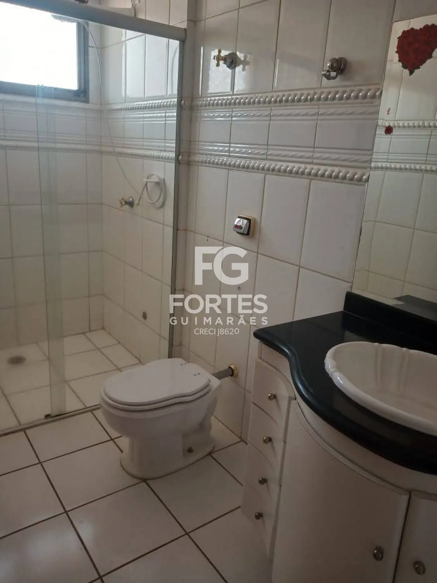 Banheiro social com armários gabinete, espelho e box em vidro,