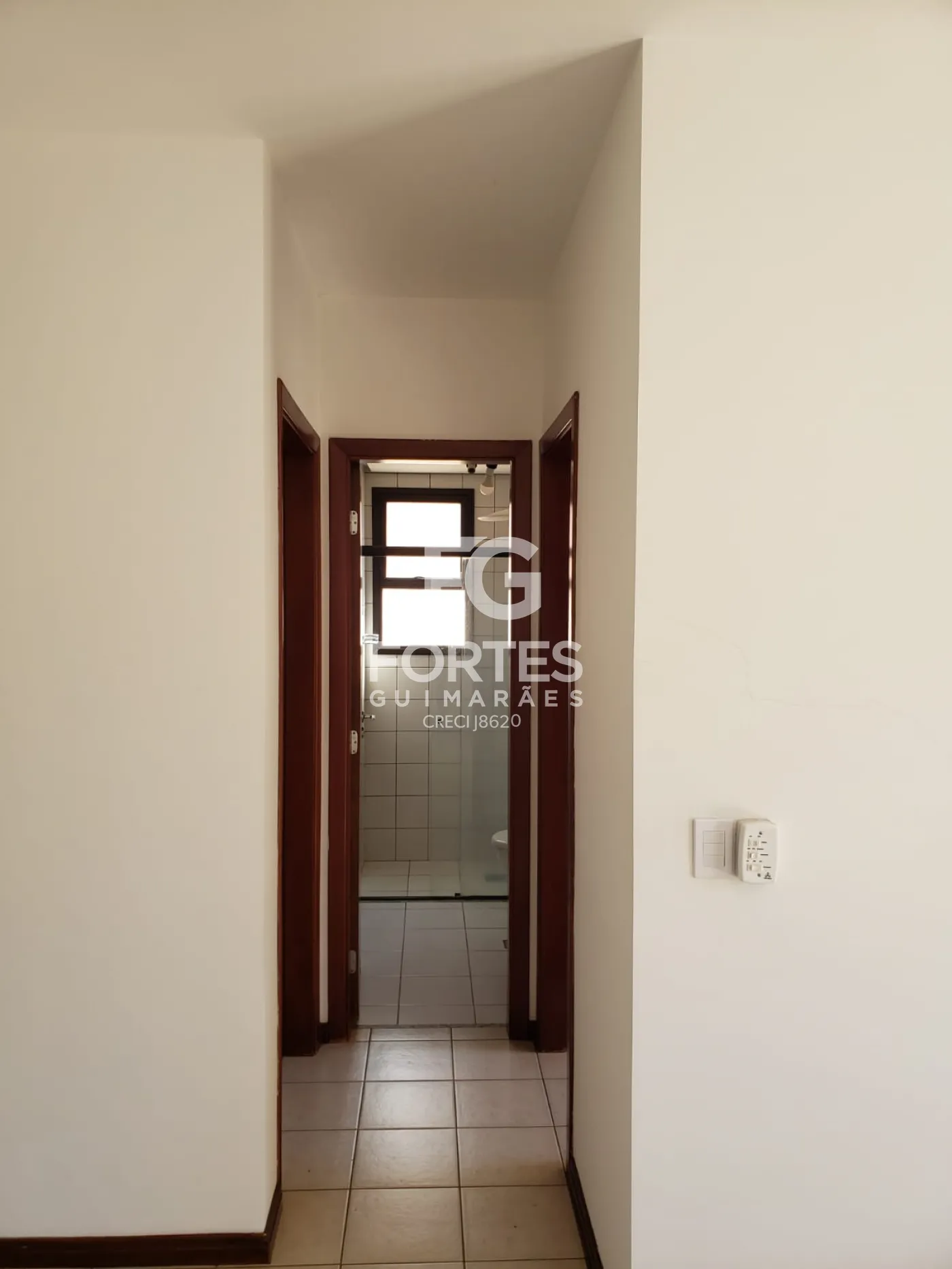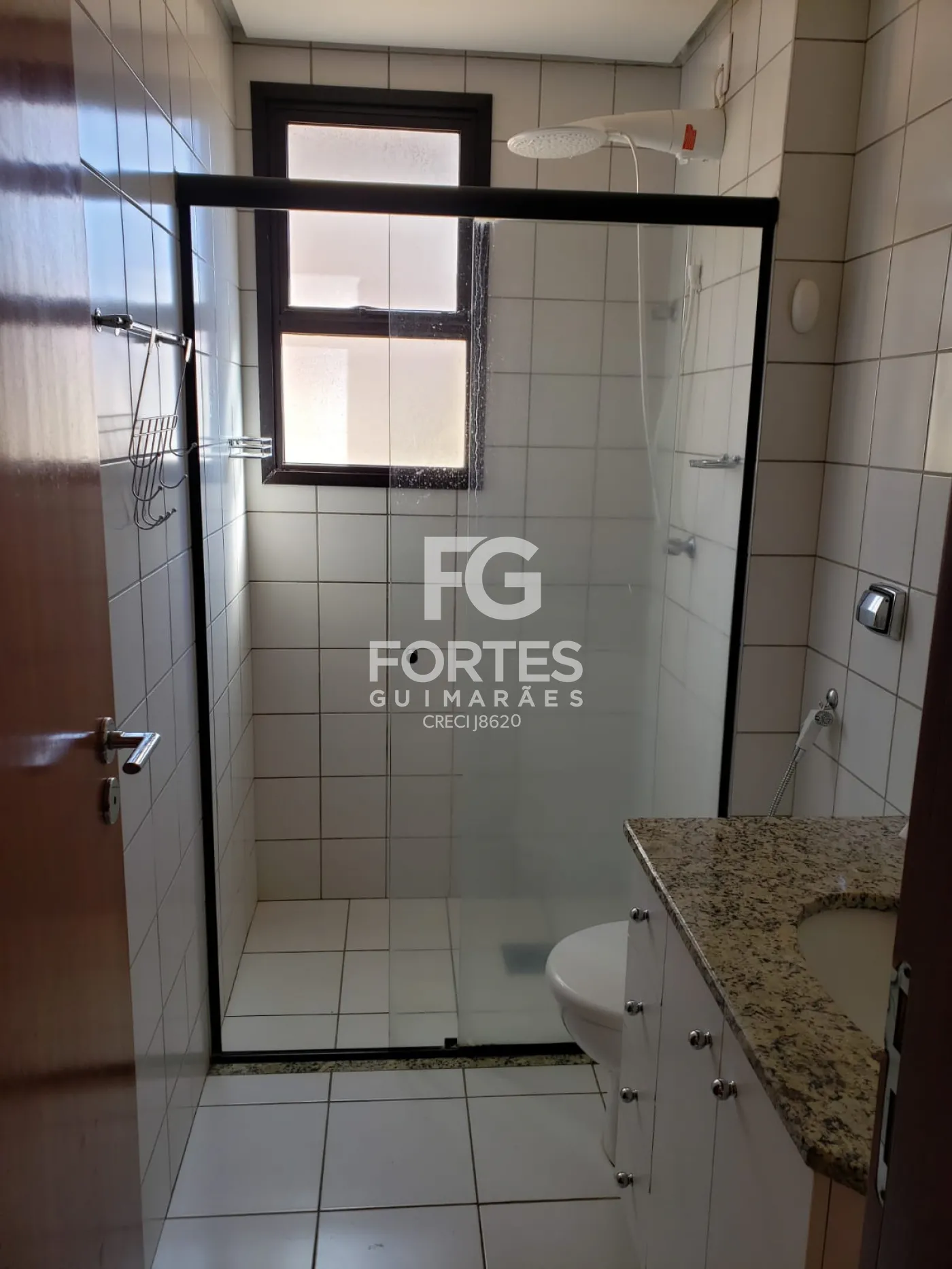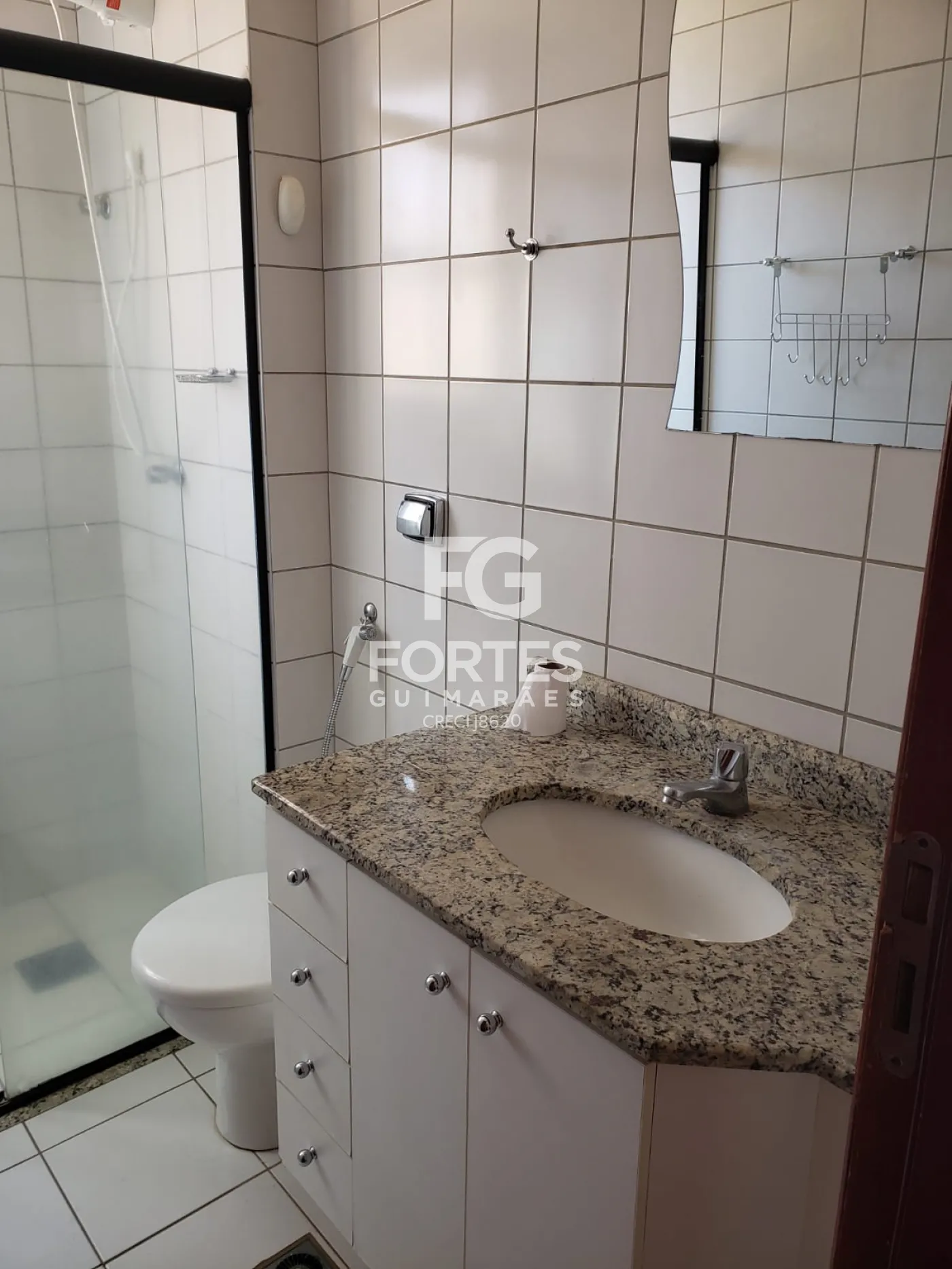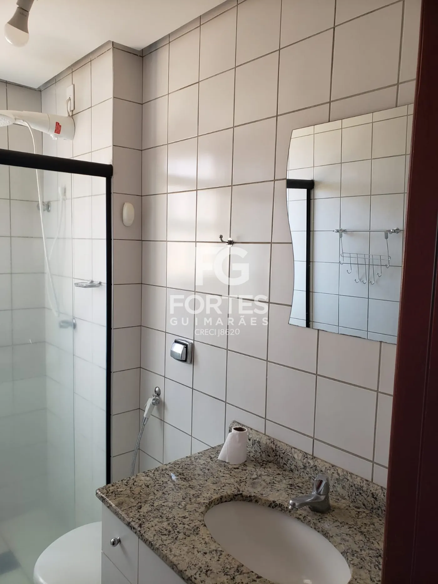 - 1 Banheiro social com gabinete, espelho e box em vidro
