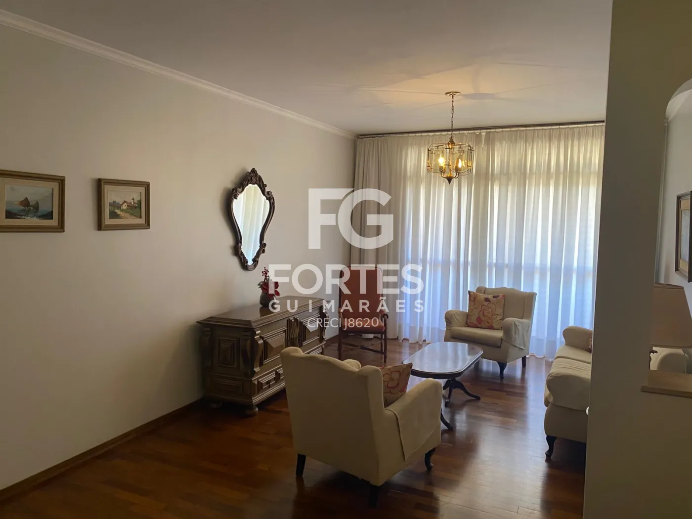 Sala de estar com sofás e cortina, sala de jantar com mesas, cadeiras e cristaleira (móveis rústicos)
