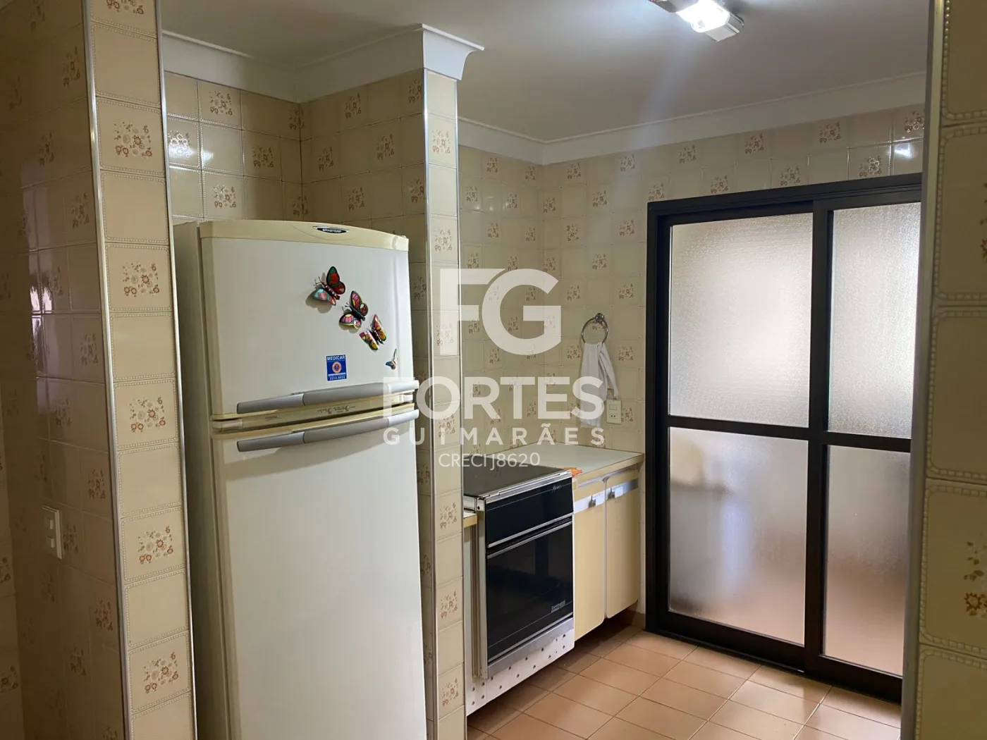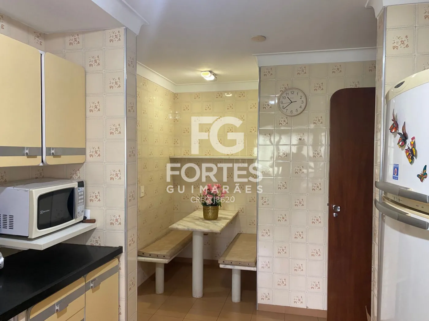 Cozinha com armários, equipada com fogão embutido (gás encanado), geladeira e micro-ondas