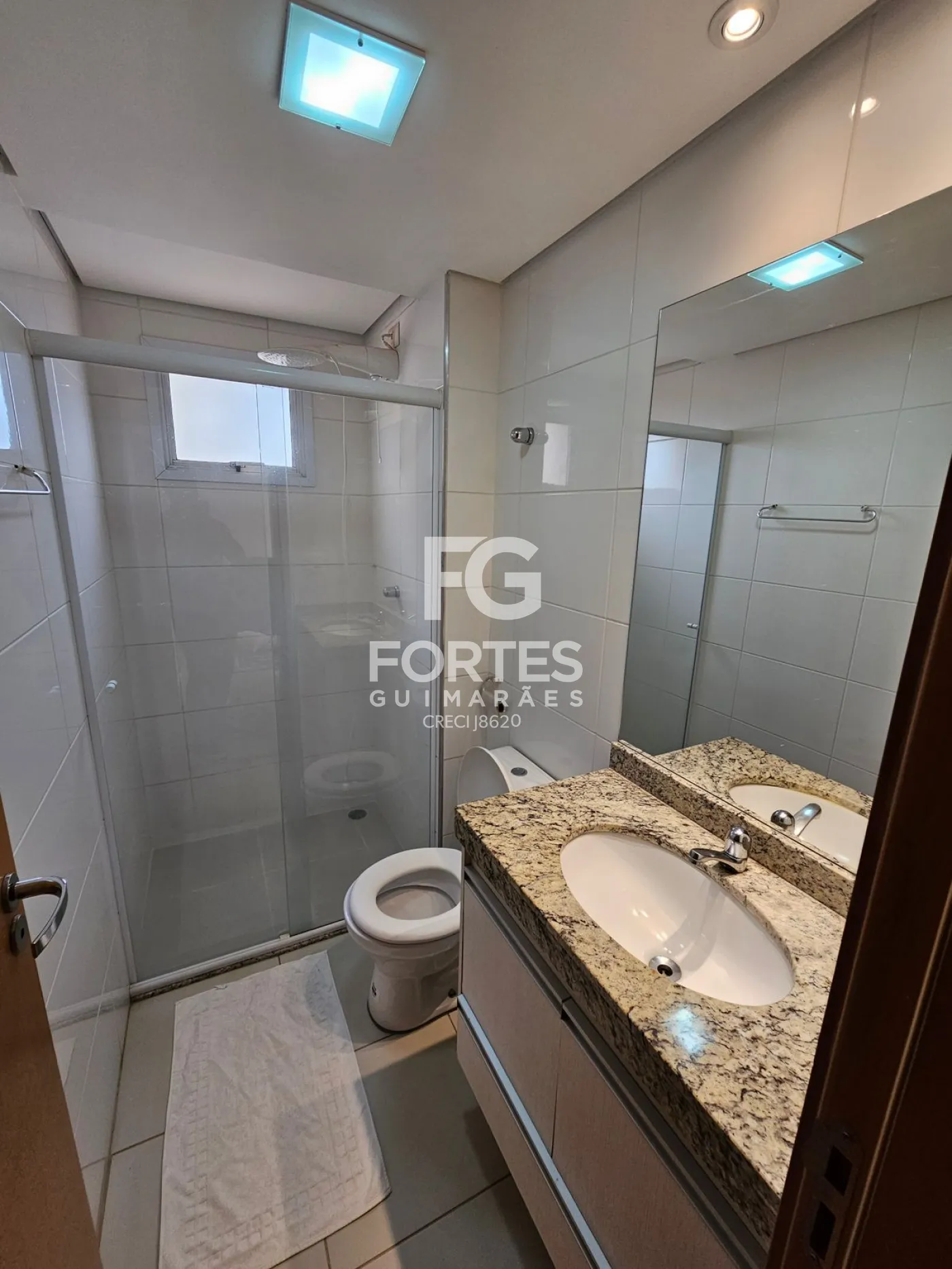 Banheiro social com armário gabinete, espelho, box em vidro e chuveiro elétrico,
