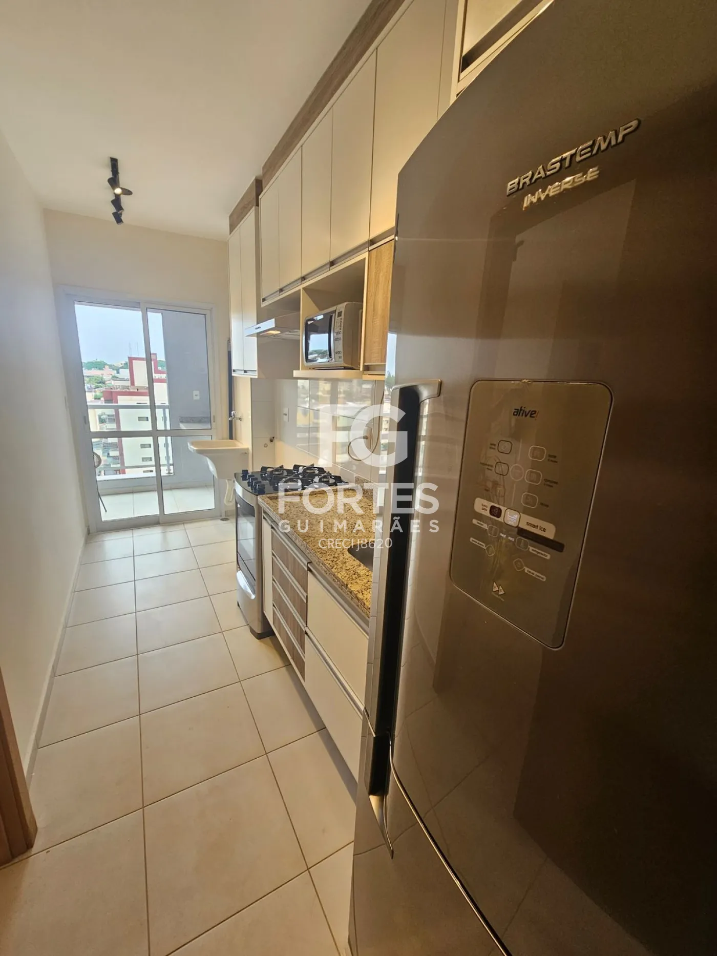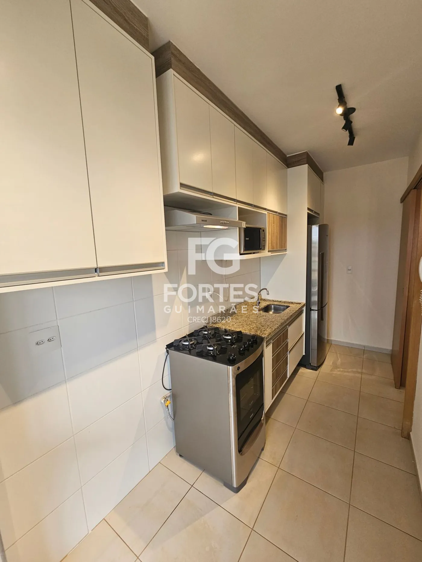 Cozinha com armários, geladeira, micro-ondas, fogão e suggar,