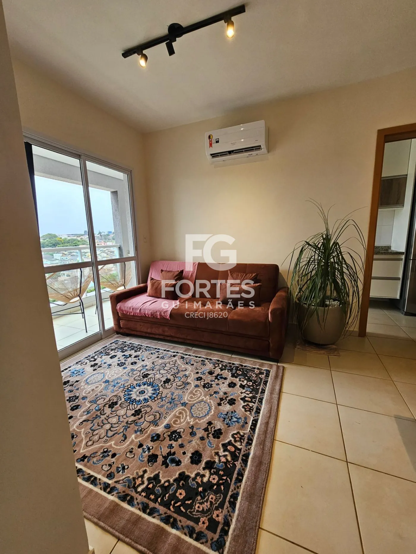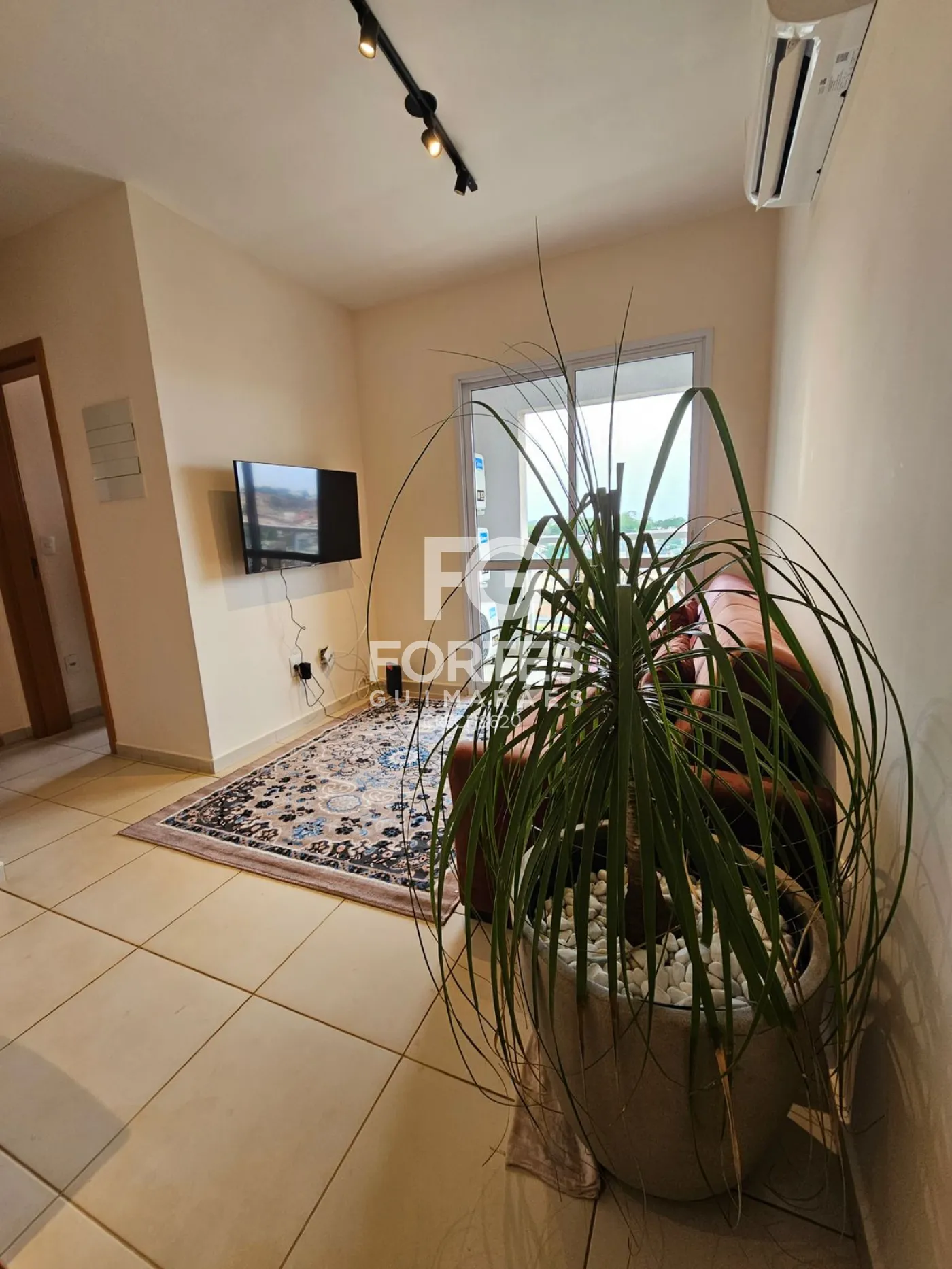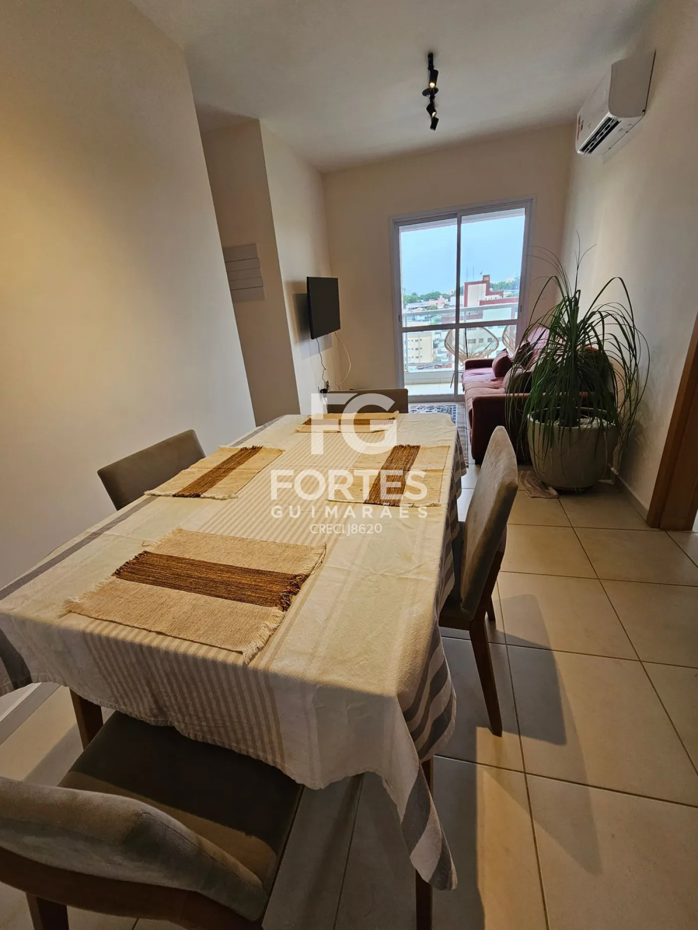 Sala ampla 2 ambientes com ar-condicionado, sofá, televisão e mesa de jantar,