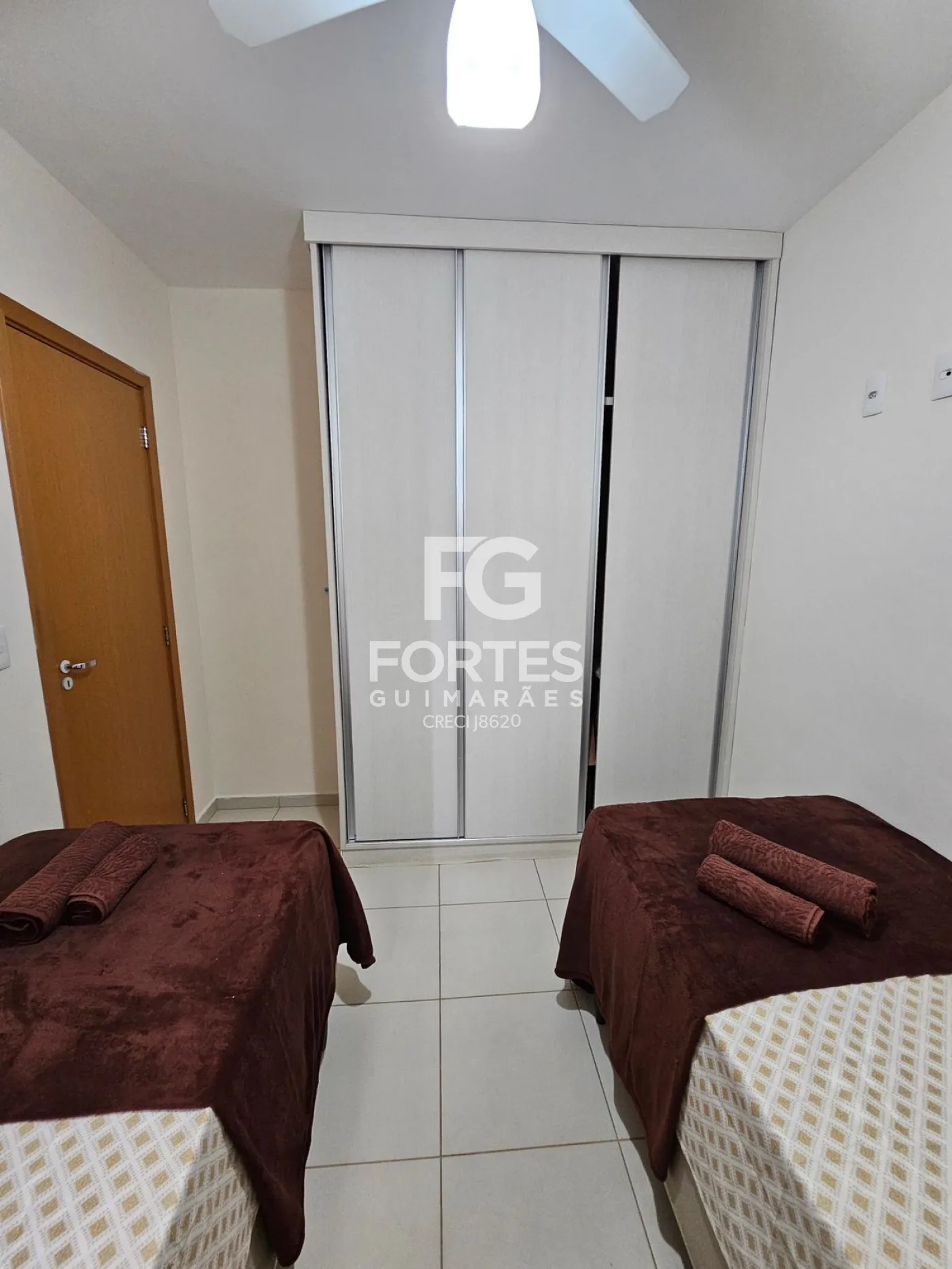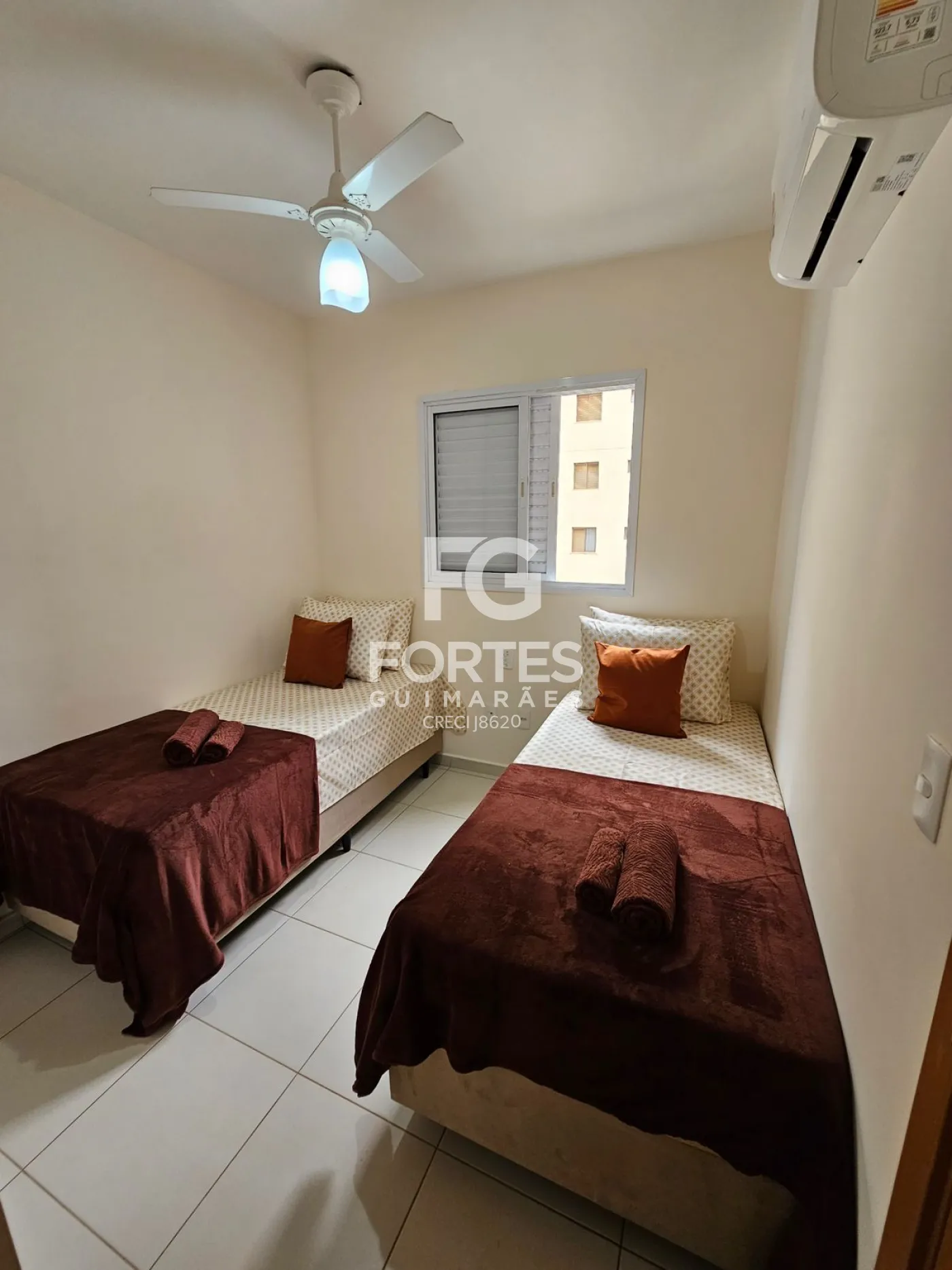2 Quartos com ares-condicionados, armários, ventiladores de teto e camas,