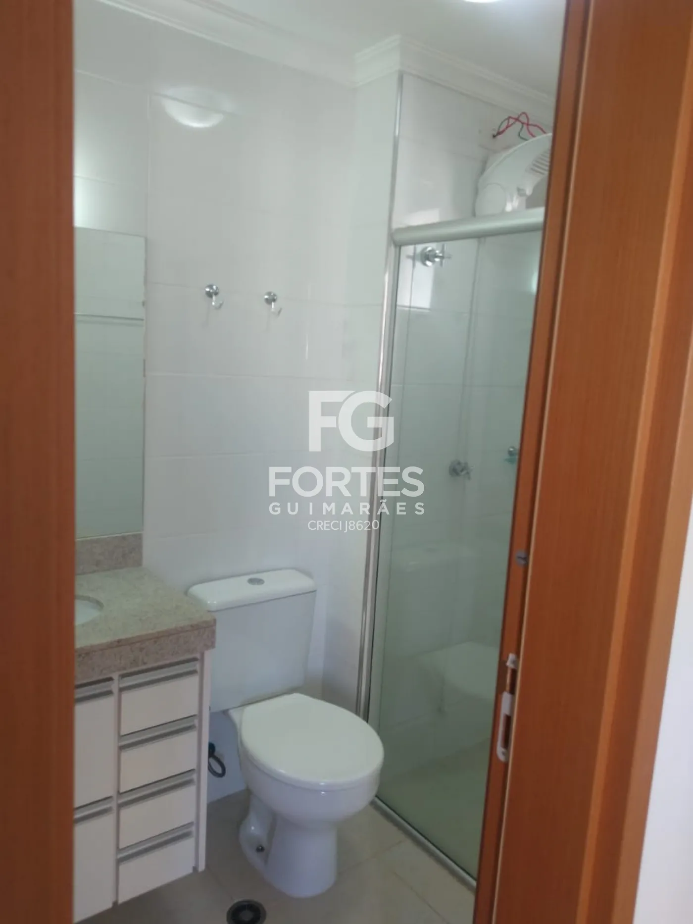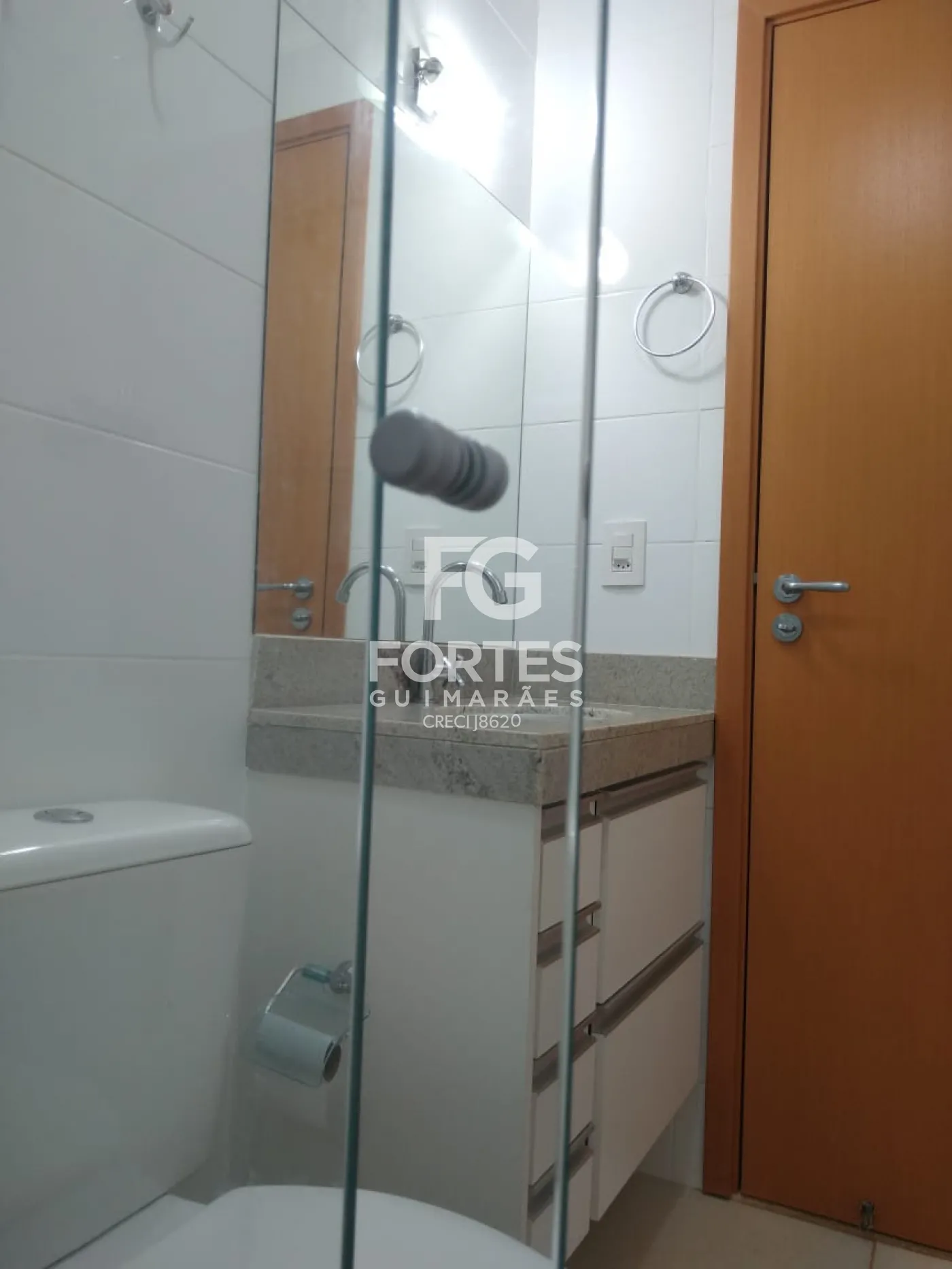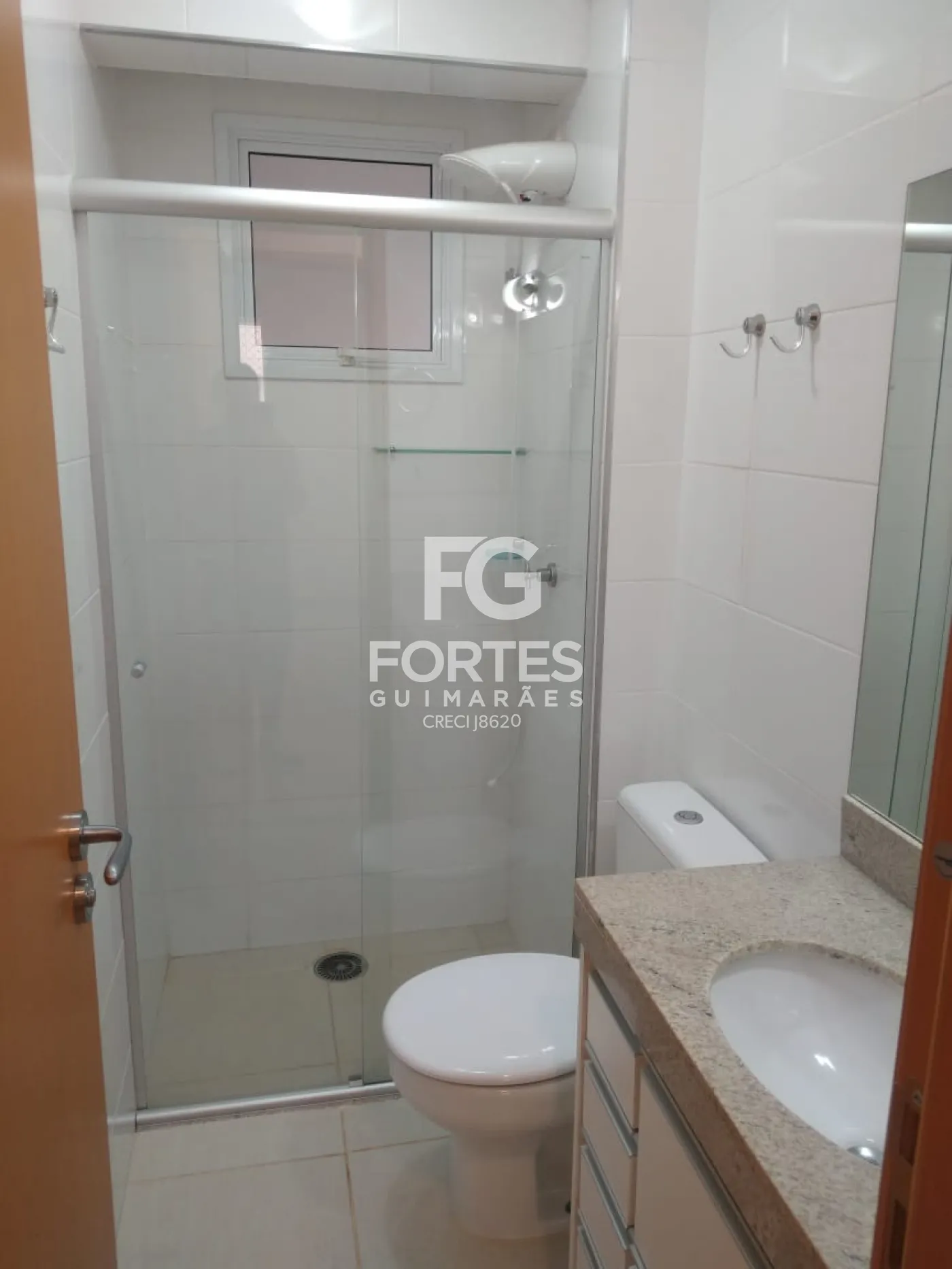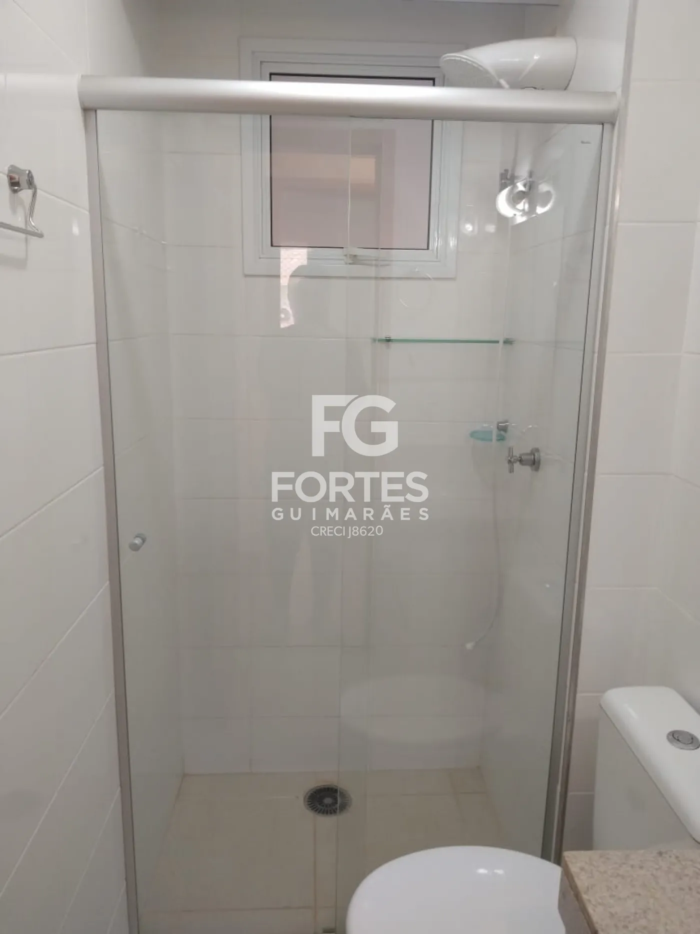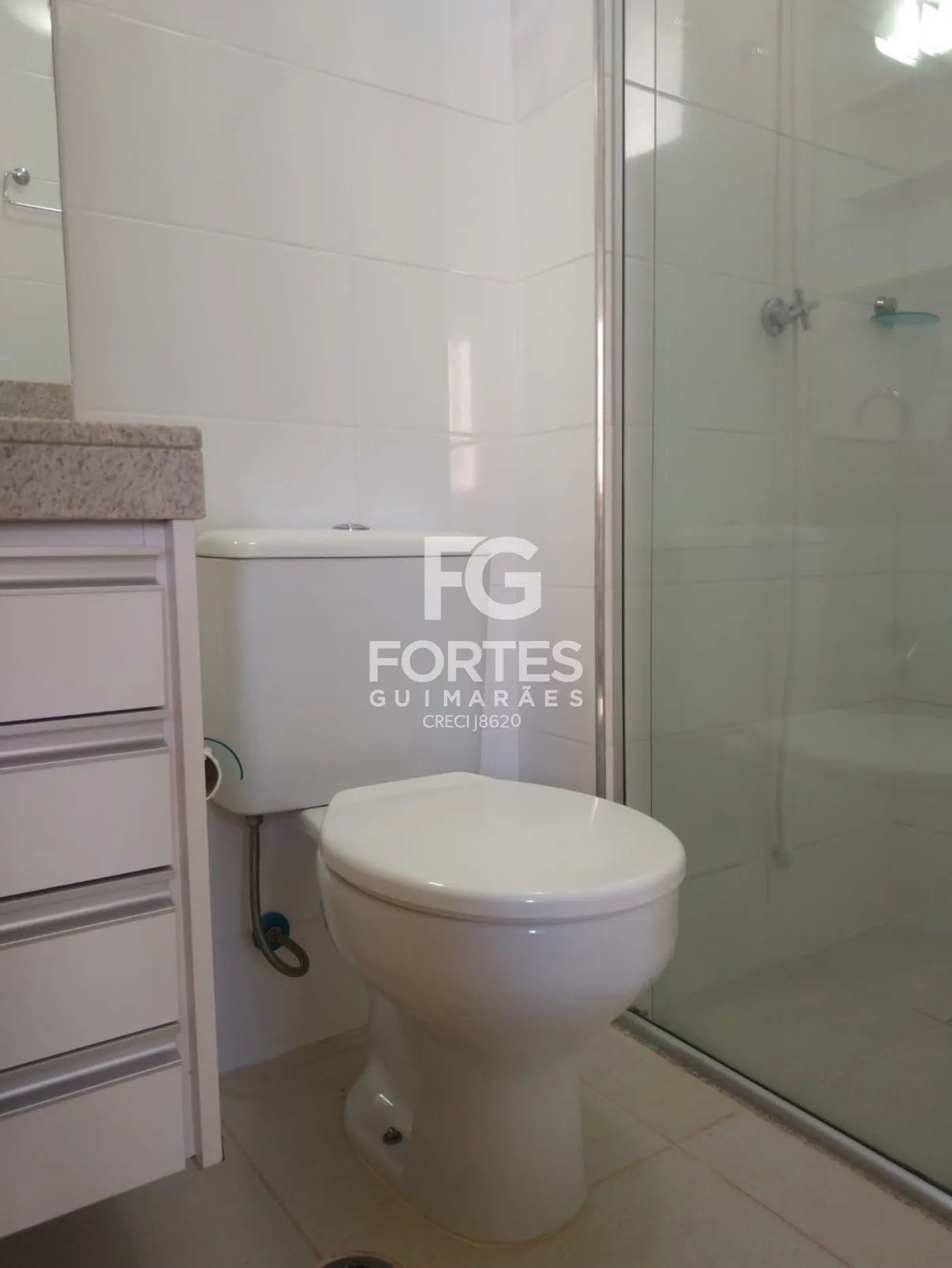 - Os armários dos banheiros com fórmica branca com prateleiras e gavetas, box de vidro incolor e chuveiro.