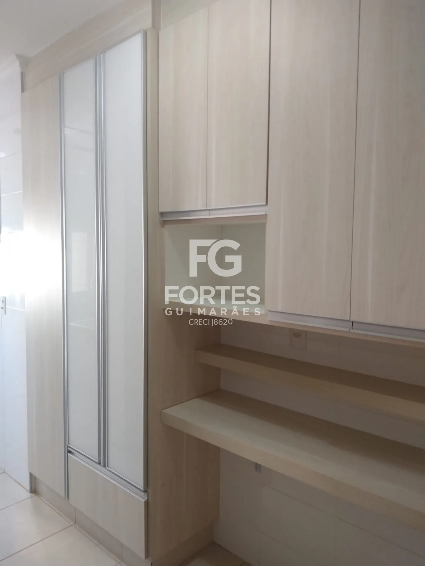 - A cozinha com armários madeirado e fórmica branca na parte interna, com alguma prateleiras móveis e algumas portas de vidro.