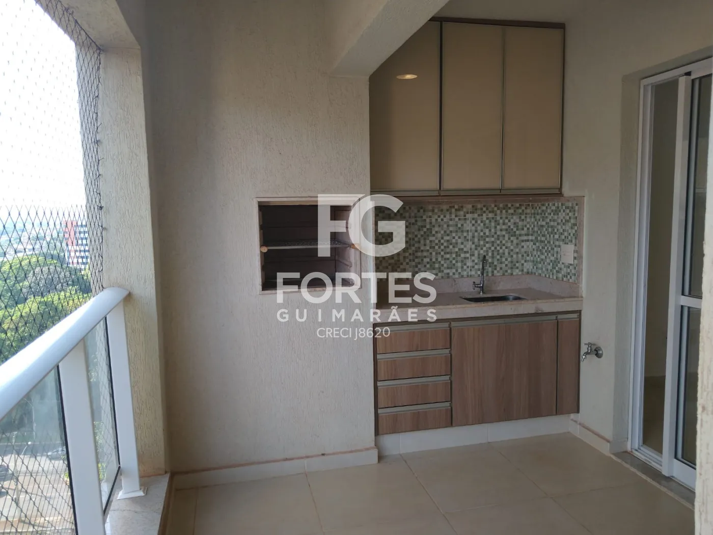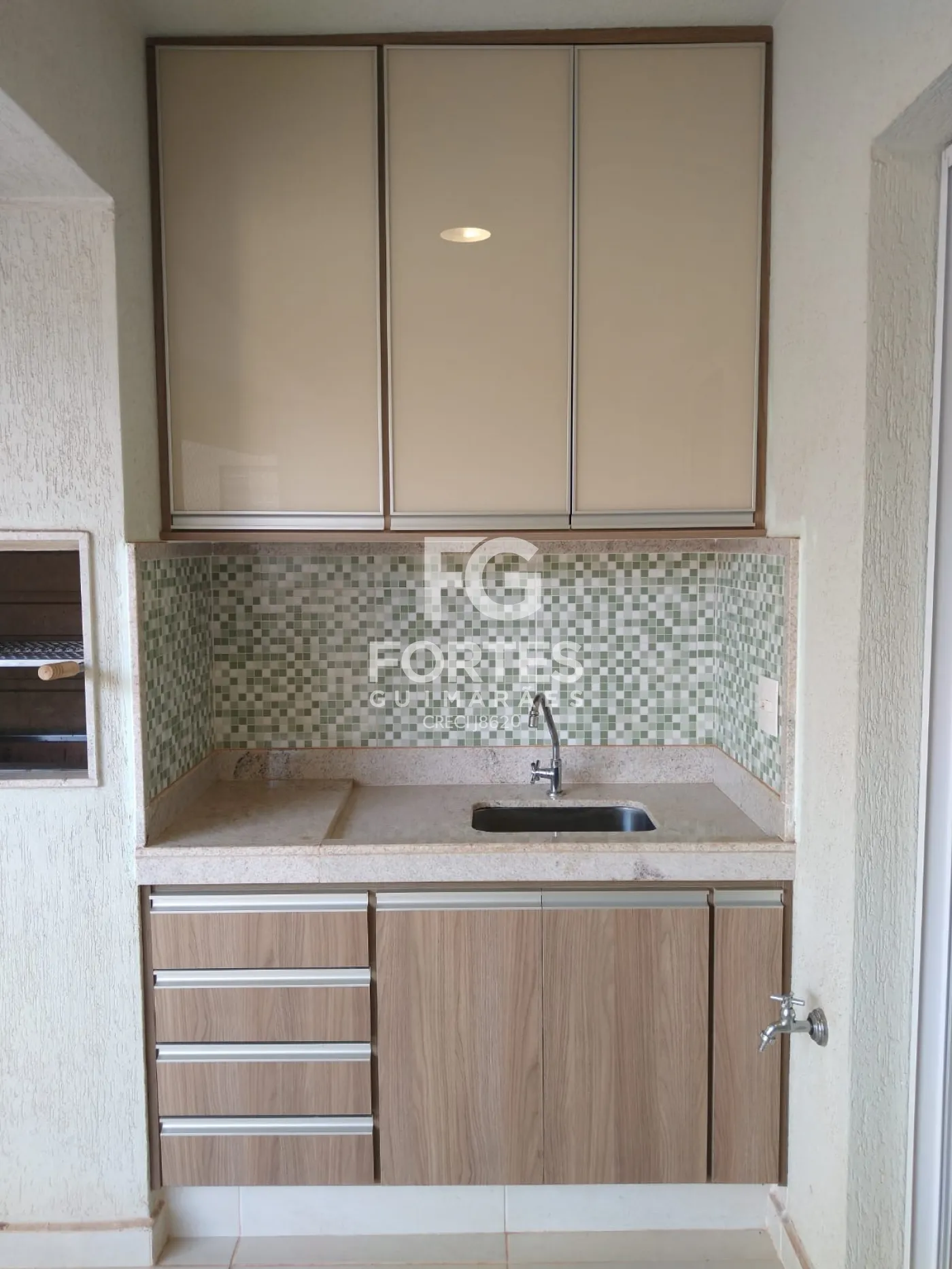 - Sacada com armário madeirado com portas e gavetas, sendo a parte superior com portas de vidro.