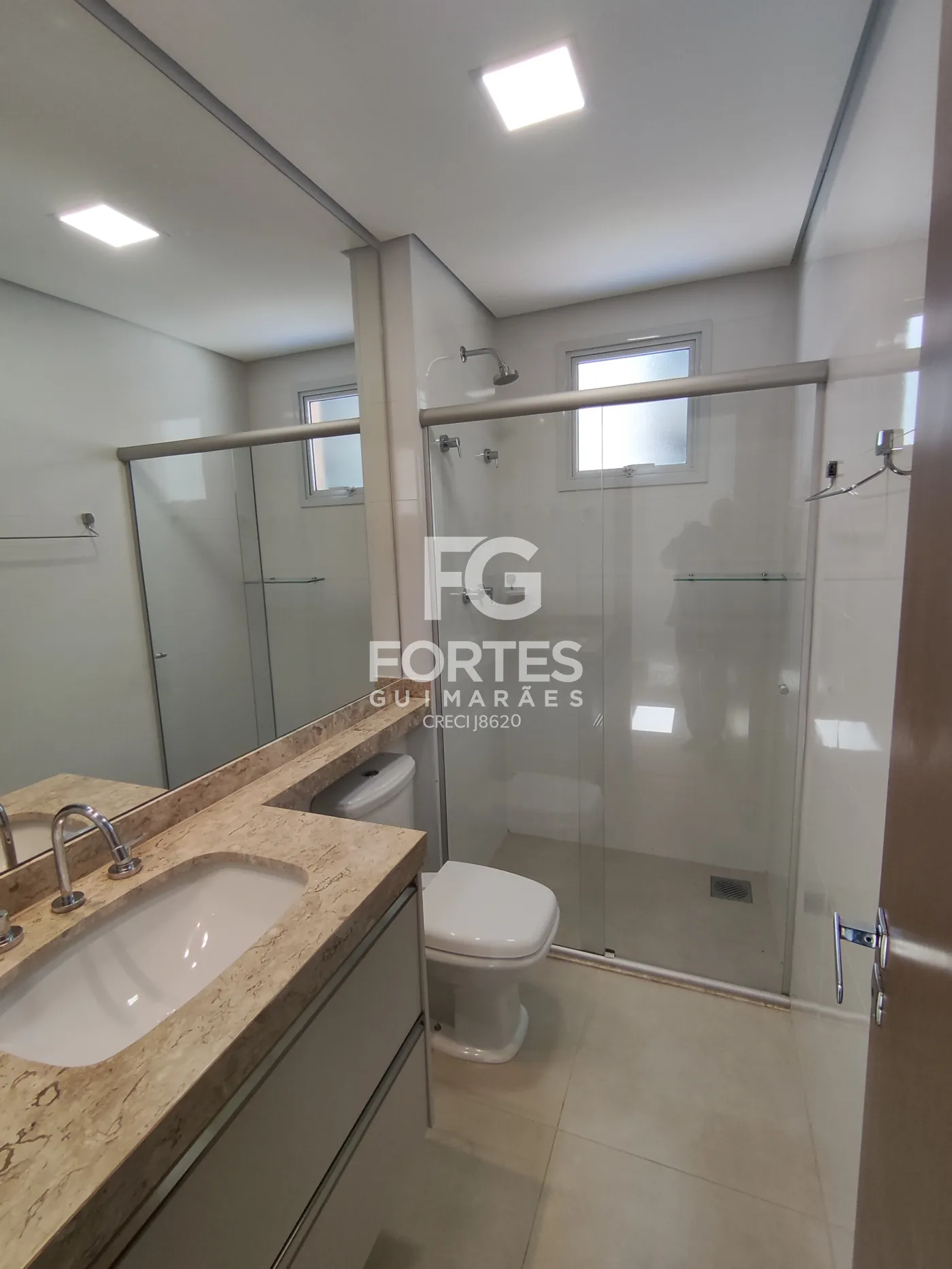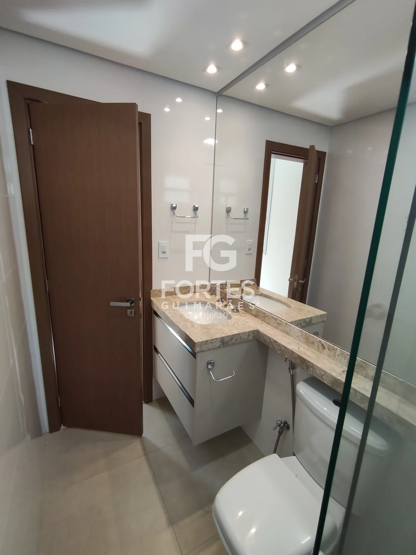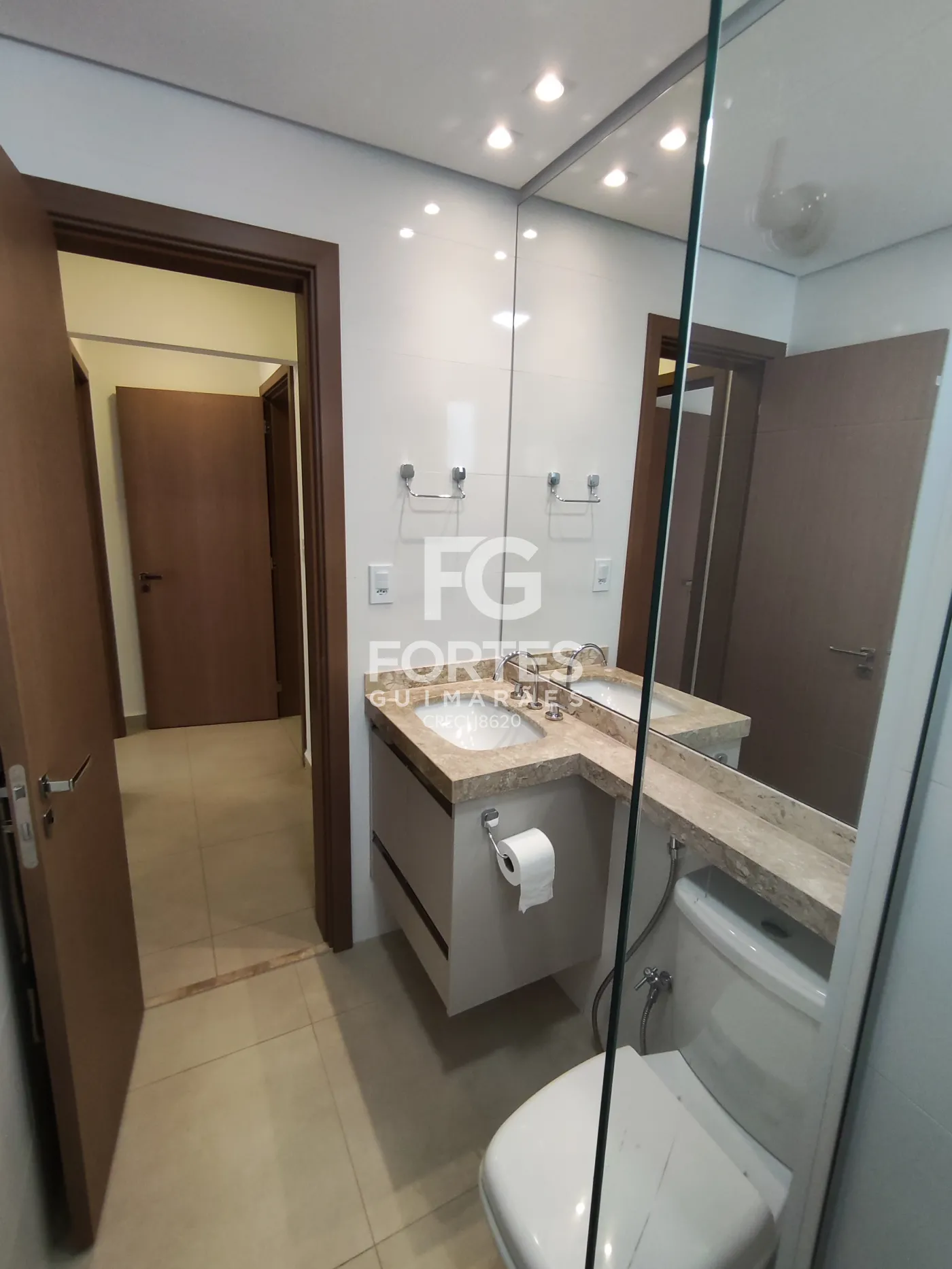 - Banheiro social com gabinetes, espelhos, box em vidro,