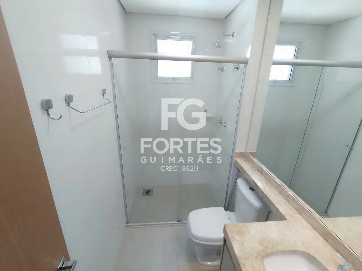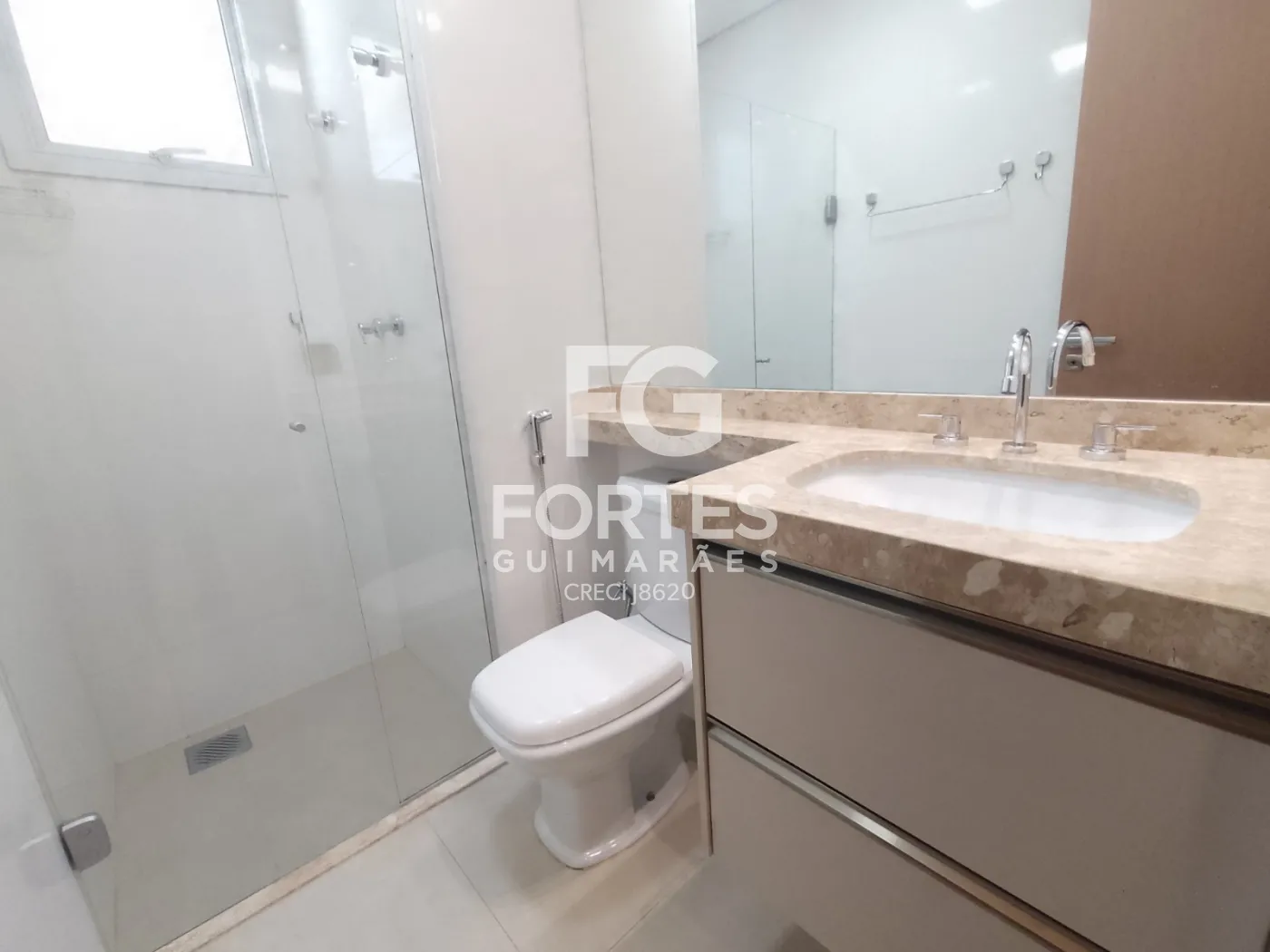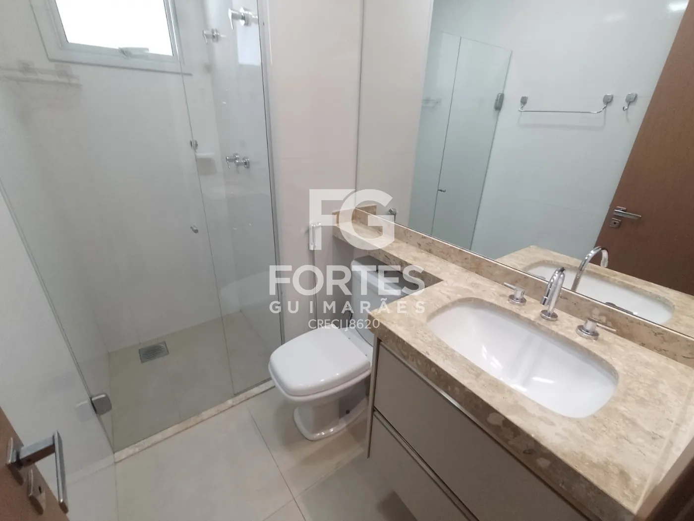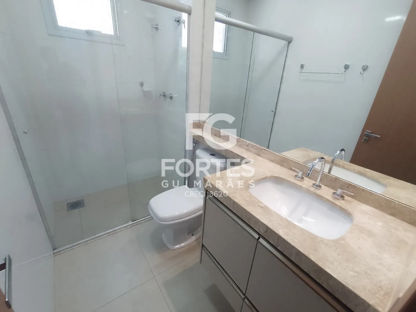 - Banheiro social com gabinetes, espelhos, box em vidro,