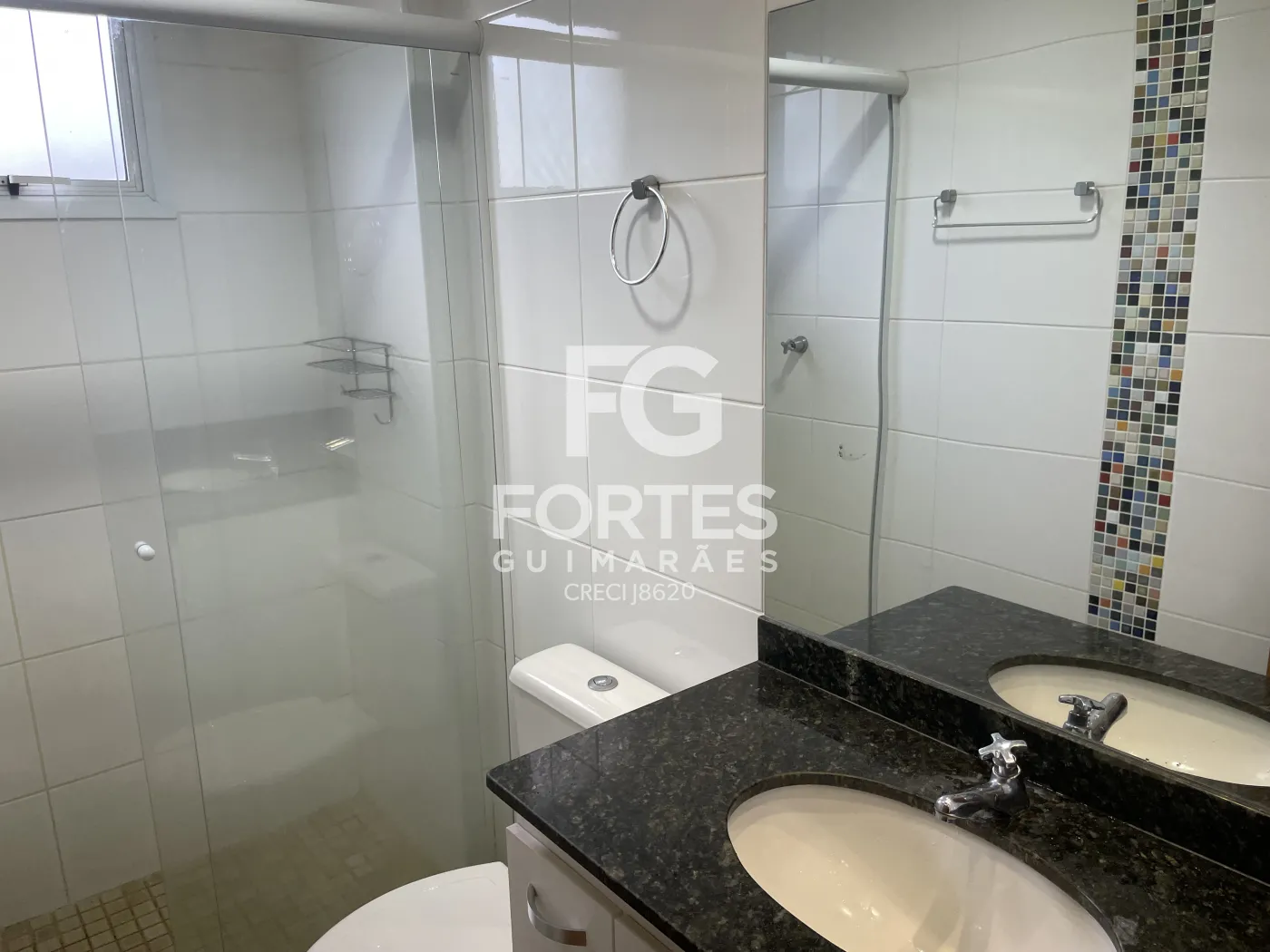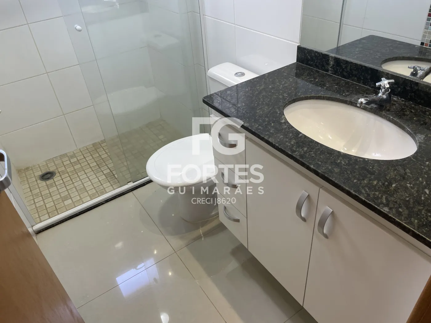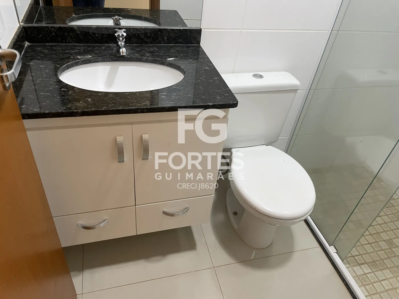 - Banheiros social e suíte com espelho, box de vidro, chuveiro e pia com gabinete