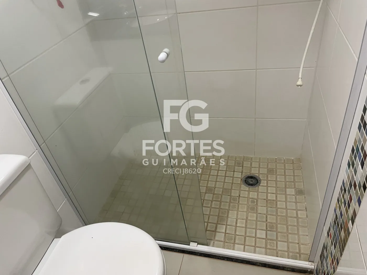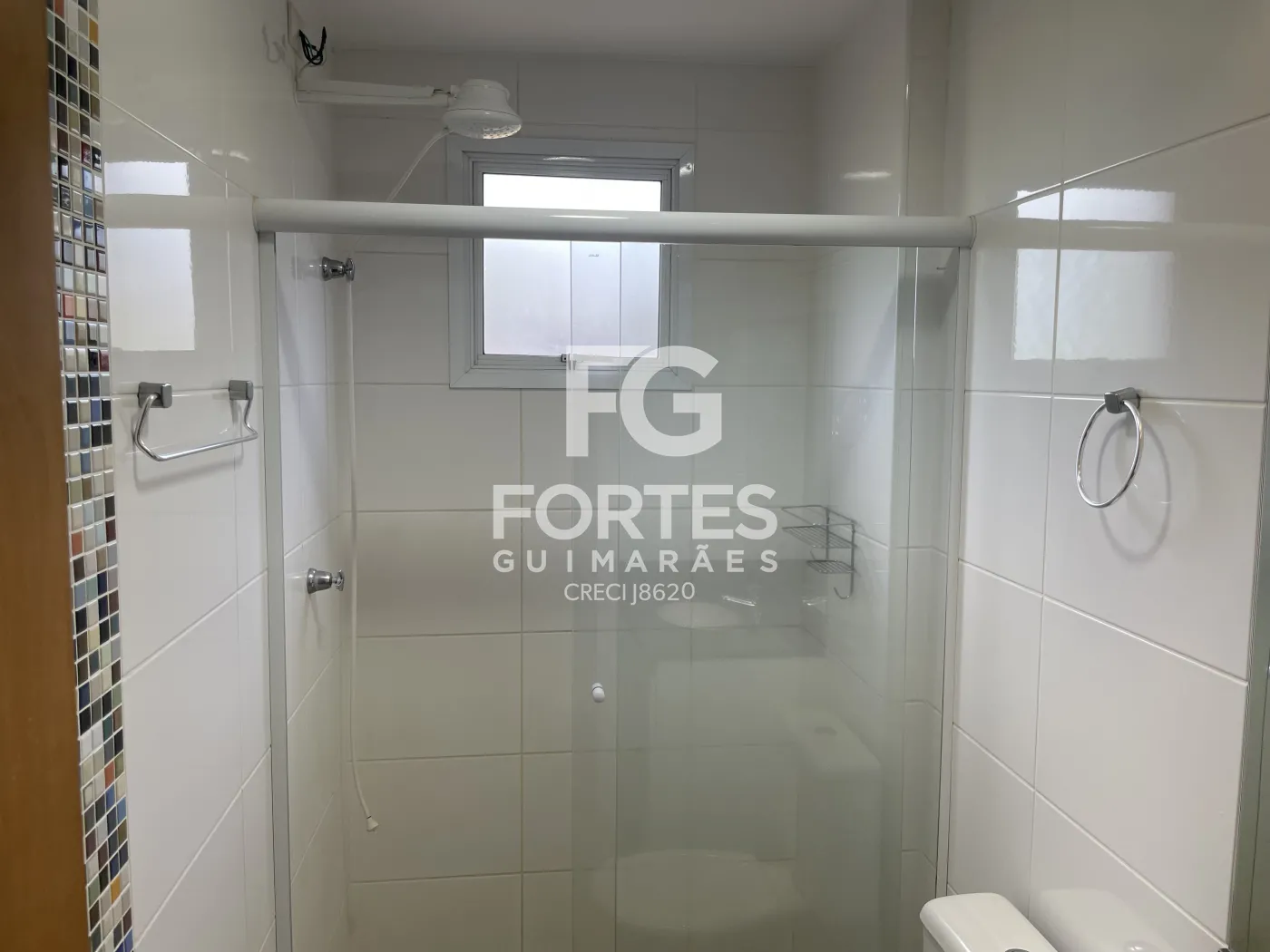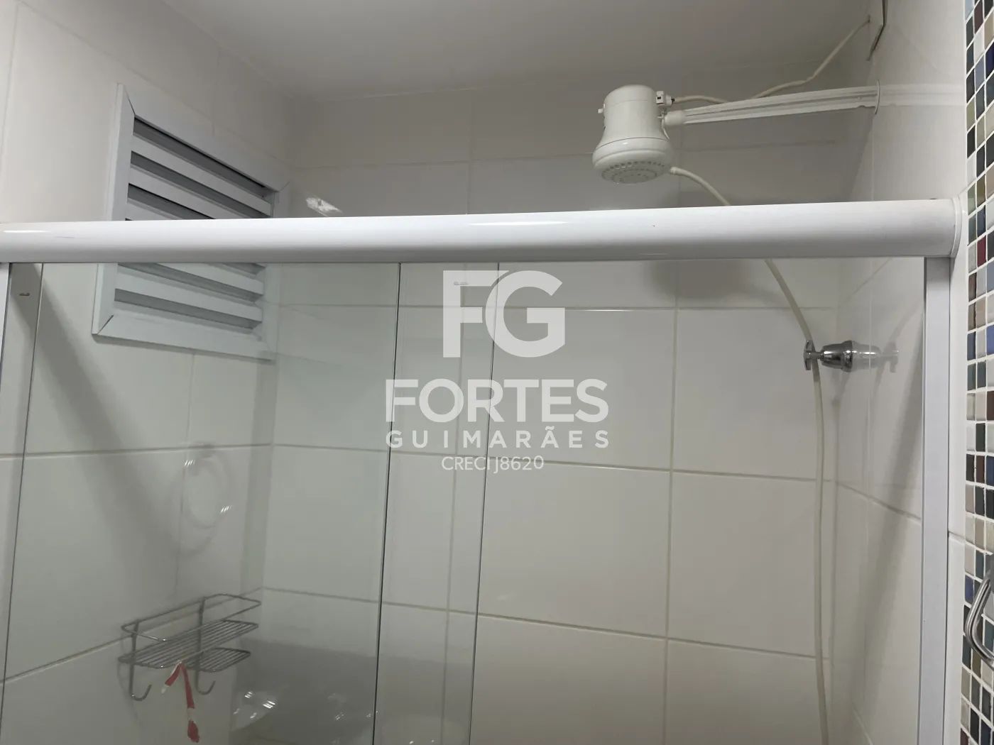 - Banheiros social e suíte com espelho, box de vidro, chuveiro e pia com gabinete
