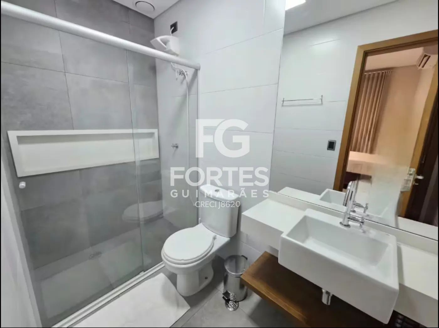 - Banheiro da suíte com prateleira em baixo da pia, espelho, box de vidro e chuveiro