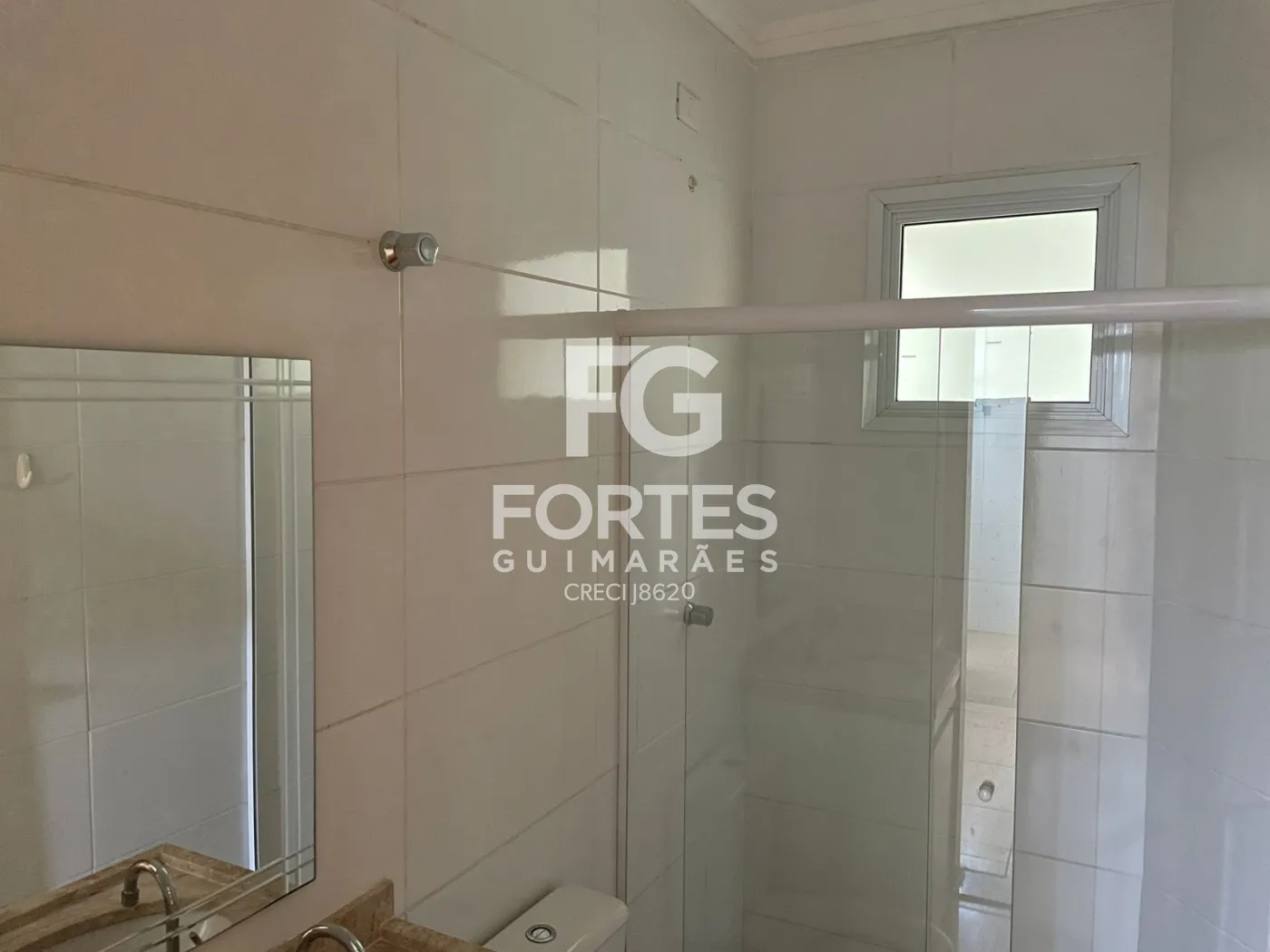 Banheiro da suite com armário gabinete e box em vidro,
