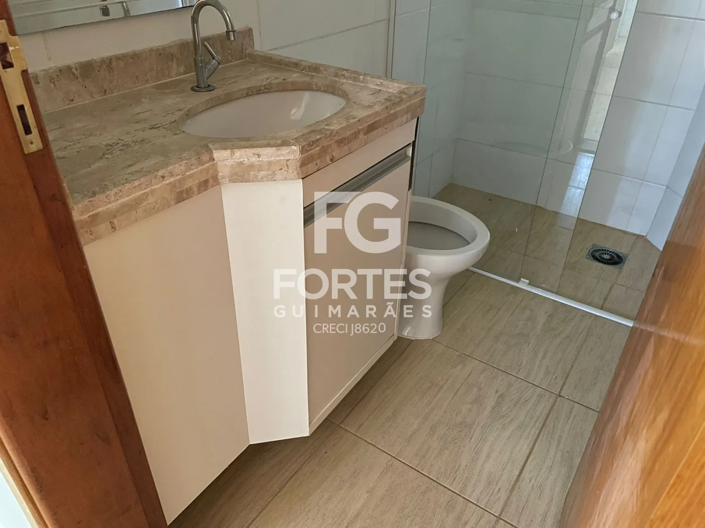 Banheiro social com armário gabinete, espelho e box em vidro,