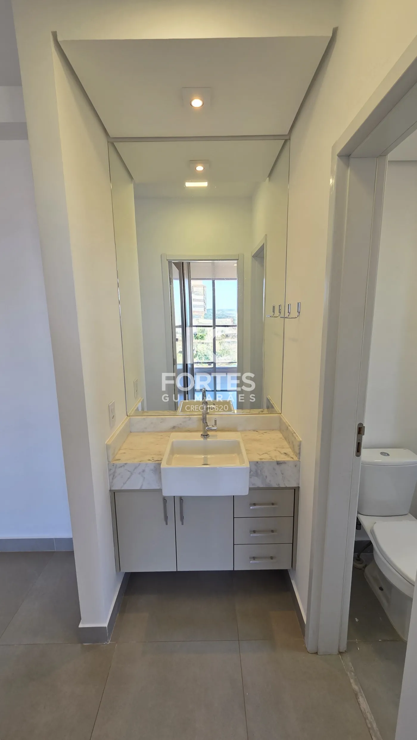 - Banheiro social com gabinete, espelho e box em vidro
