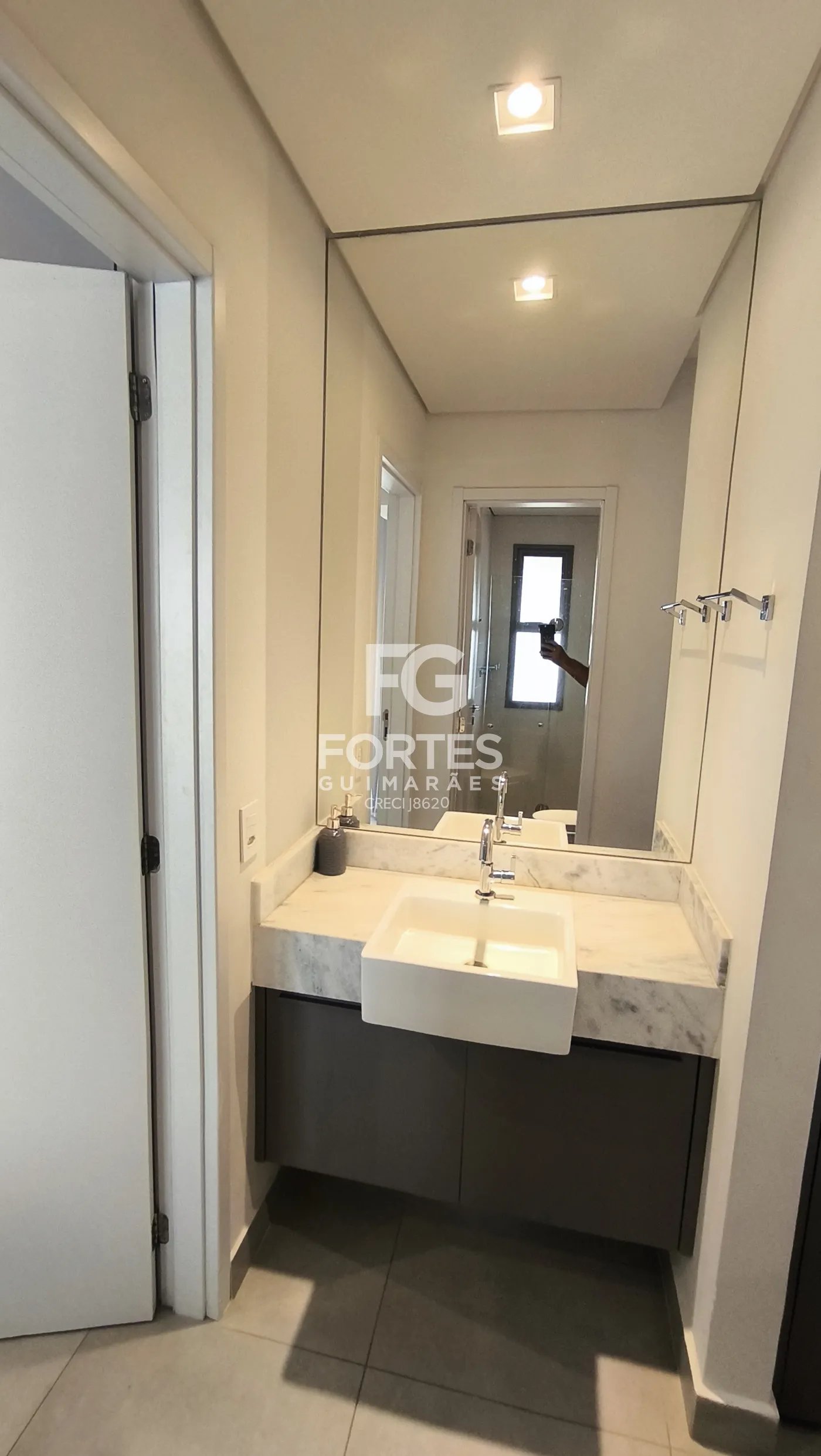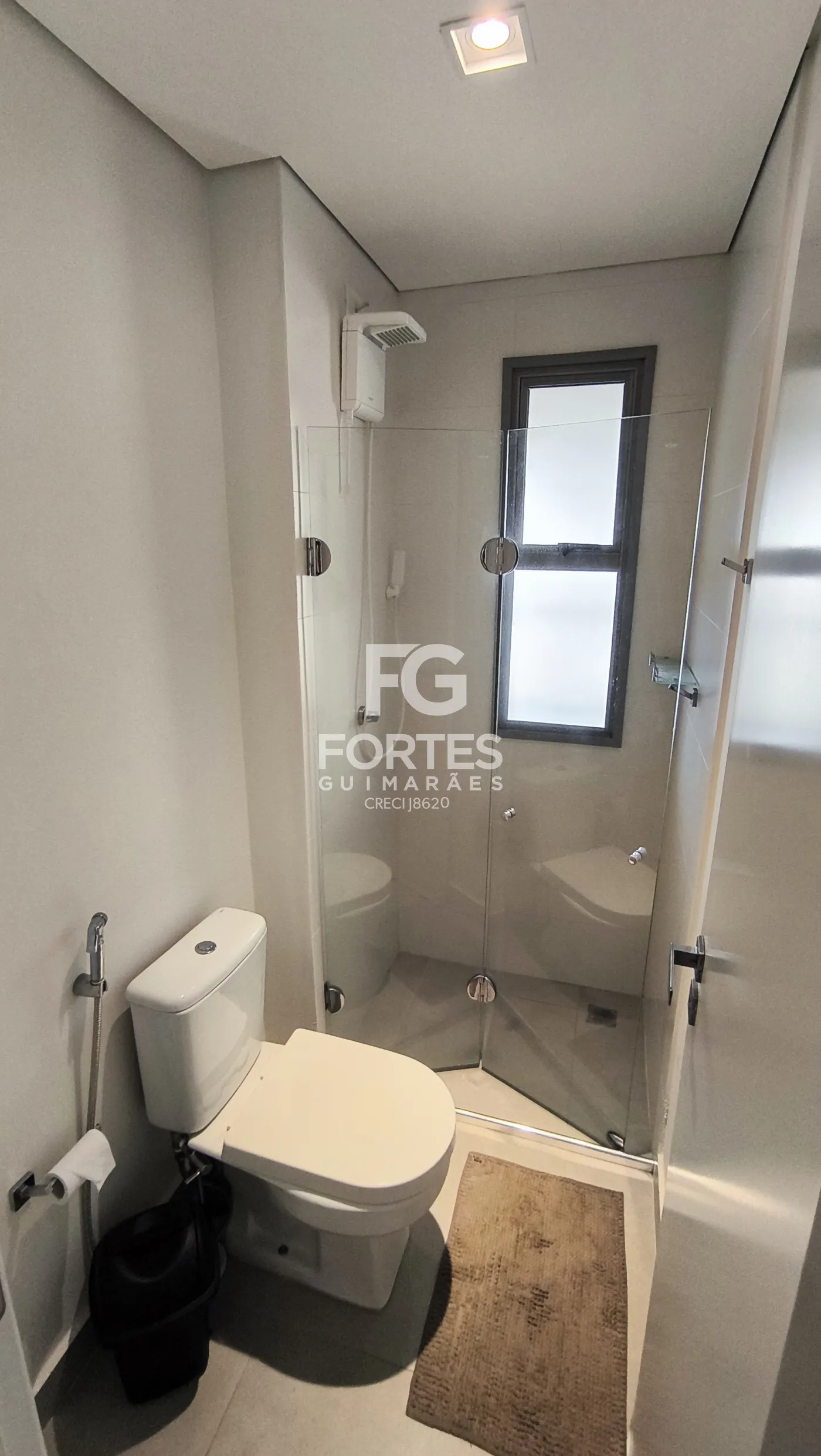 - 1 banheiro social com gabinete, espelho e box em vidro