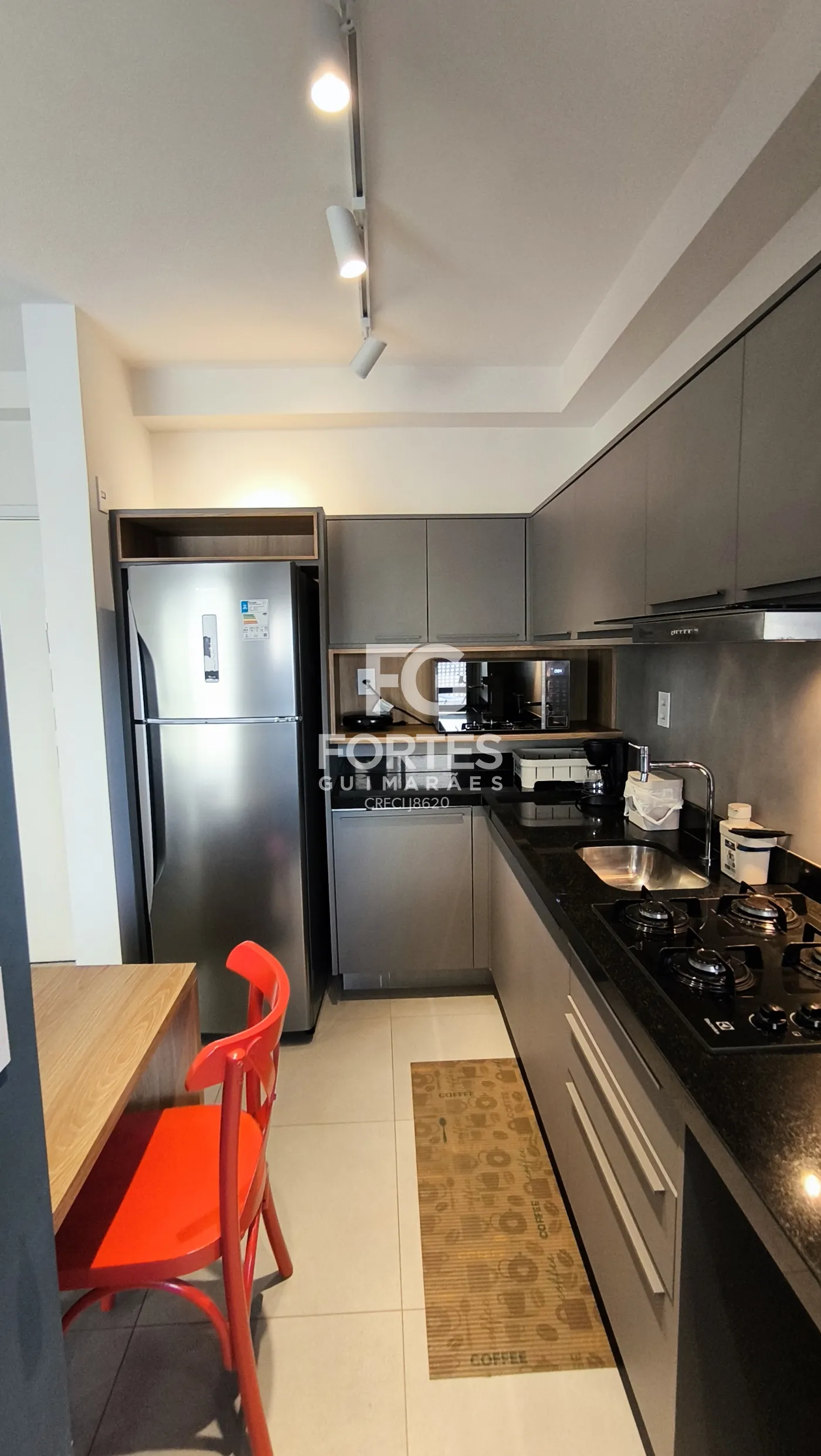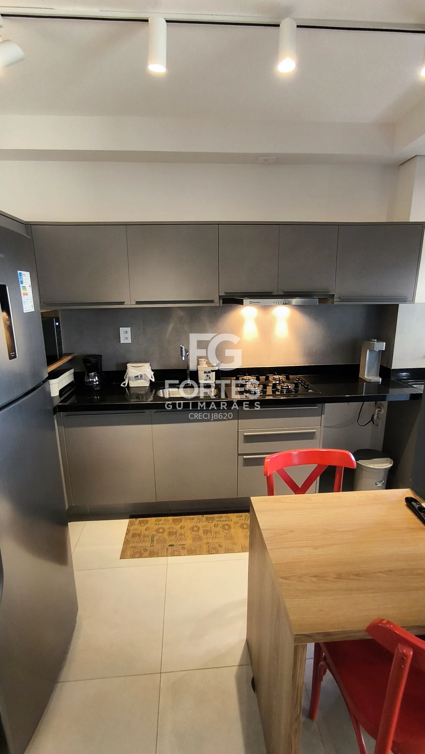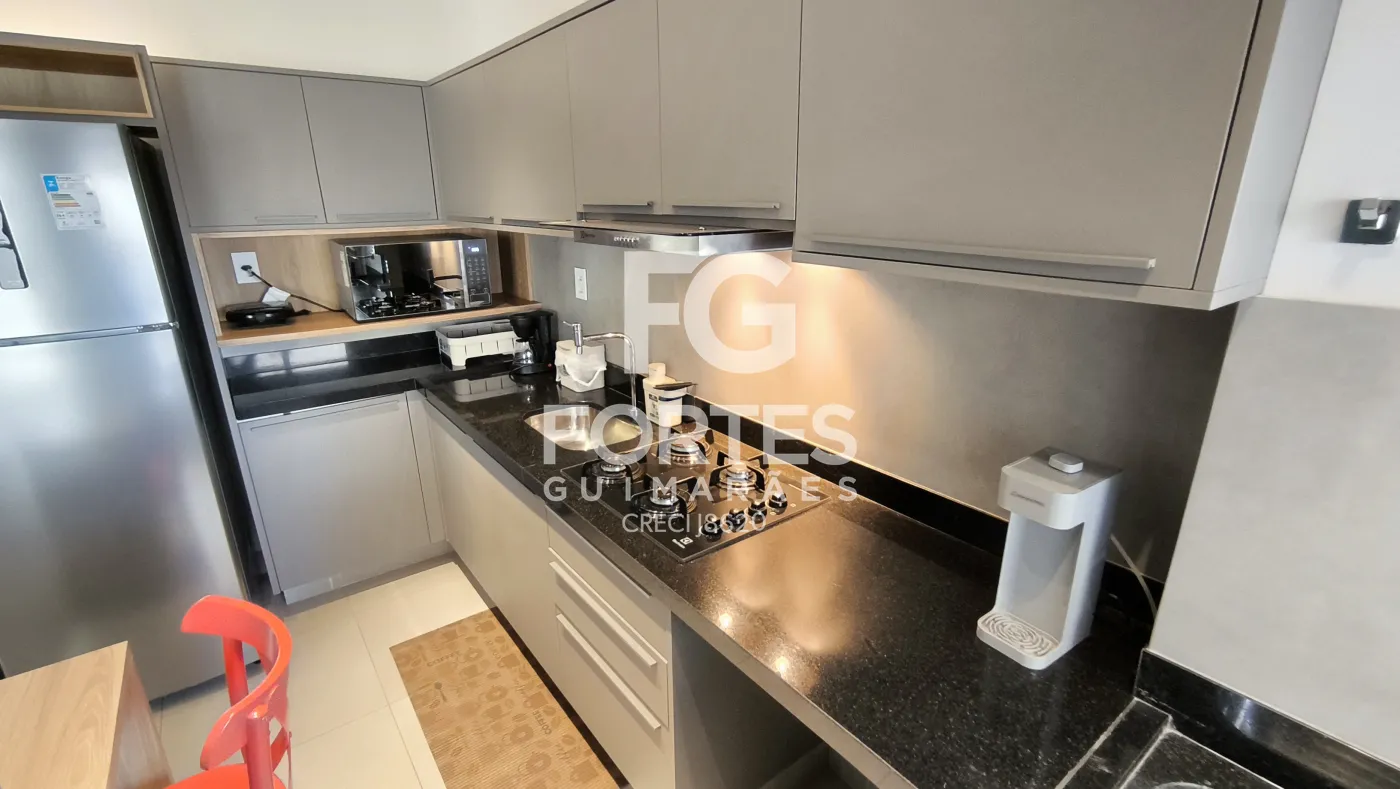 - cozinha tipo americana, planejada, com fogão cooktop e depurador de ar