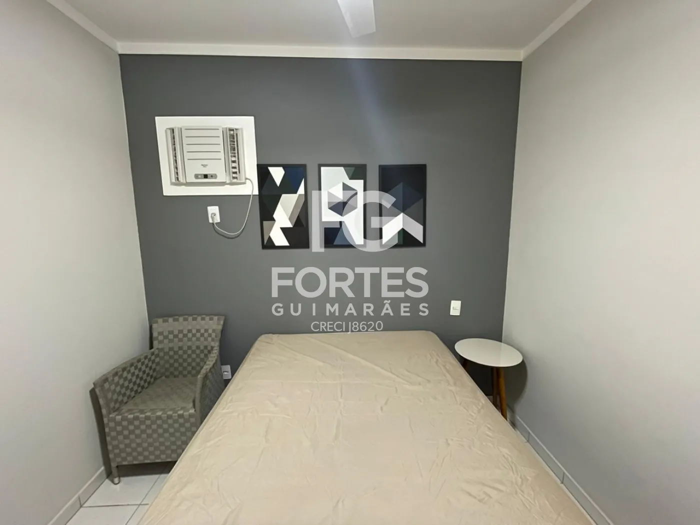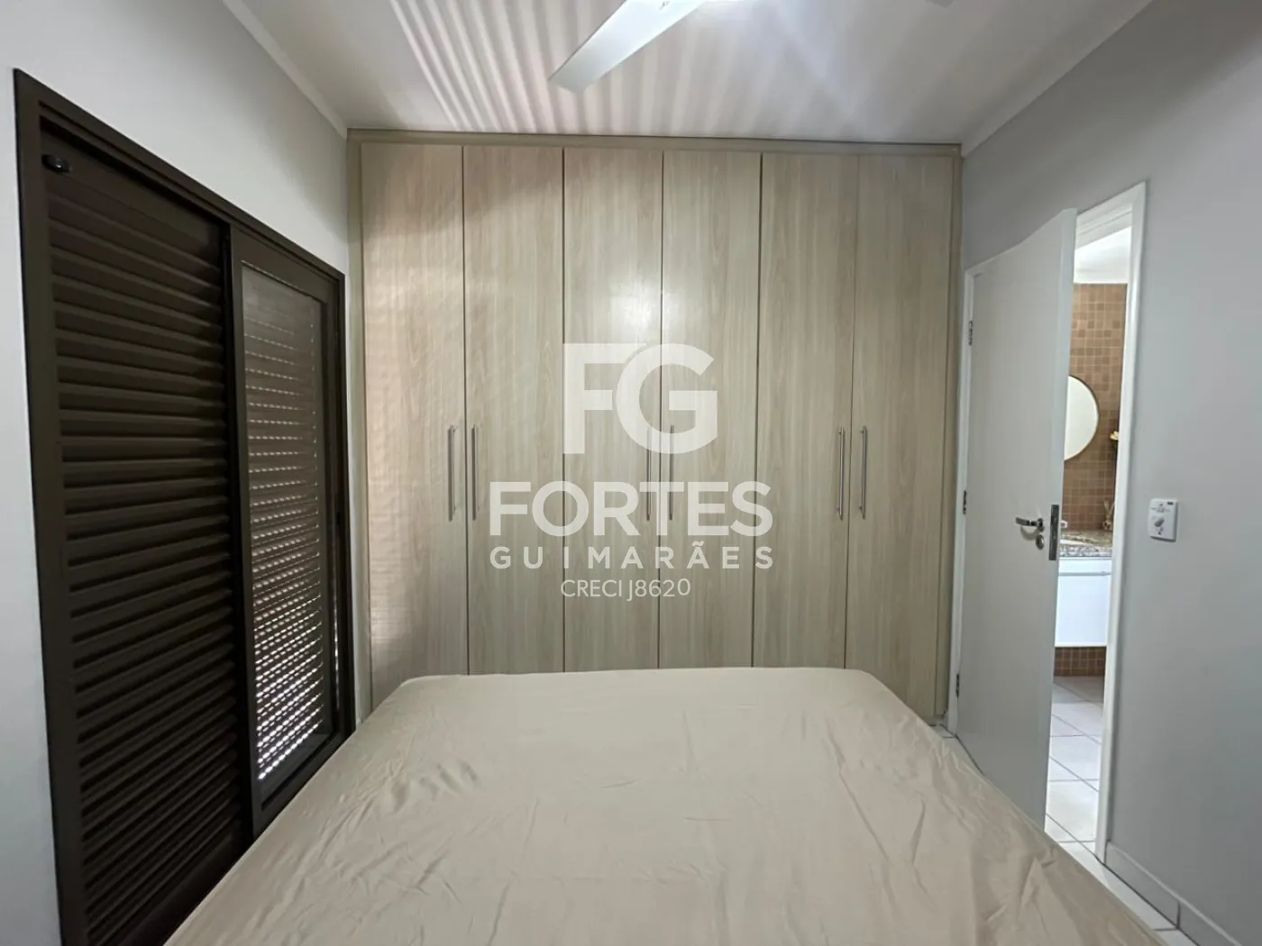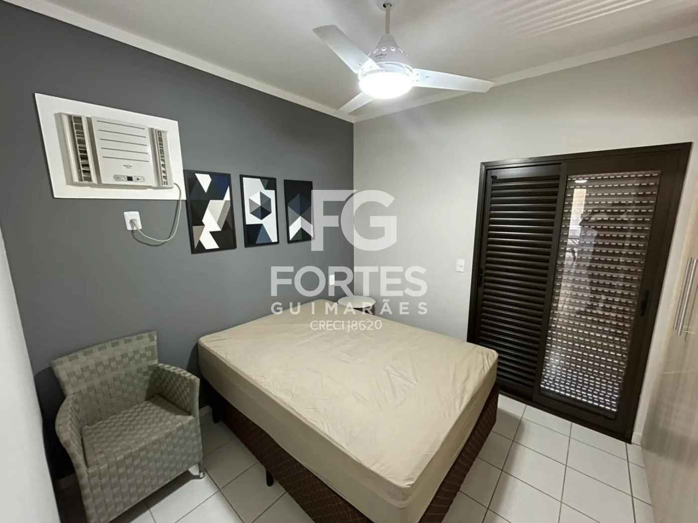 Quarto com armário, ar condicionado, ventilador de teto, cama e sacada,