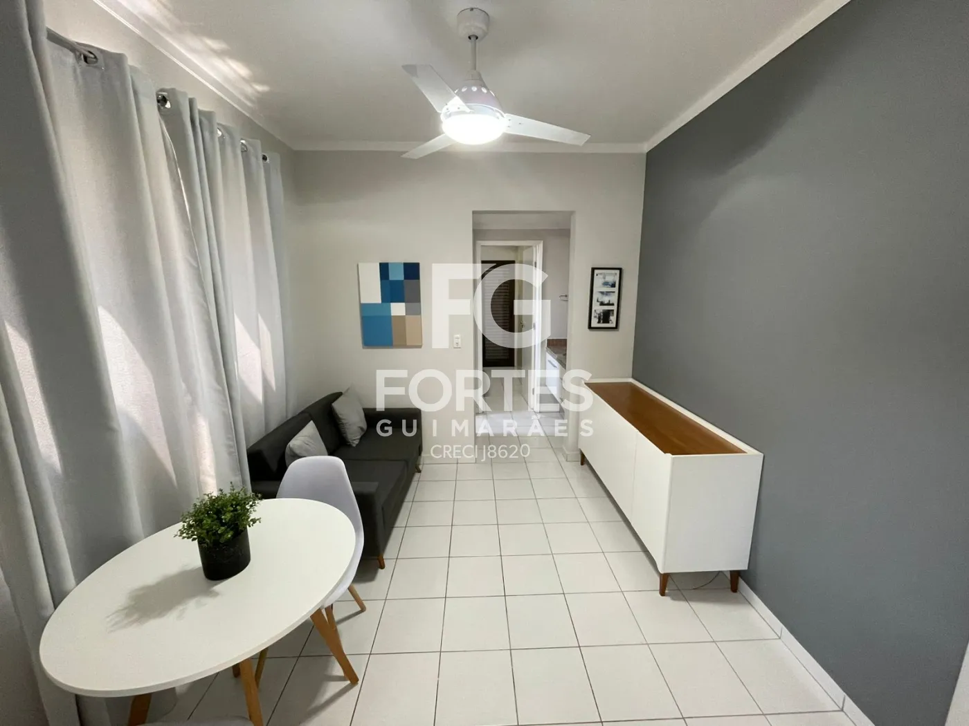 Sala com ventilador de teto, sofá, rack e mesa de jantar,