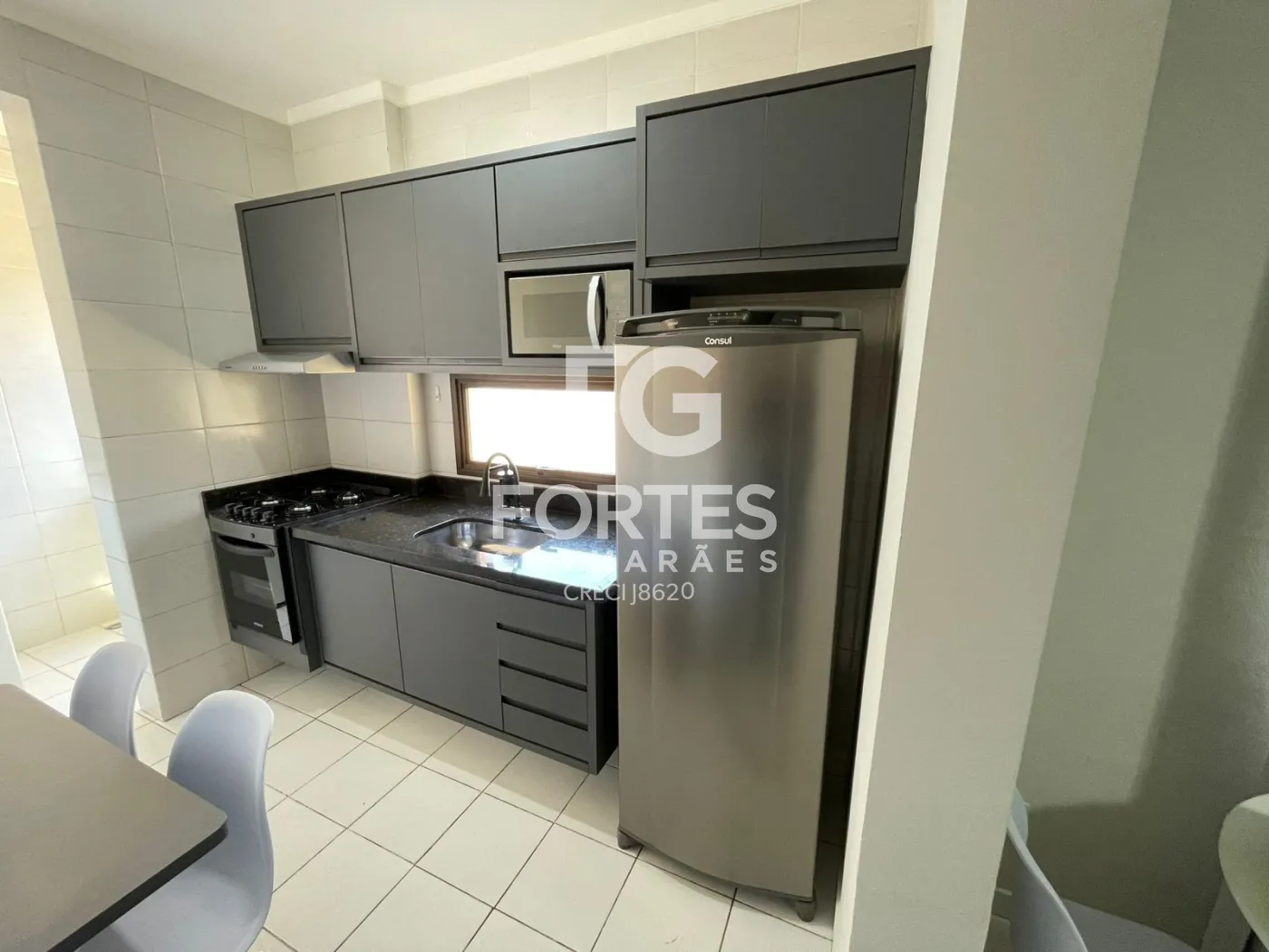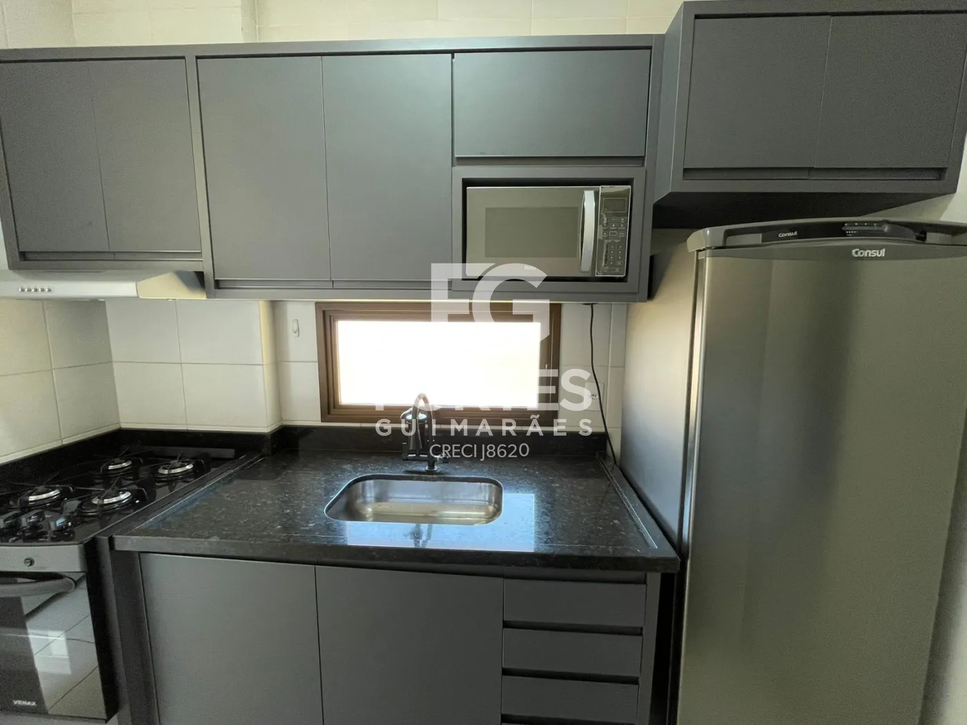 Cozinha planejada com armários, geladeira, microondas, fogão e suggar,