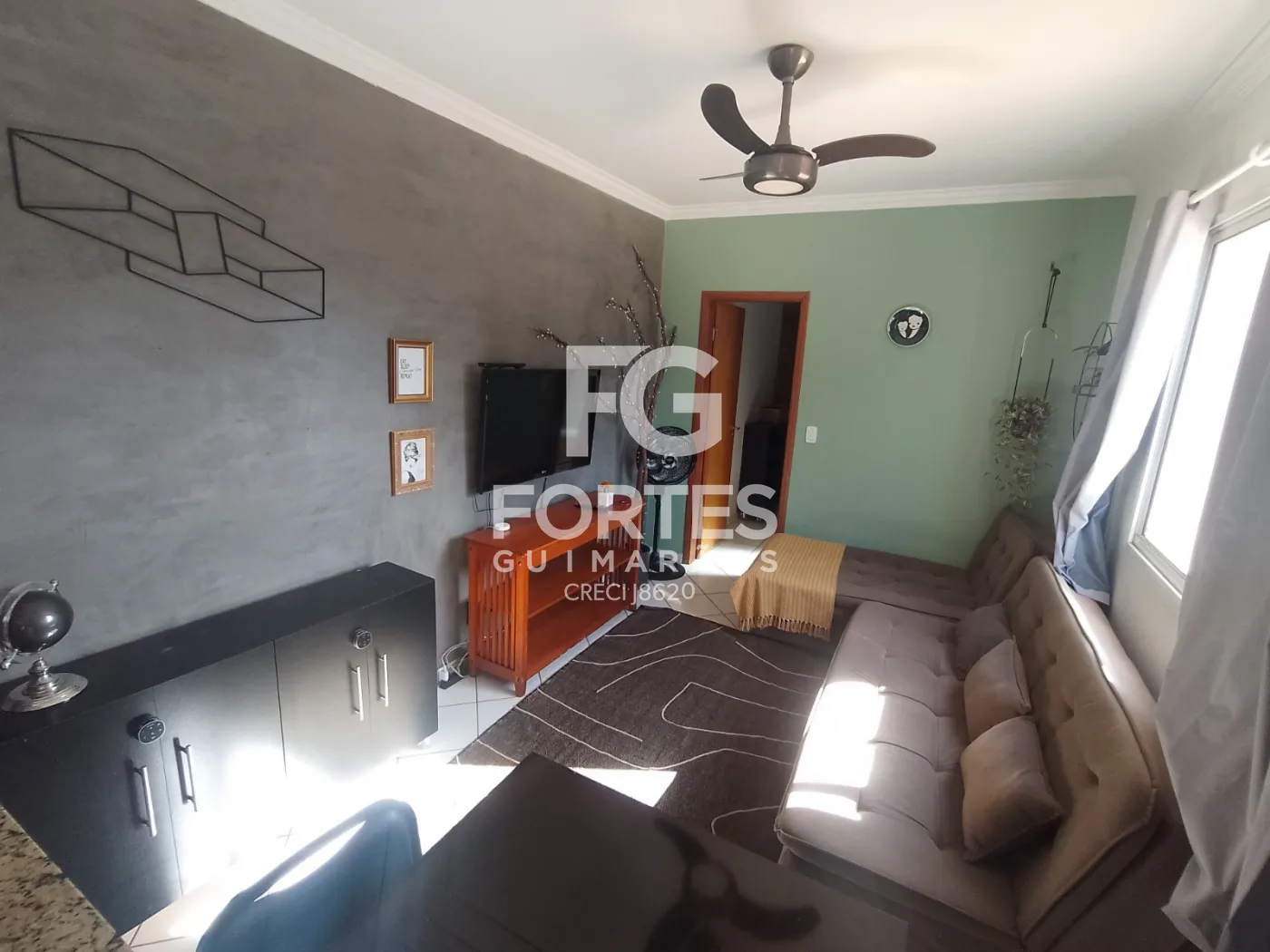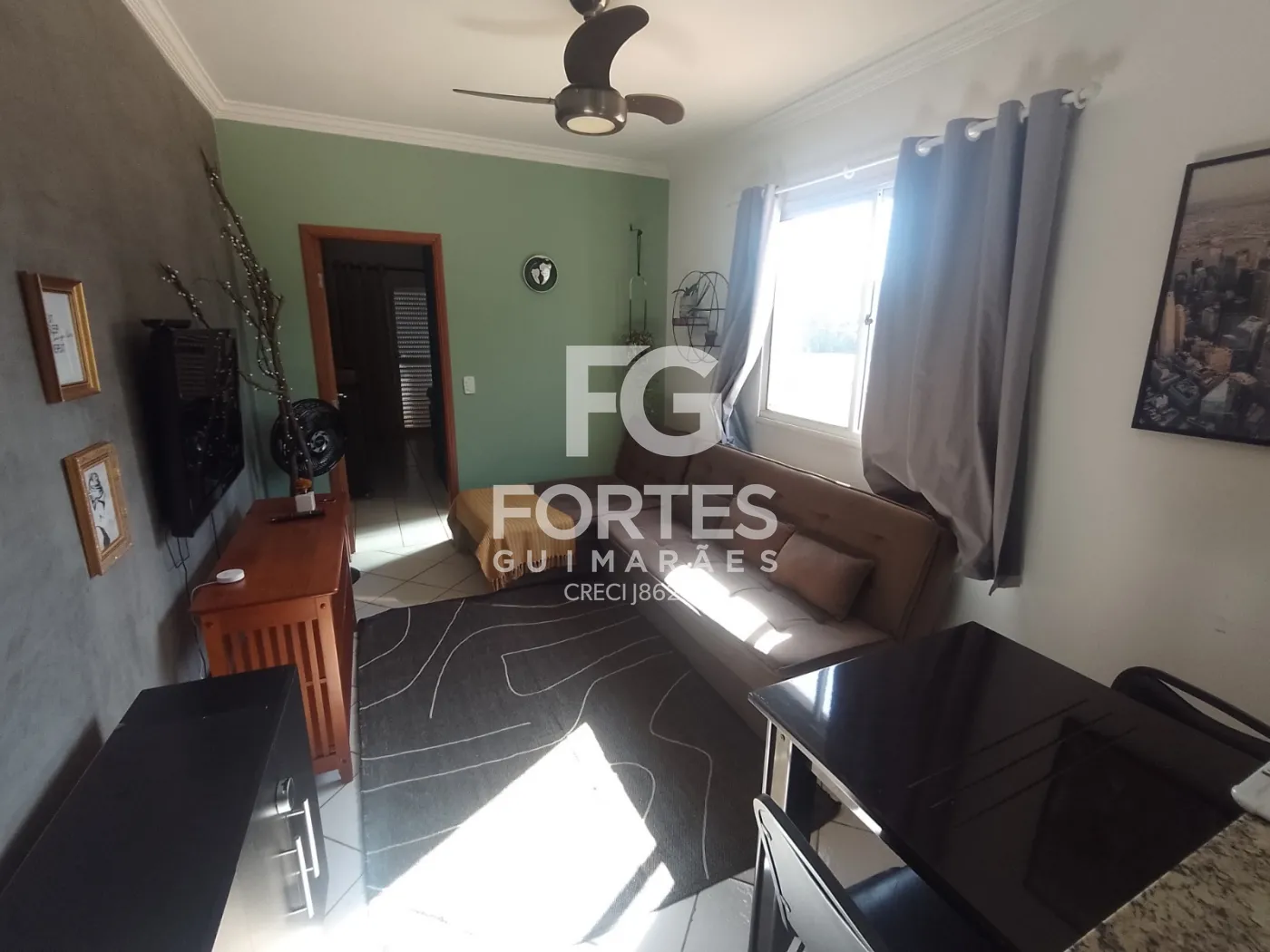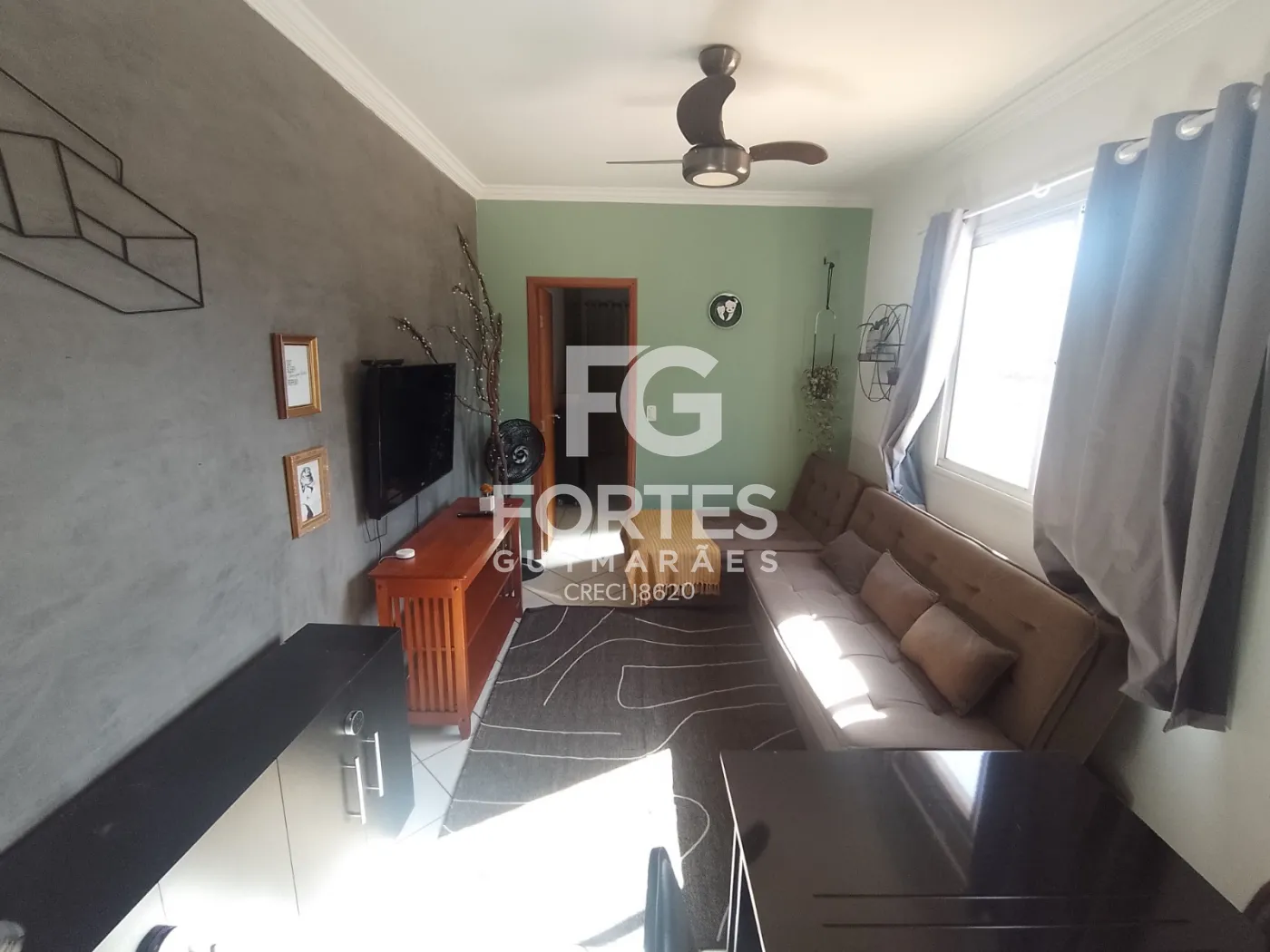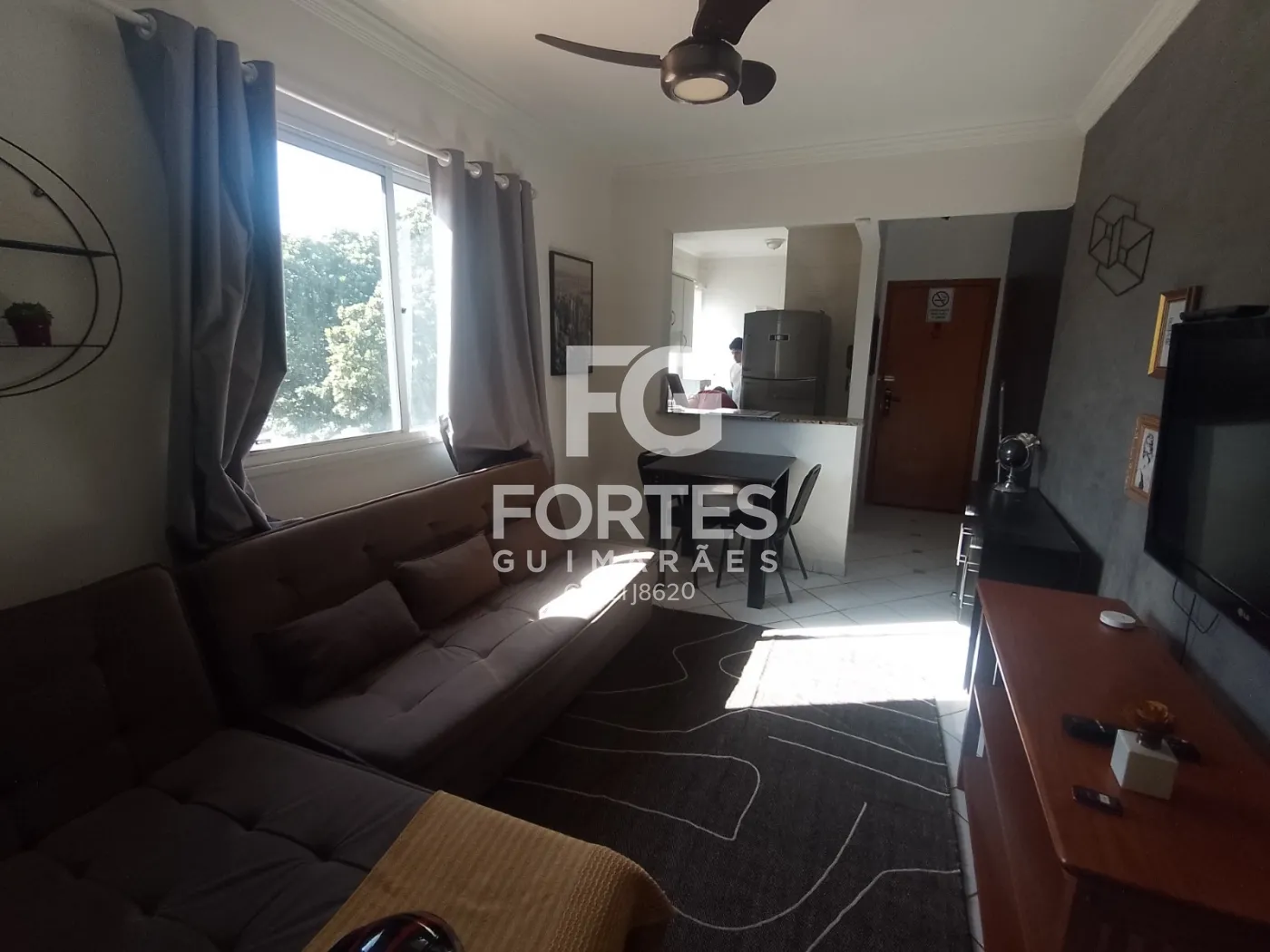 -01 Sala com sofá, ventilador de teto, televisão, rack, mesa com cadeira;