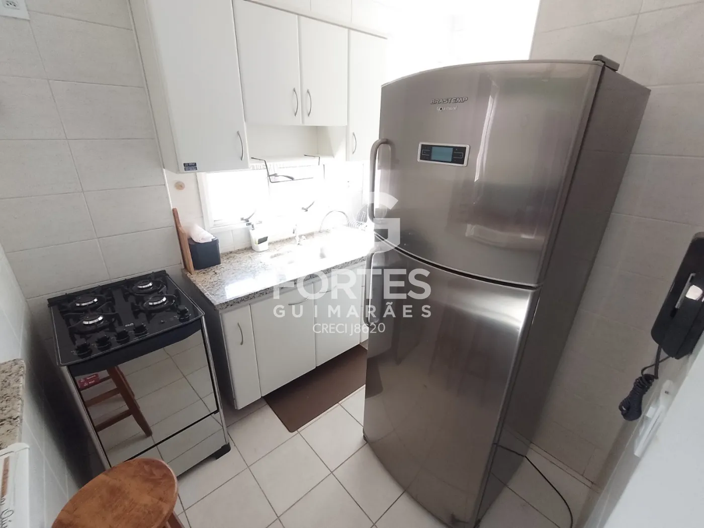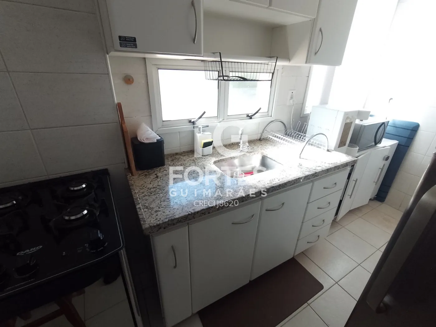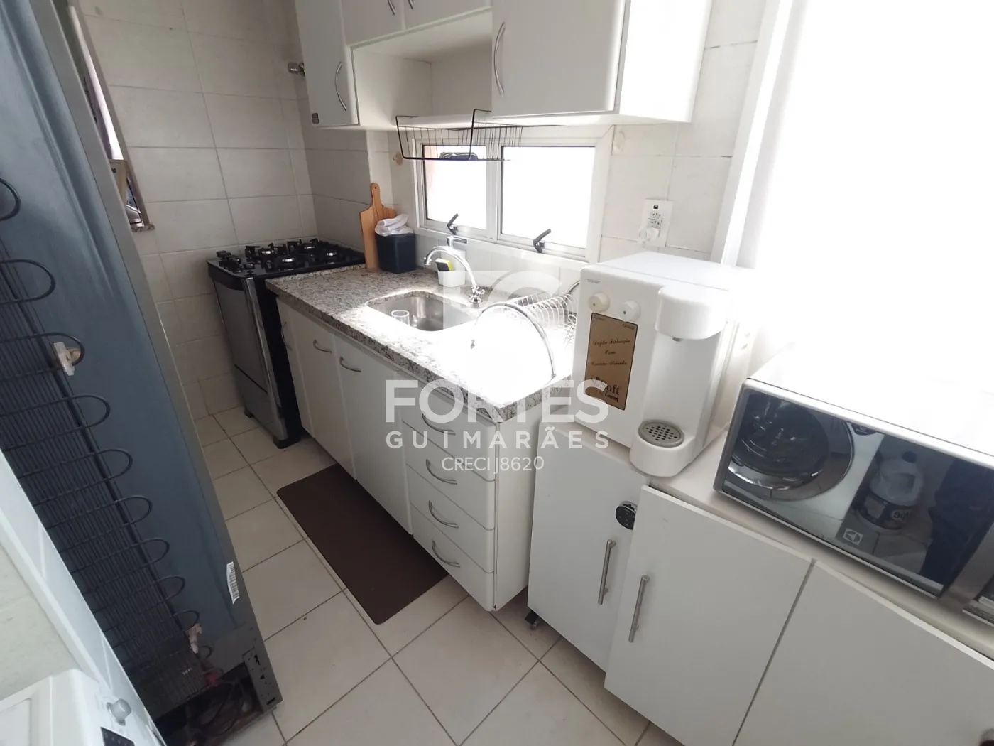 -01 Cozinha com fogão de quatro bocas, geladeira, armário, filtro de agua e microondas