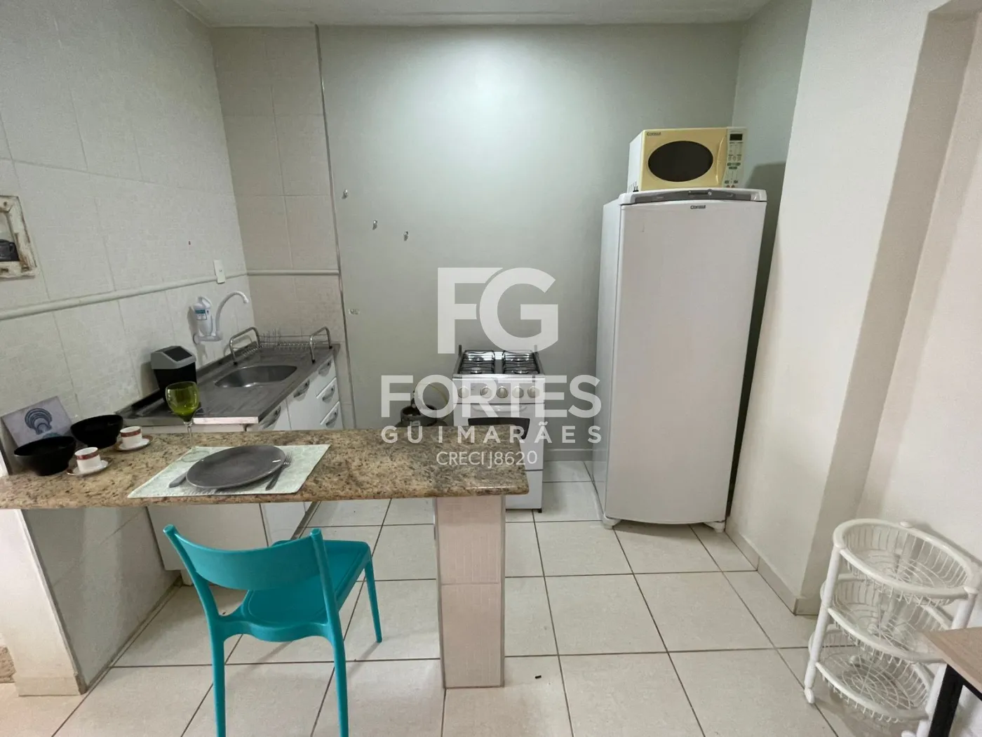 Cozinha com armário, geladeira, micro-ondas e fogão,