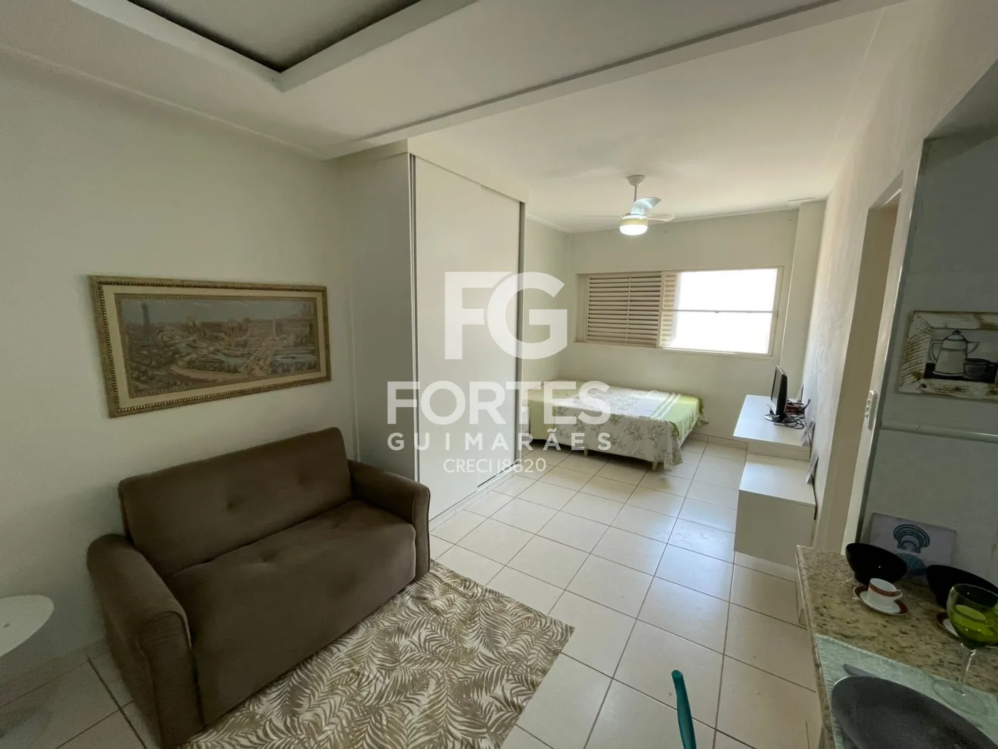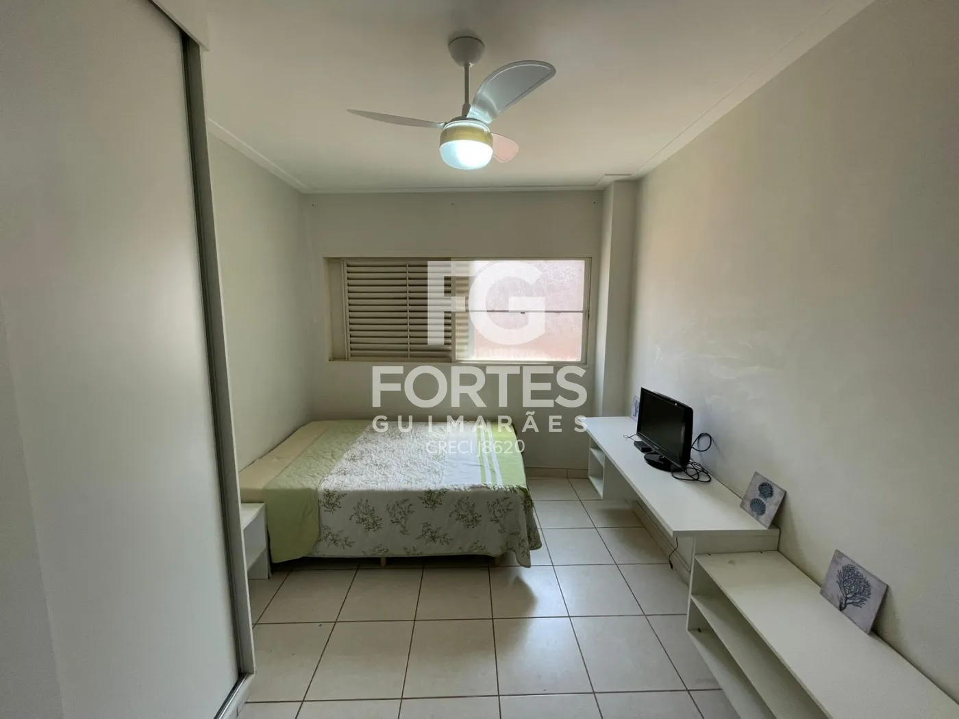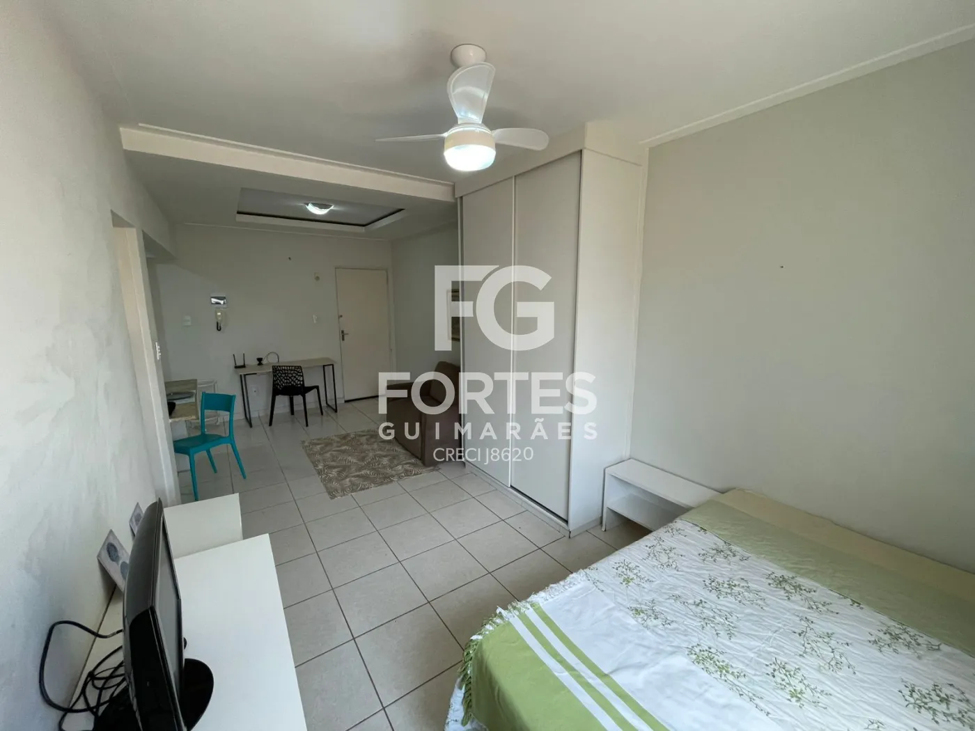 Sala conjugada com quarto, com cama, armário, ventilador de teto e televisão,