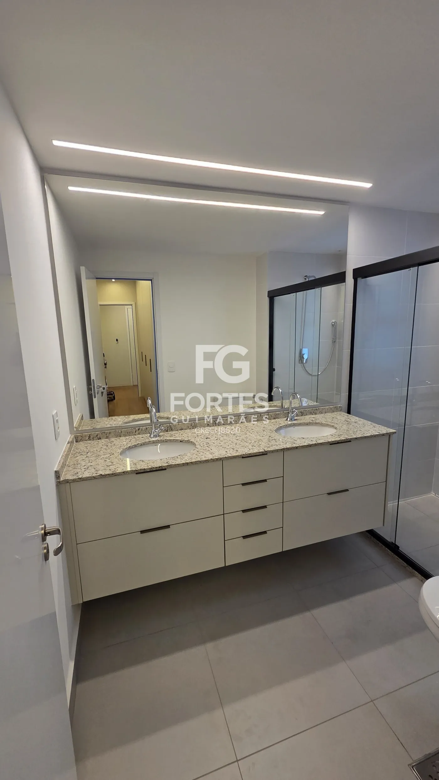 - 3 Banheiros suítes com gabinetes, espelhos e box em vidro