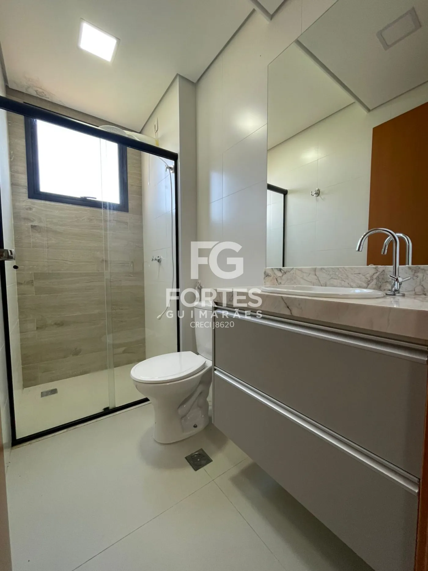 Banheiro com armário gabinete, espelho, box em vidro e chuveiro elétrico