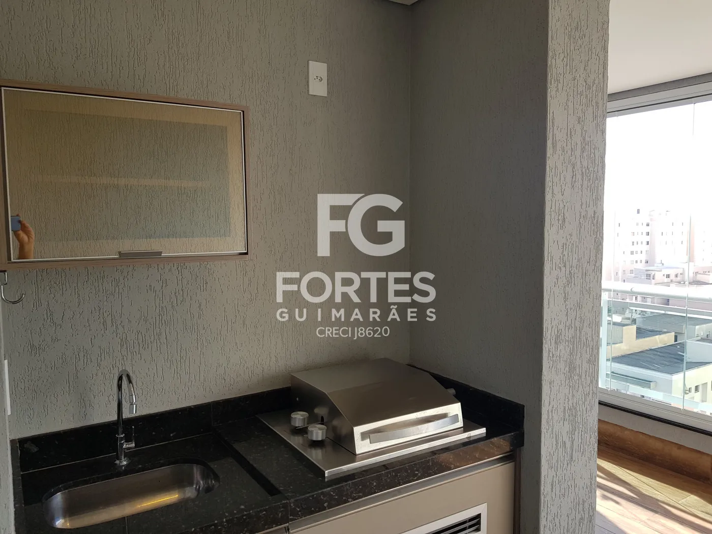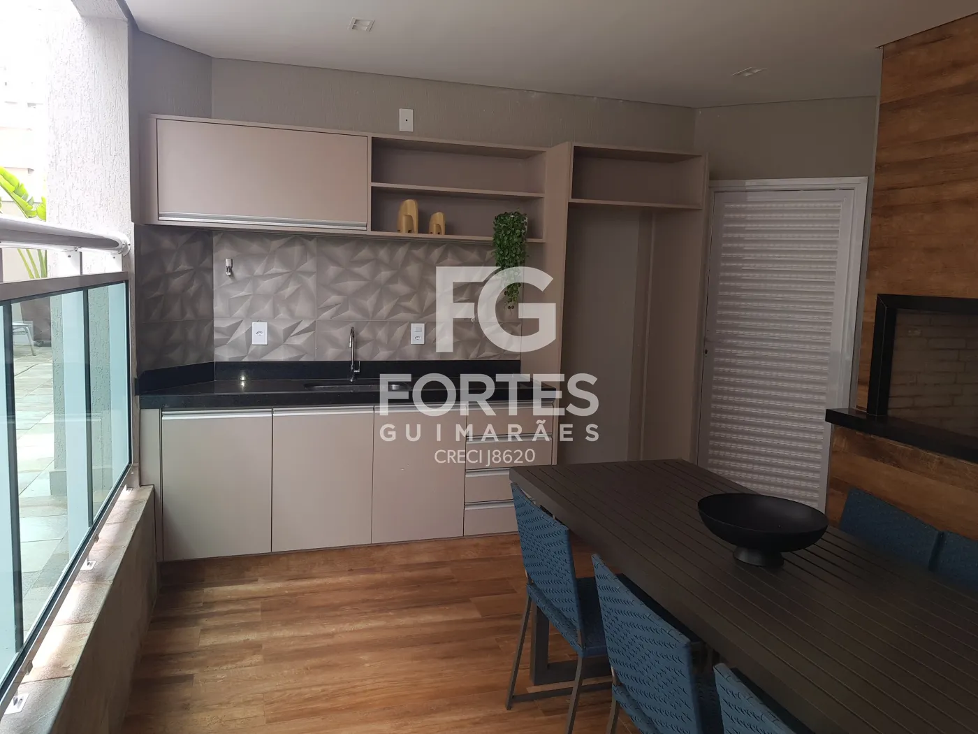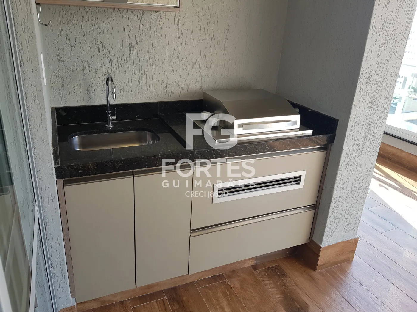 - Varanda gourmet com fechamento em vidro, integrada à cozinha, face sombra, com churrasqueira, pia, gabinete e armário