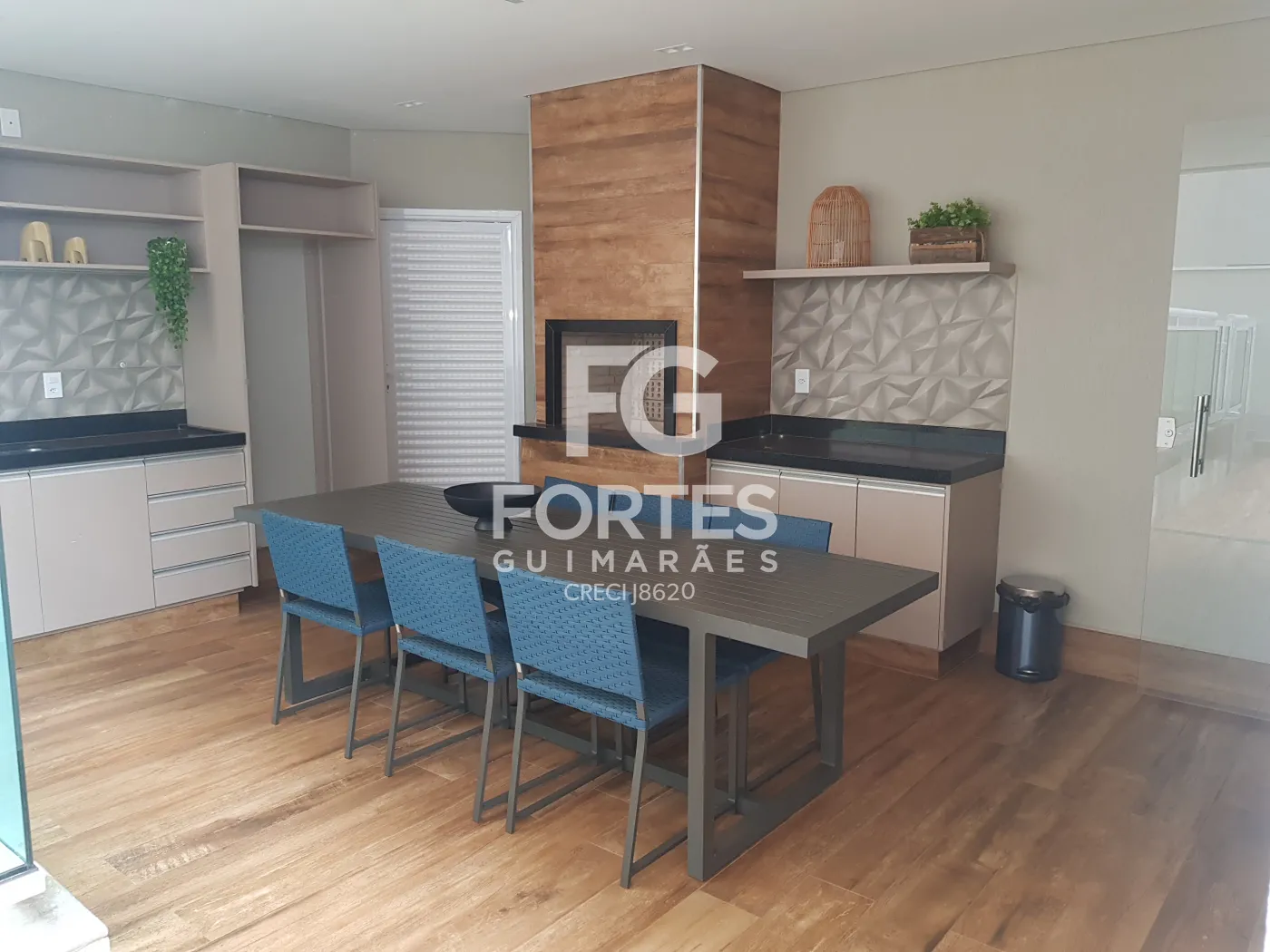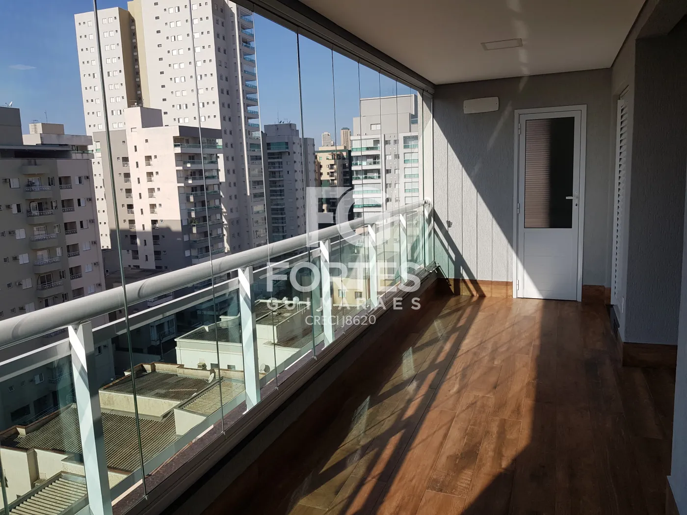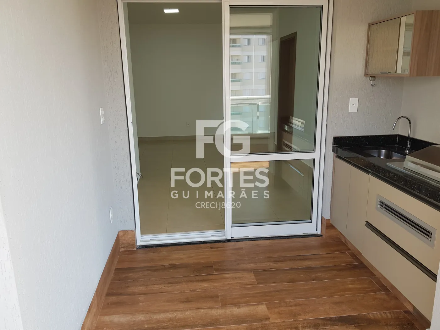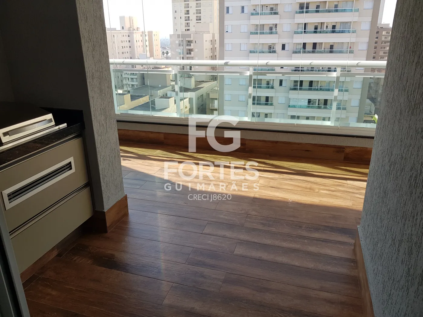 - Varanda gourmet com fechamento em vidro, integrada à cozinha, face sombra, com churrasqueira, pia, gabinete e armário