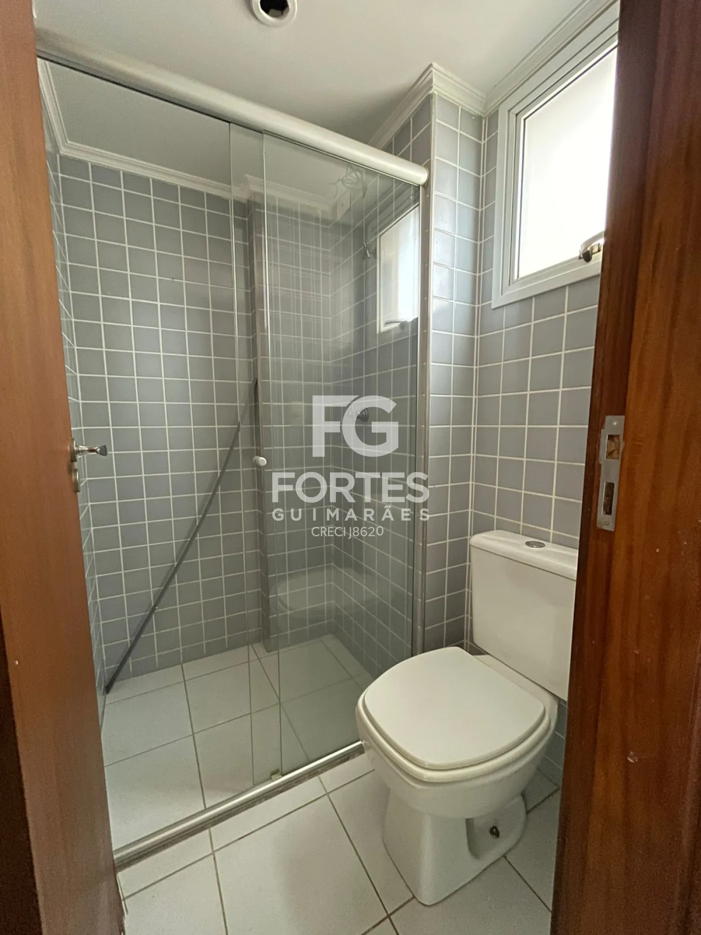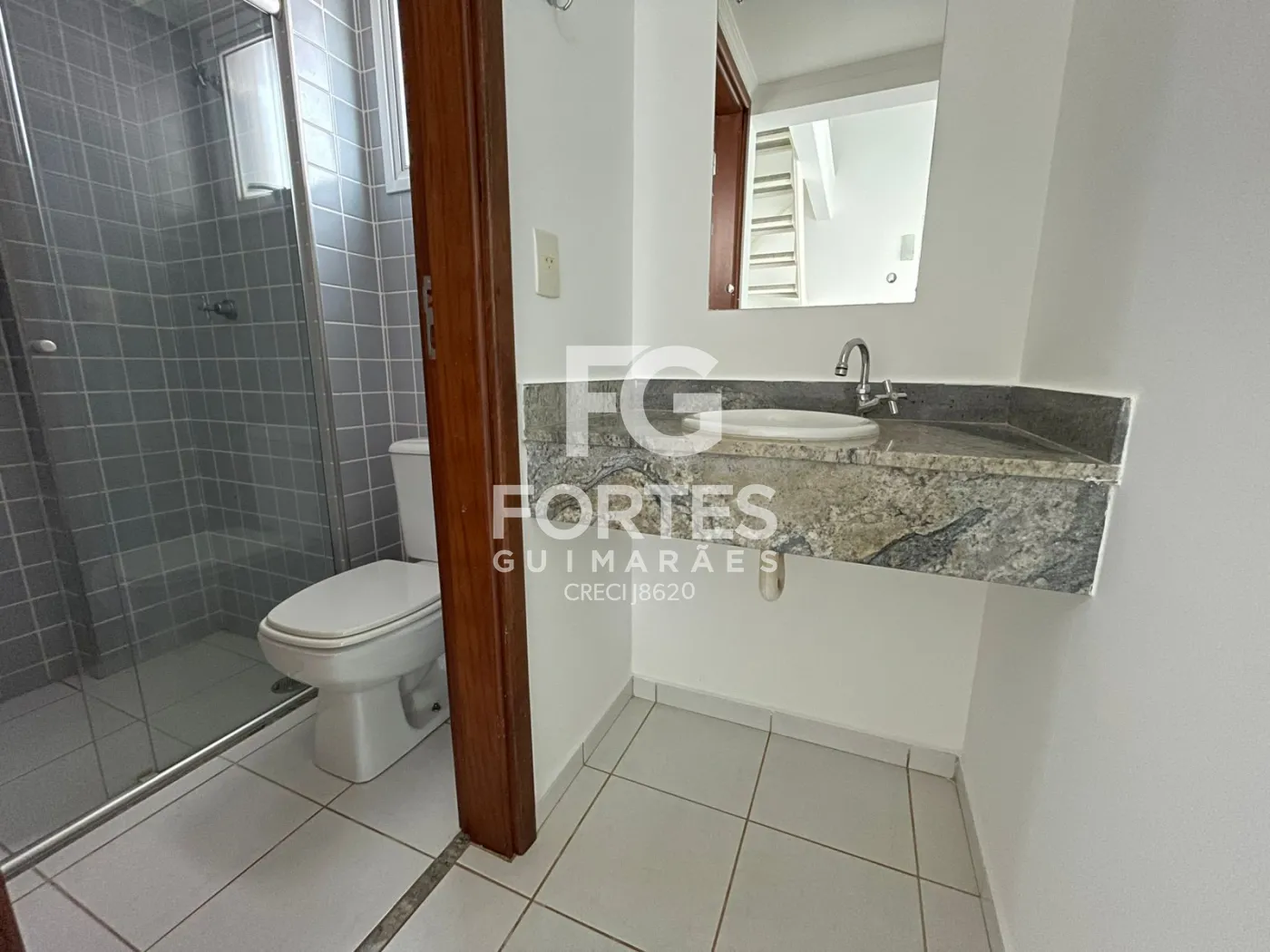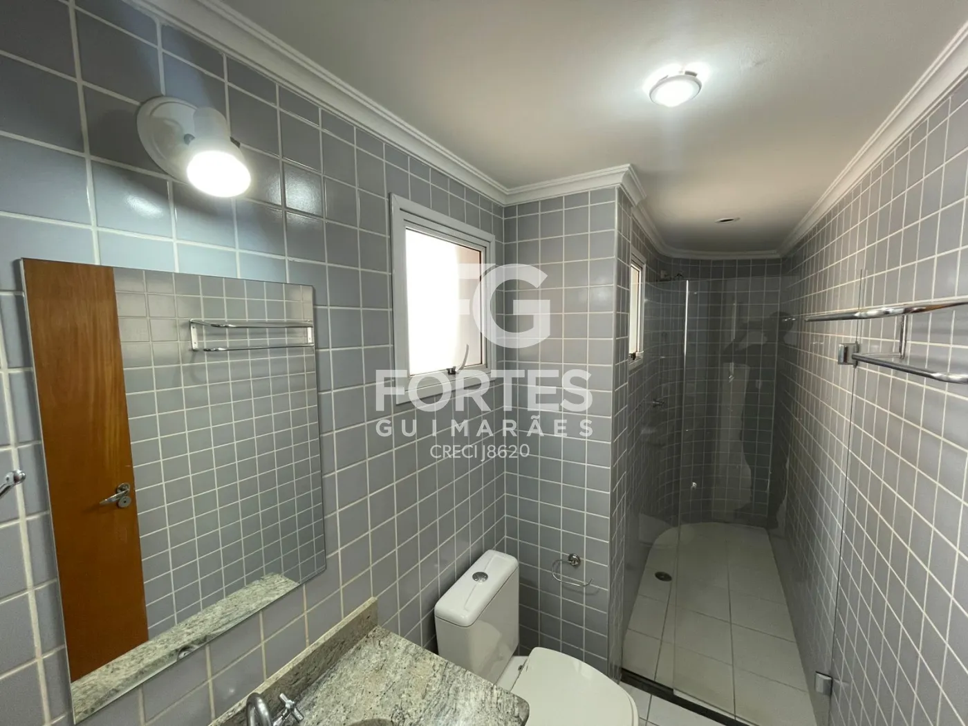 Banheiro da suite com armário gabinete, espelho e box em vidro