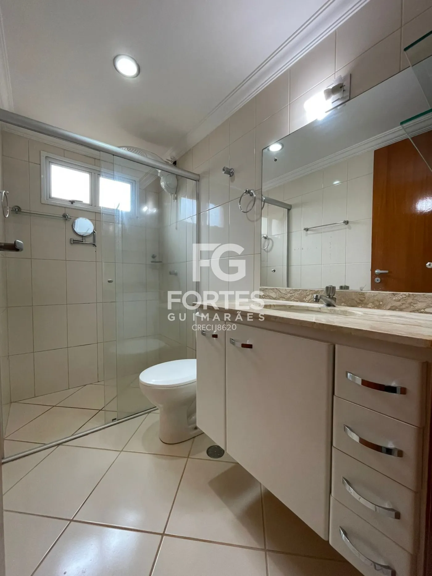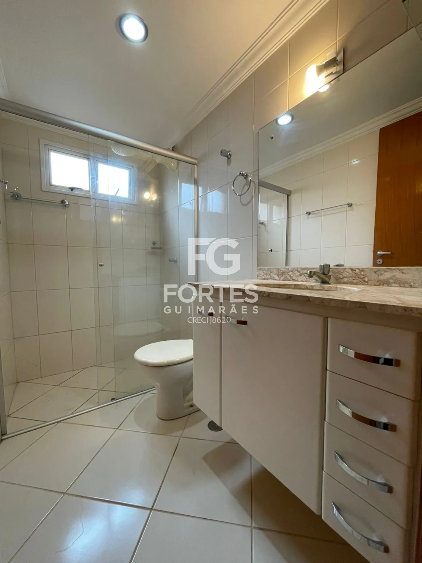 Banheiro social com armário gabinete, espelho, box em vidro e chuveiro elétrico
