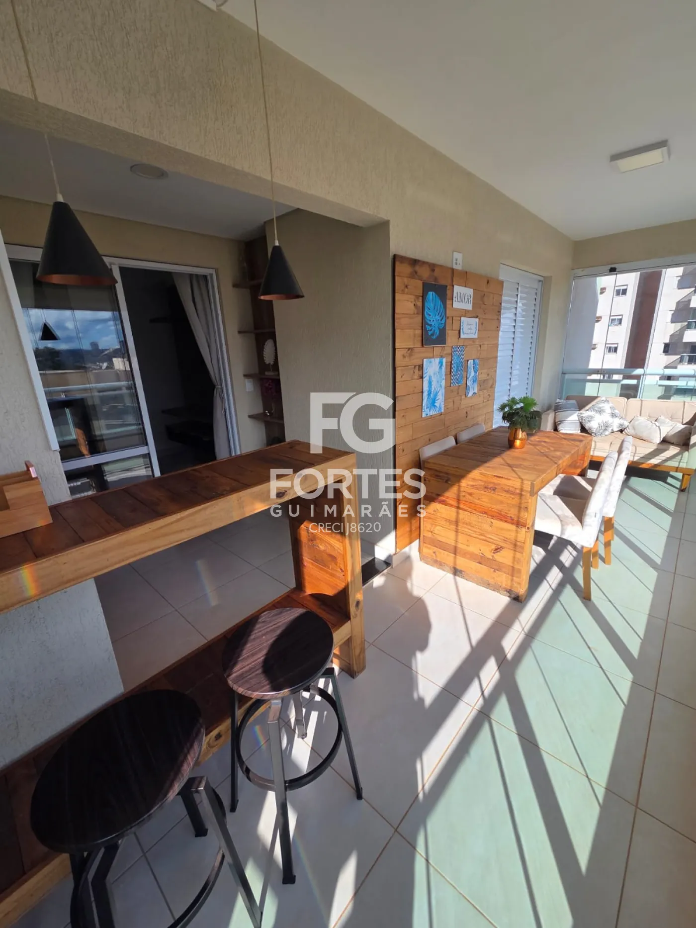 - Sacada com bancada em madeira, mesa com 4 lugares e sofá e fechamento em vidro;