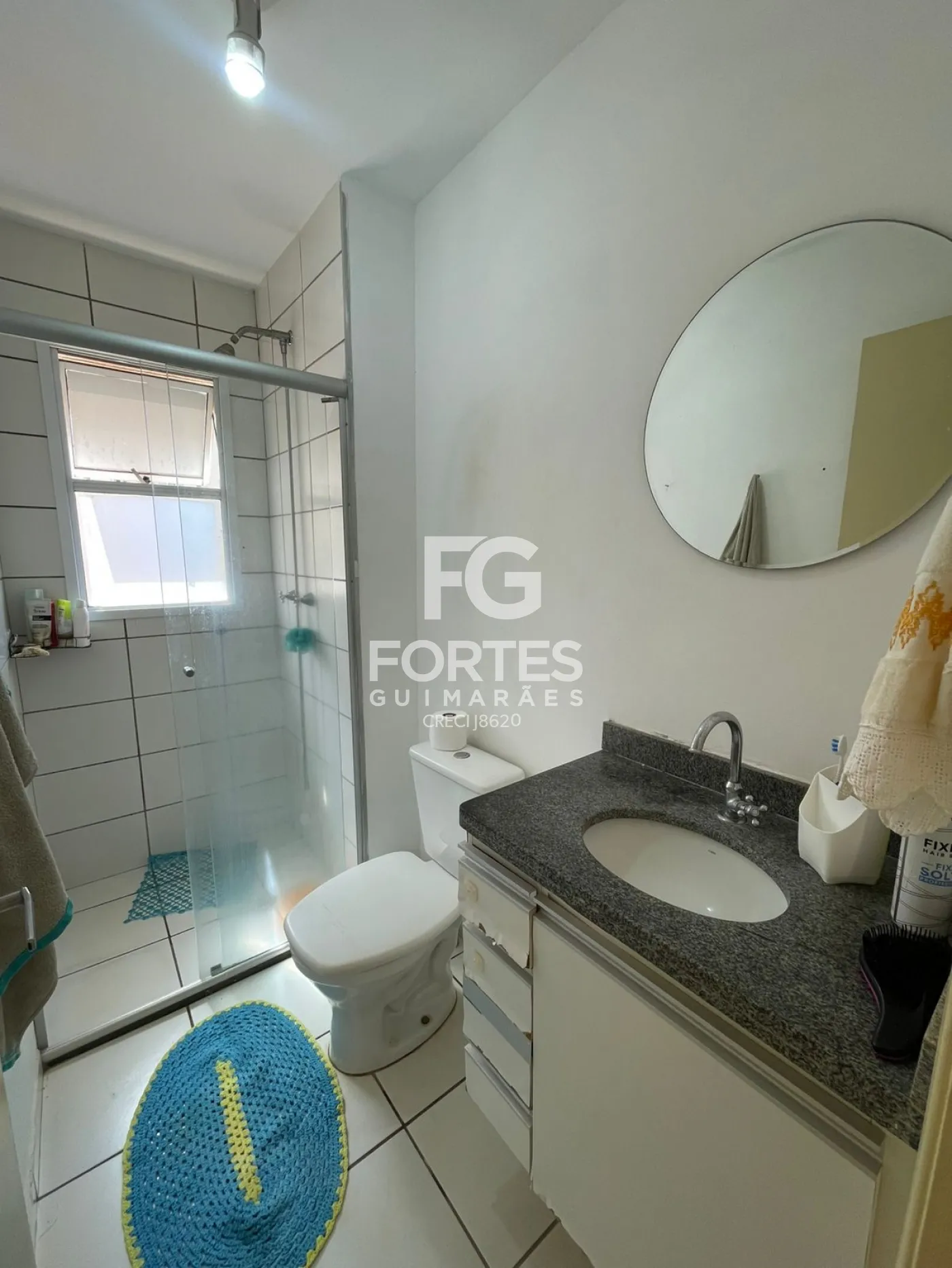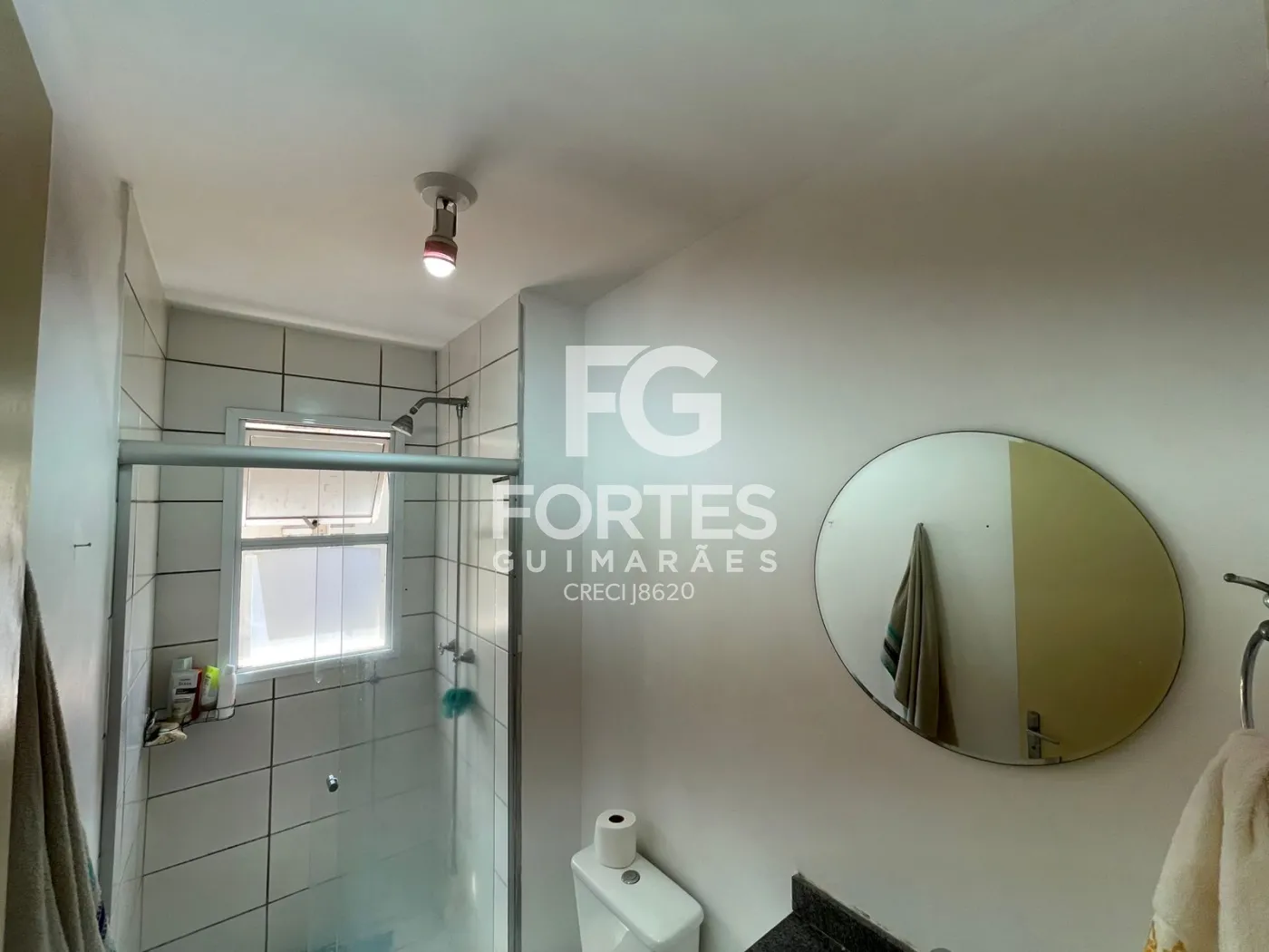Banheiro social com armário gabinete, espelho, box em vidro e ducha higiênica