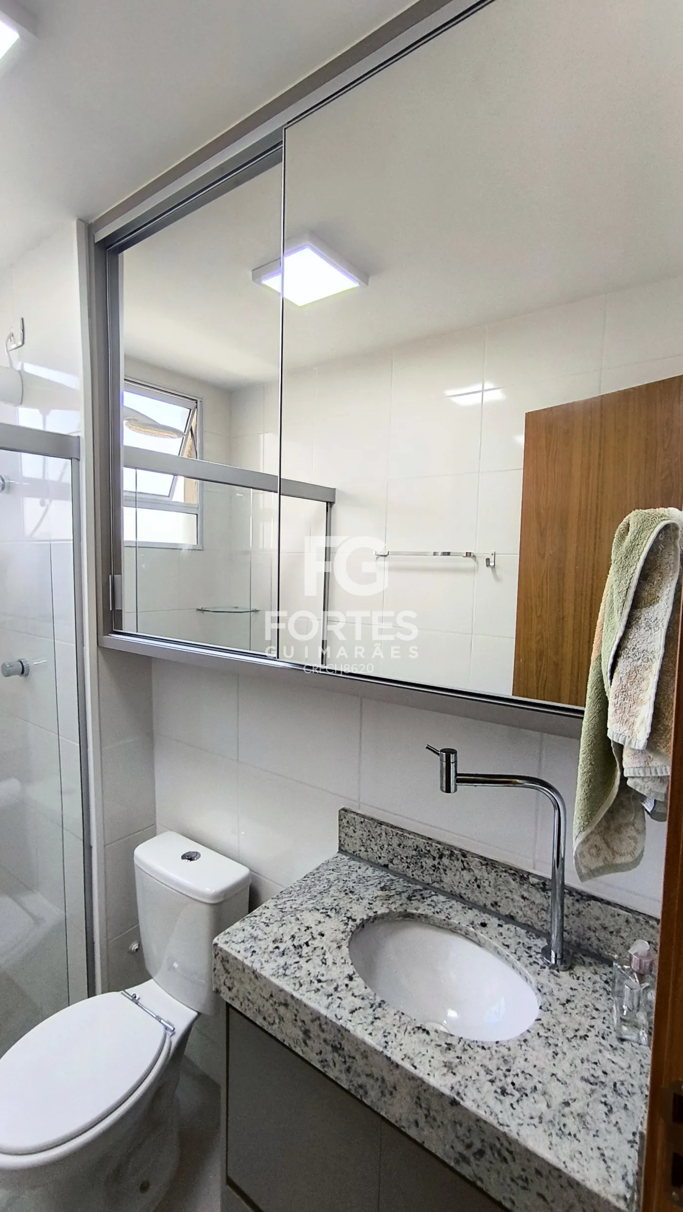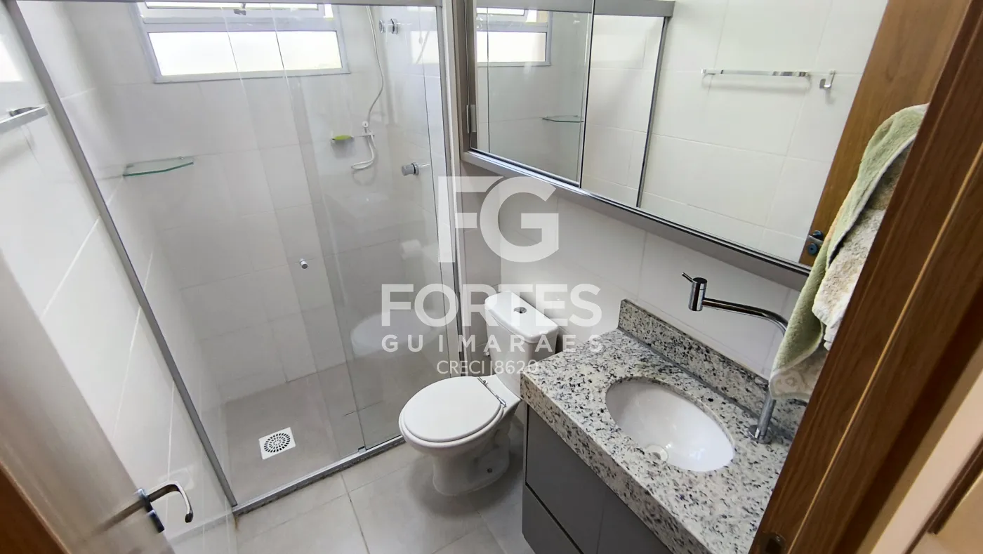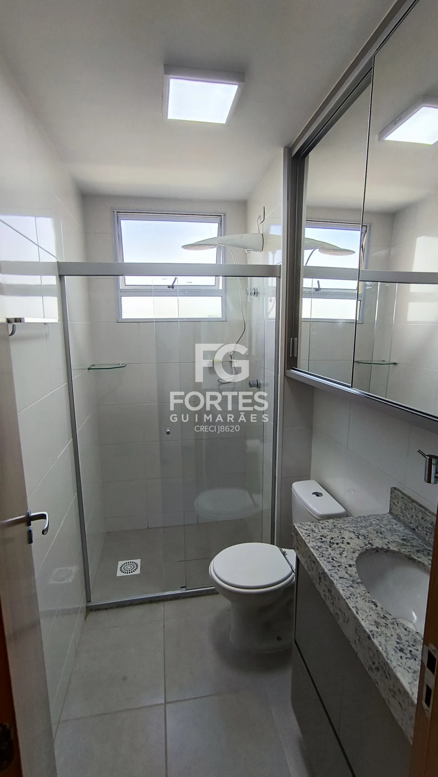 - 1 banheiro social com gabinete, espelho e box em vidro