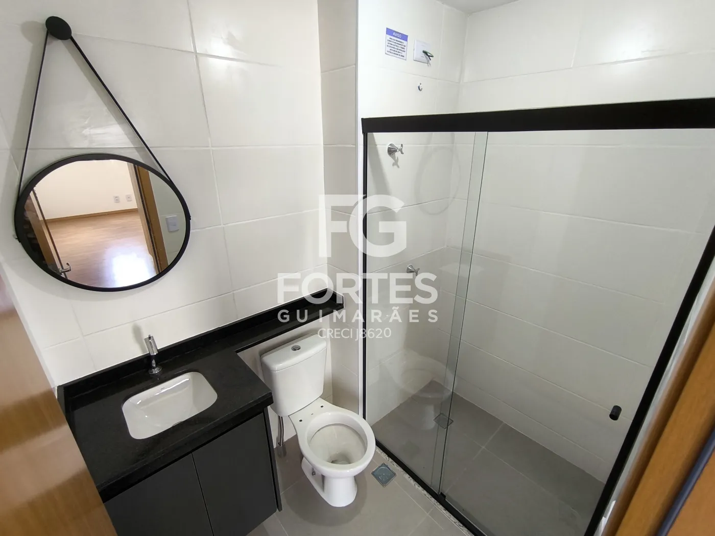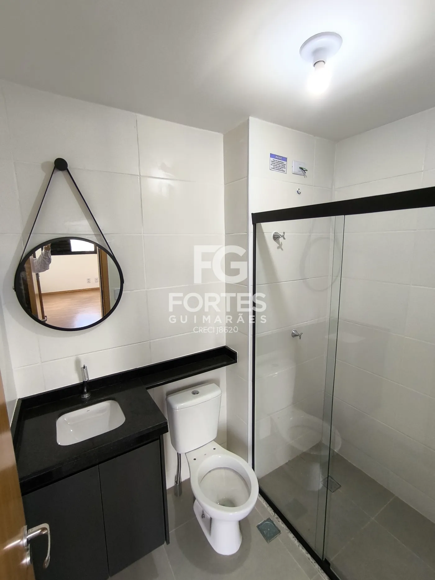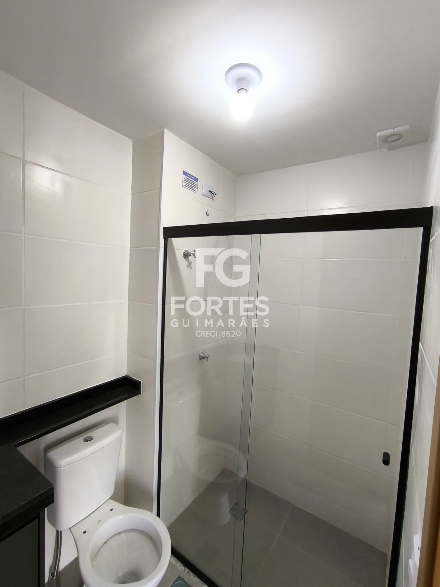 - 1 Banheiro social com gabinete, espelho e box em vidro