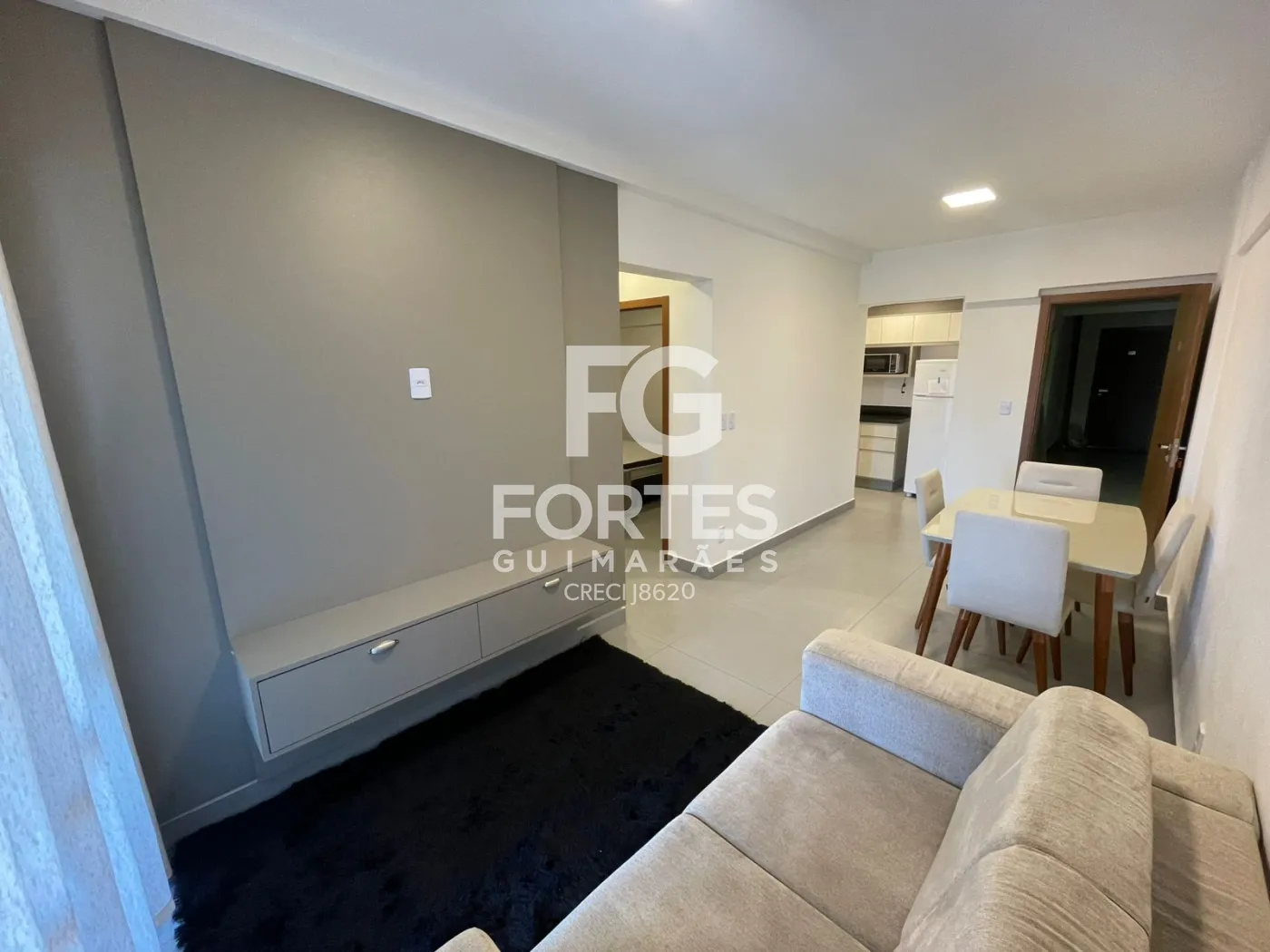 Sala ampla 2 ambientes com armário para televisão, sofá, mesa de jantar,