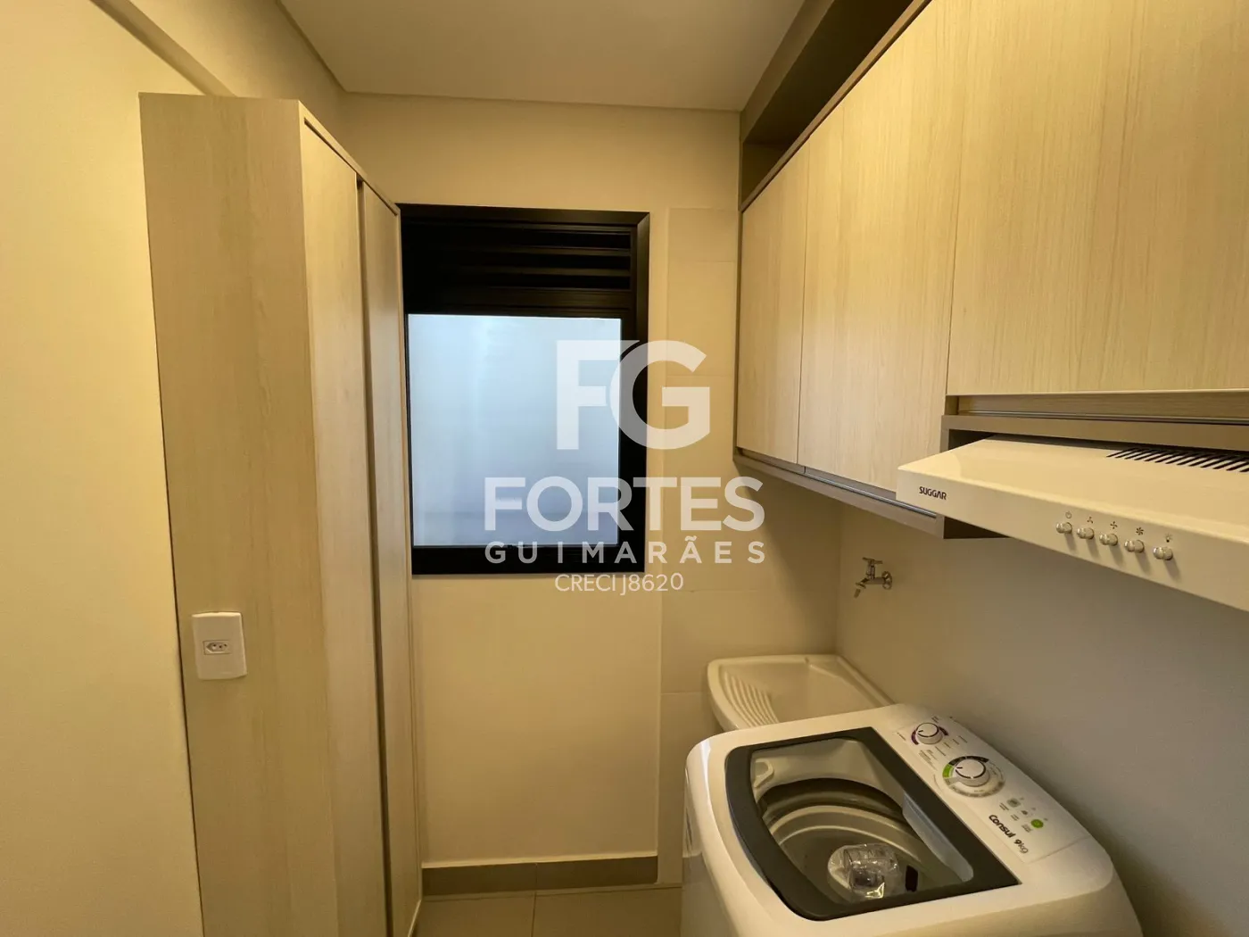 Área de serviço com armários e máquina de lavar,
