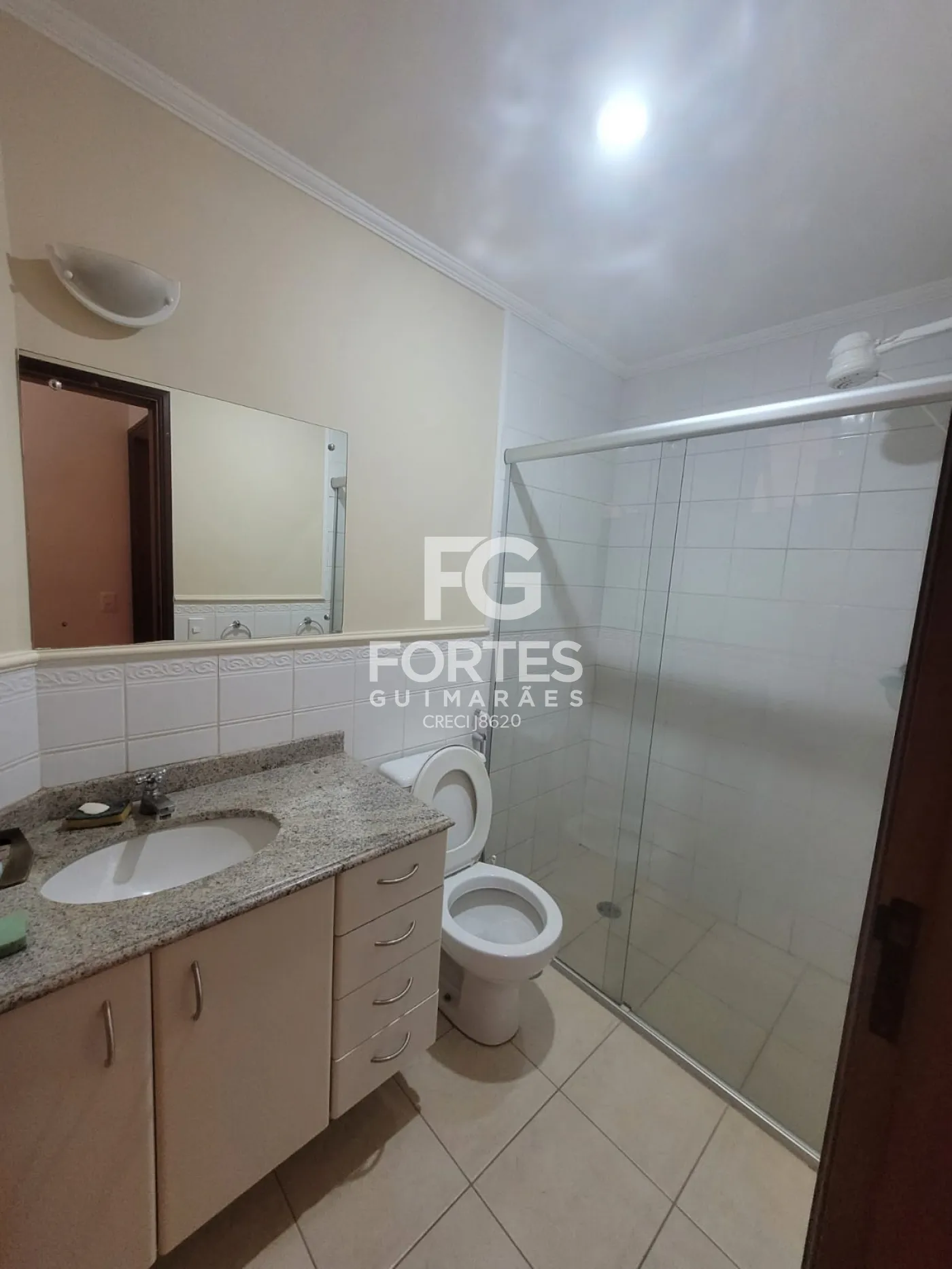 - Banheiro social com gabinete e box em vidro.