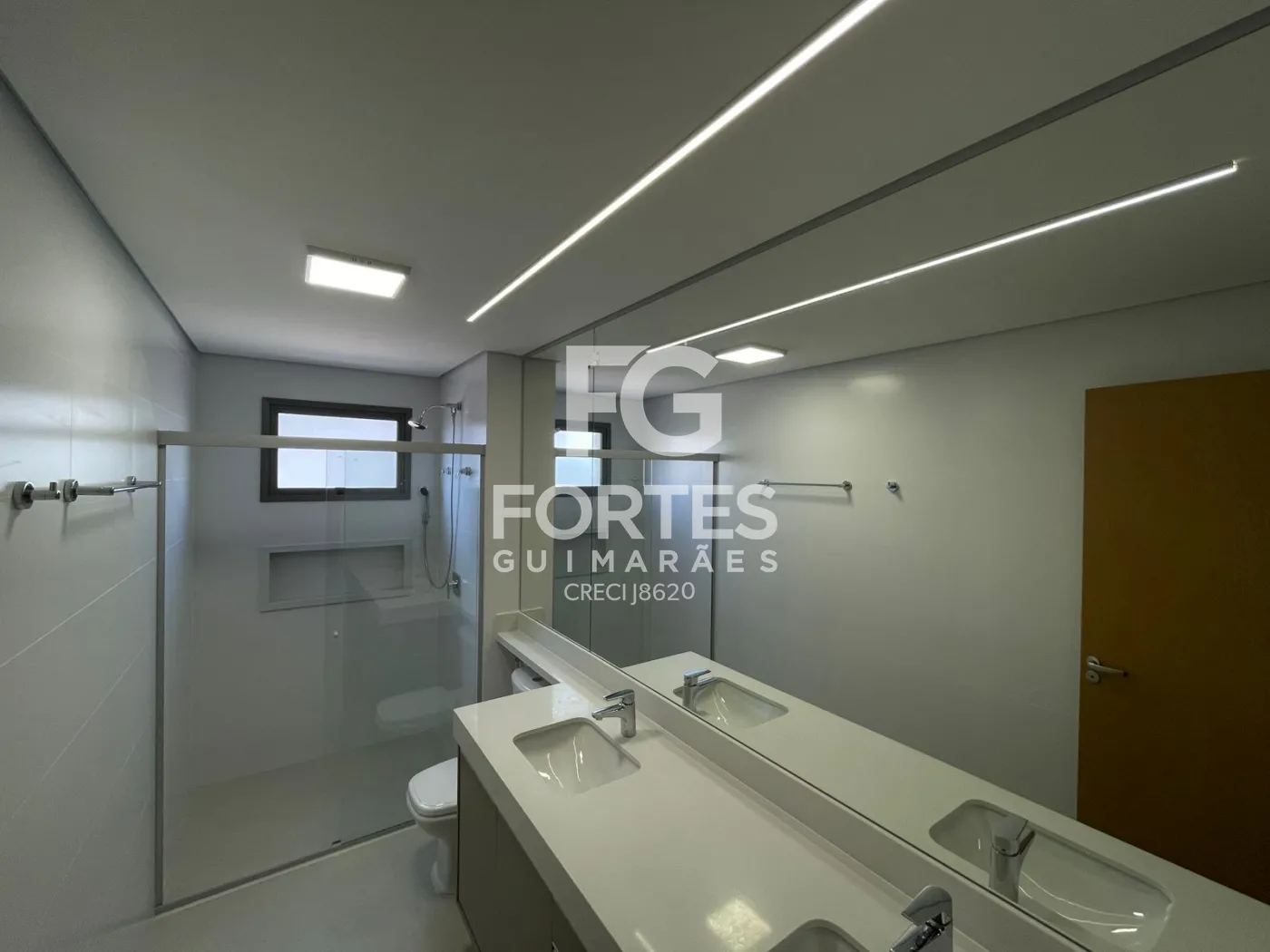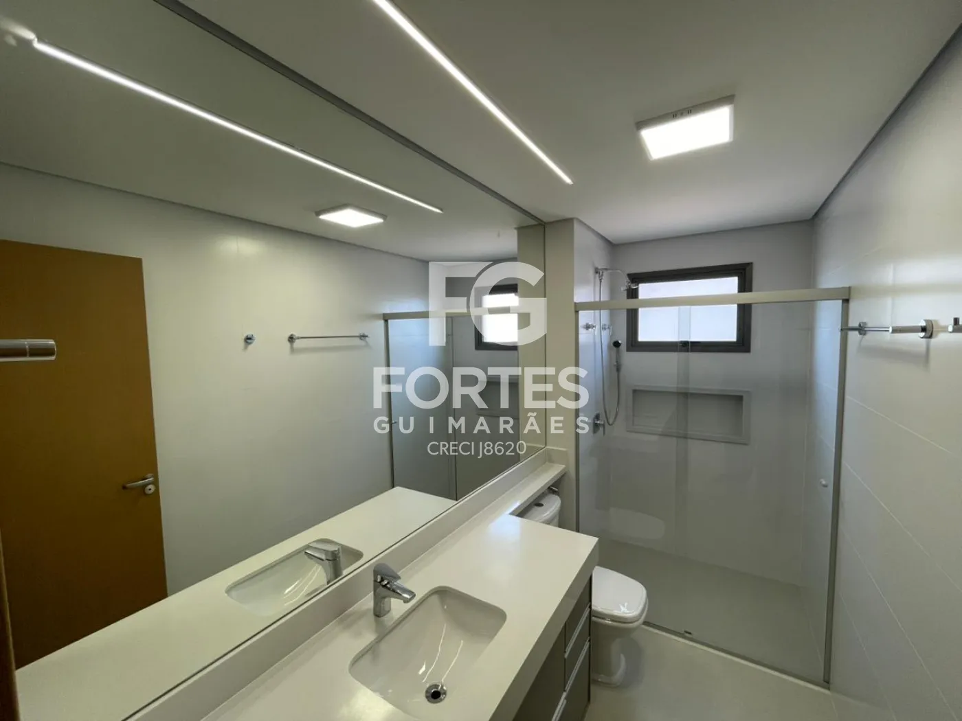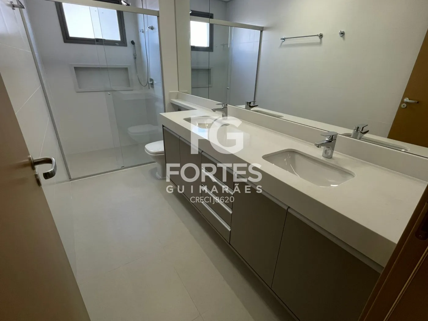 Banheiros das suítes com armários, espelhos grandes, box em vidro e ducha higiênica,