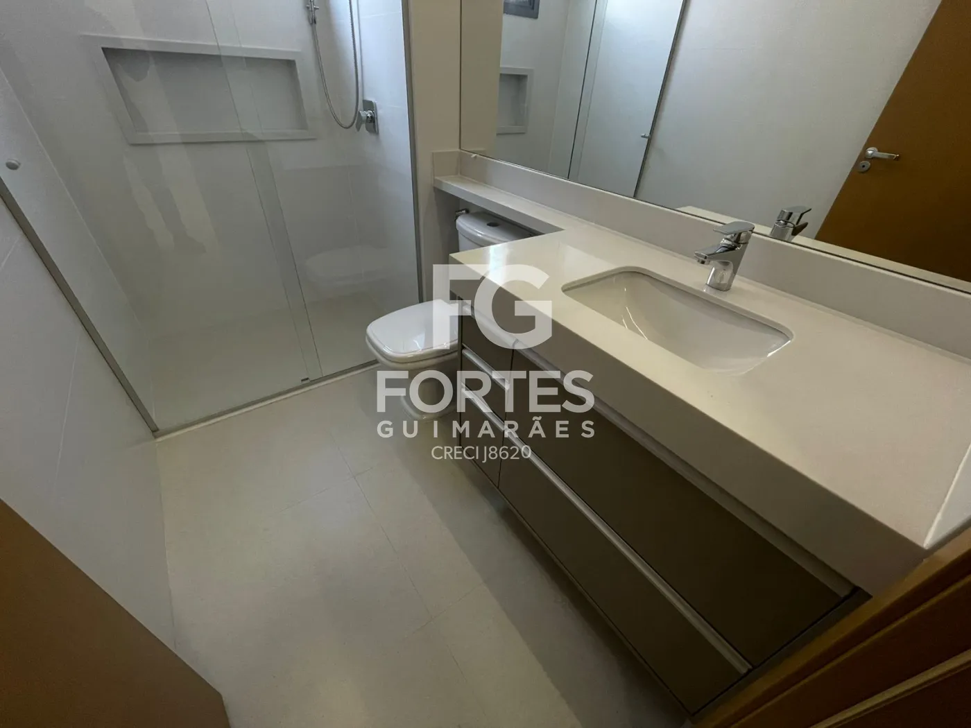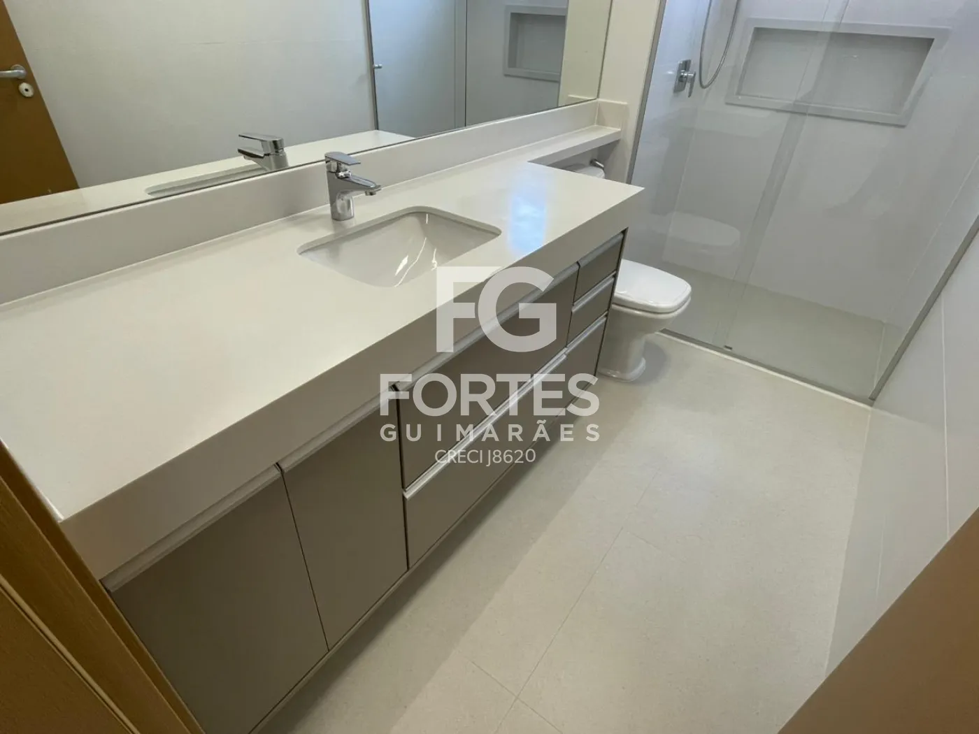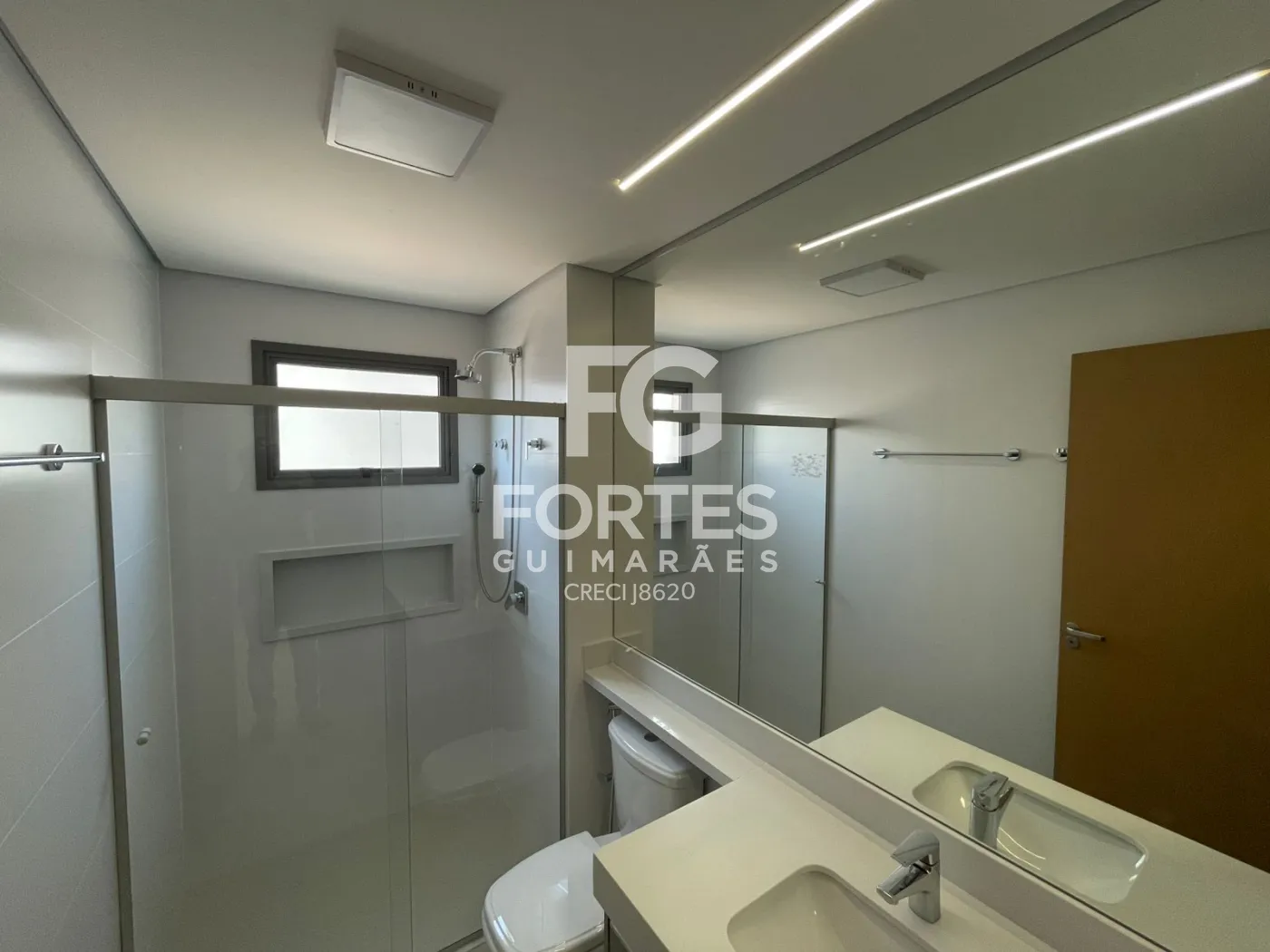 Banheiros das suítes com armários, espelhos grandes, box em vidro e ducha higiênica,