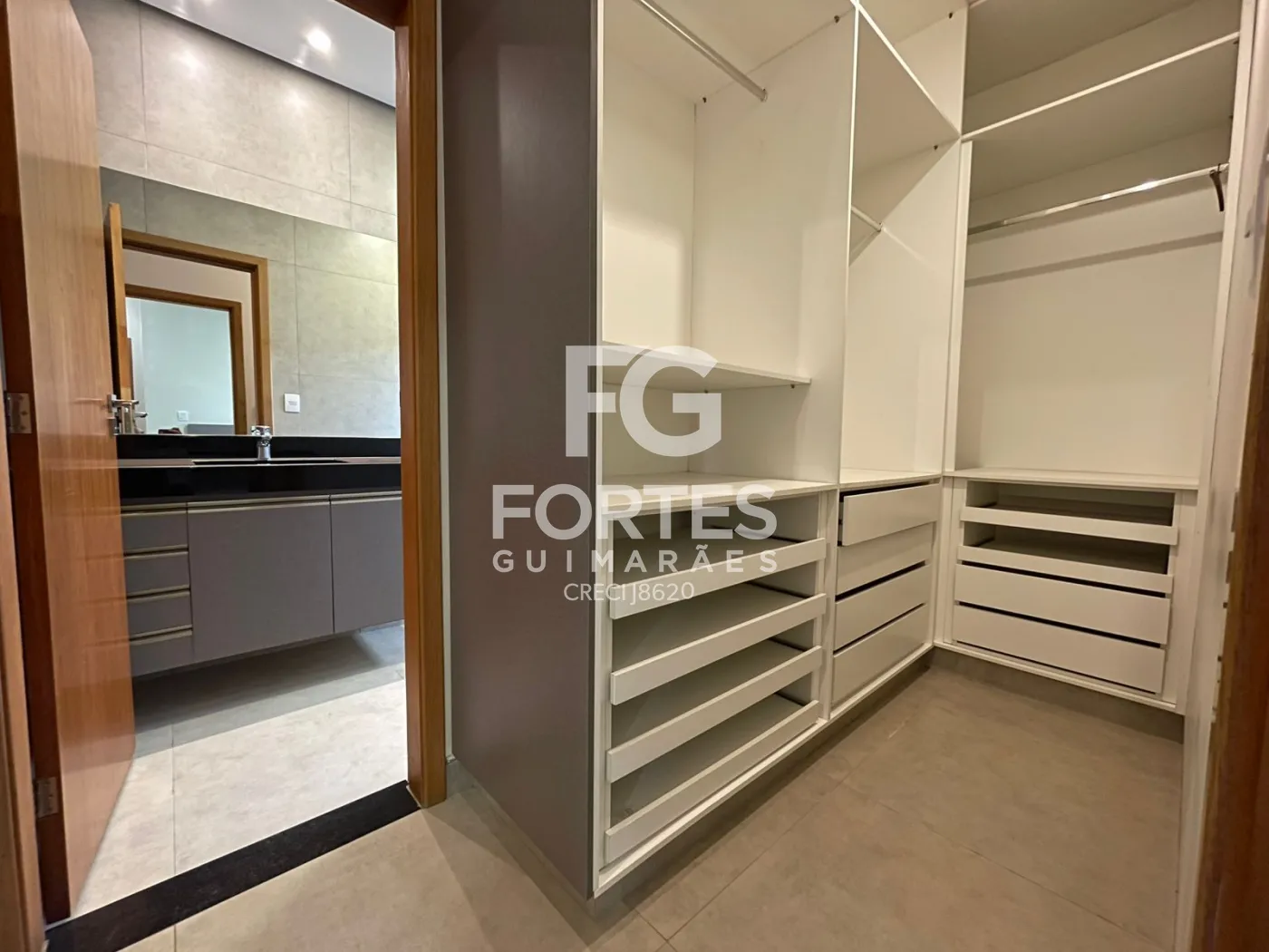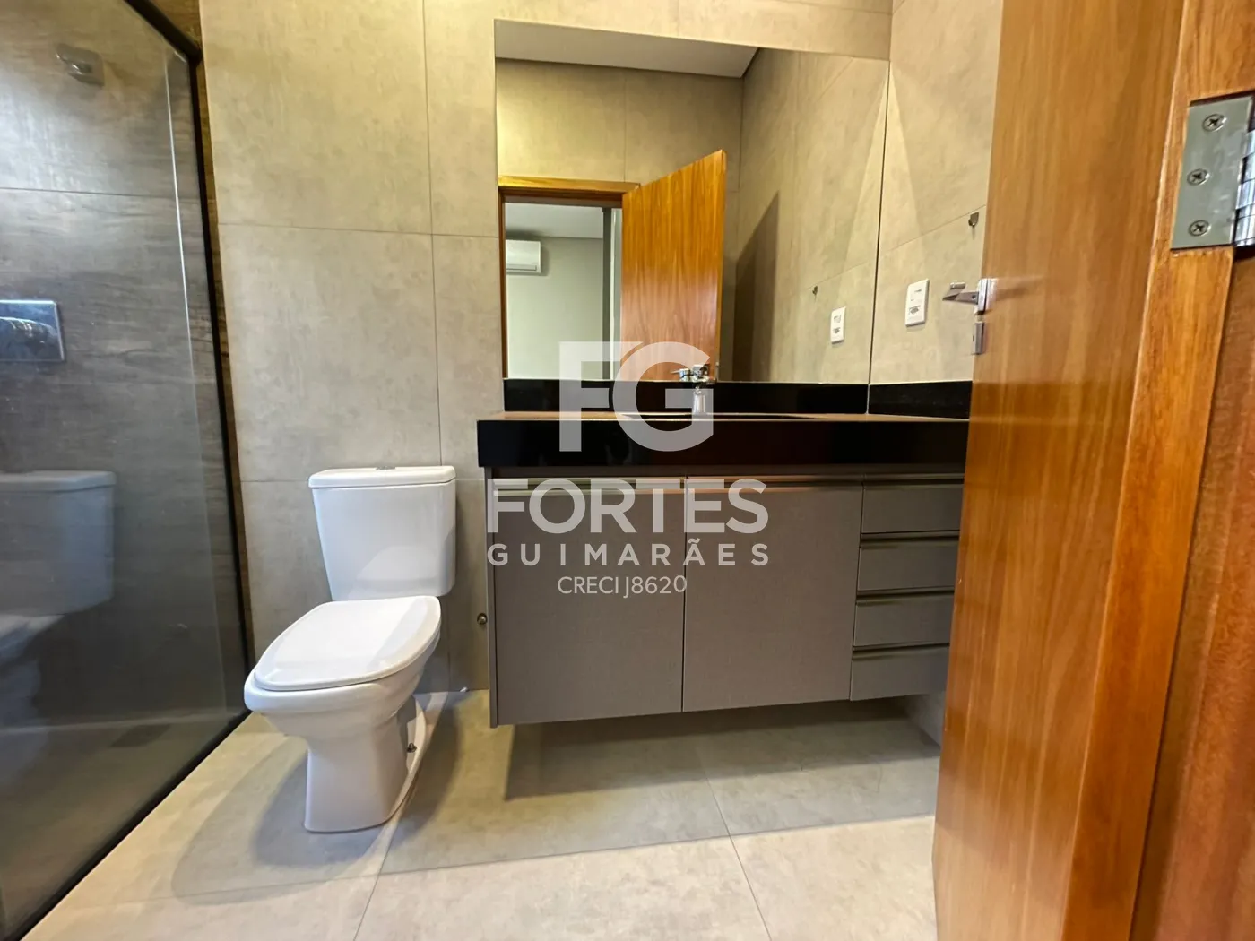 Banheiros das suítes com armários gabinetes, espelhos, box em vidros e duchas higiênicas,