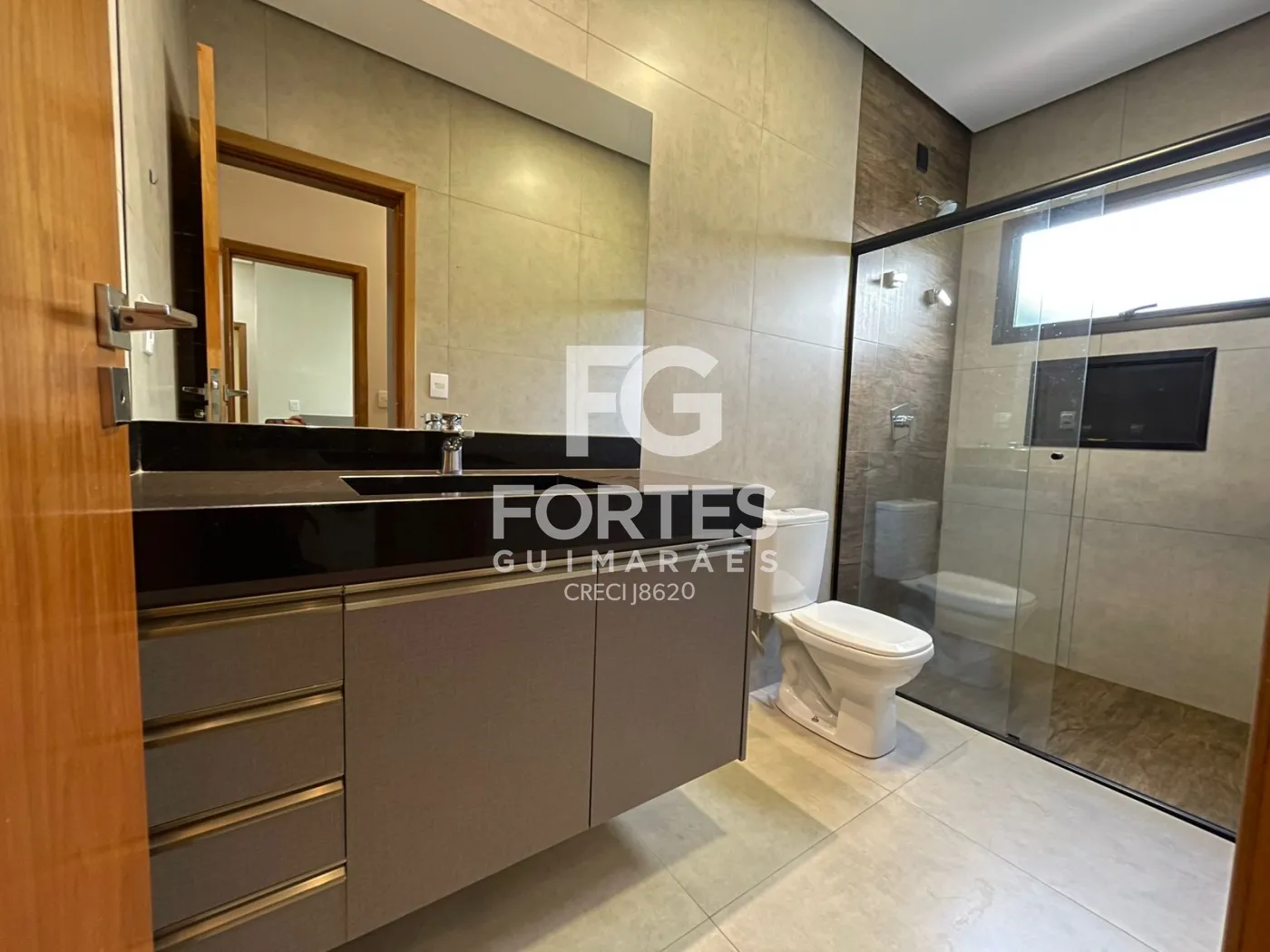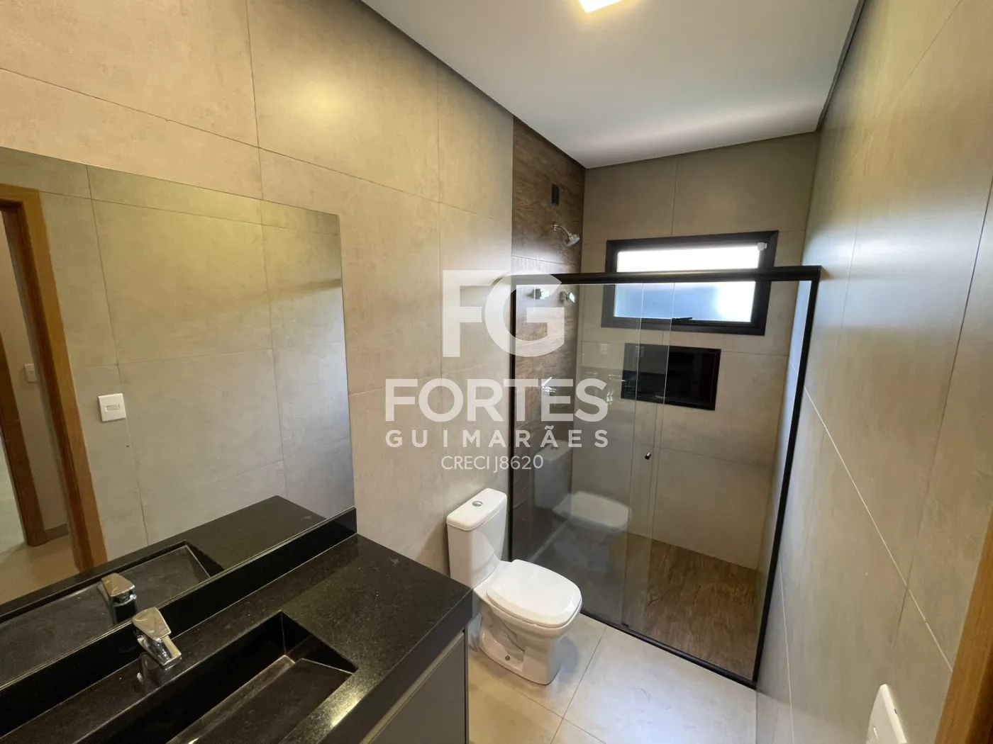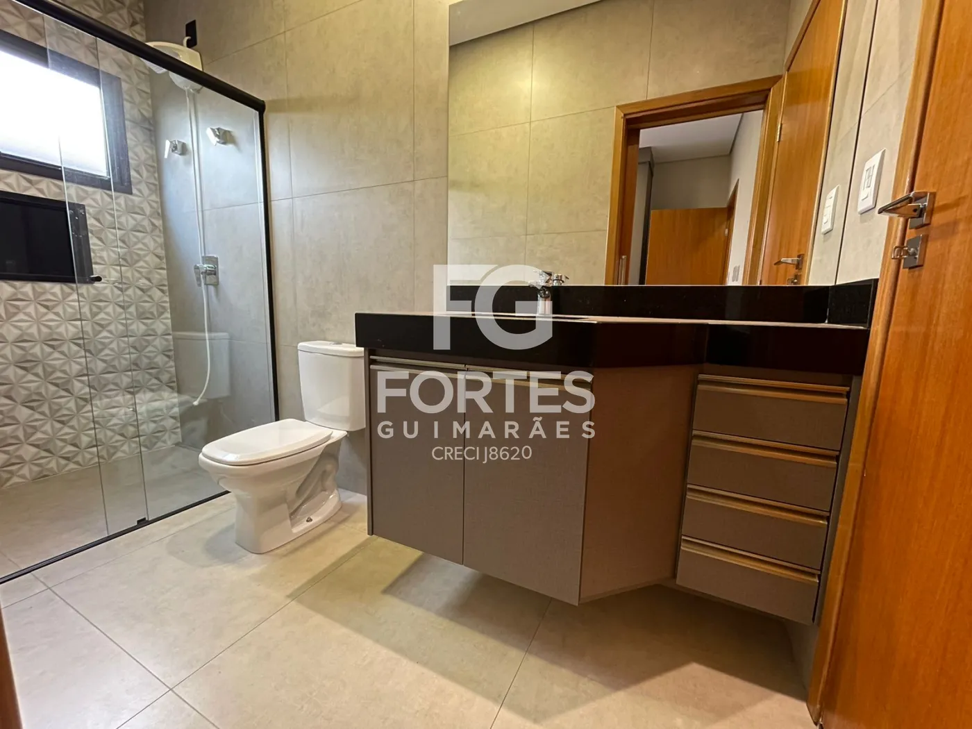 Banheiro social com armário gabinete, espelho, box em vidro e chuveiro elétrico,