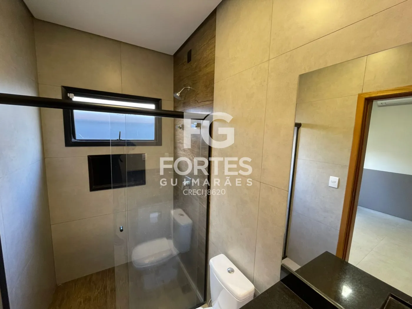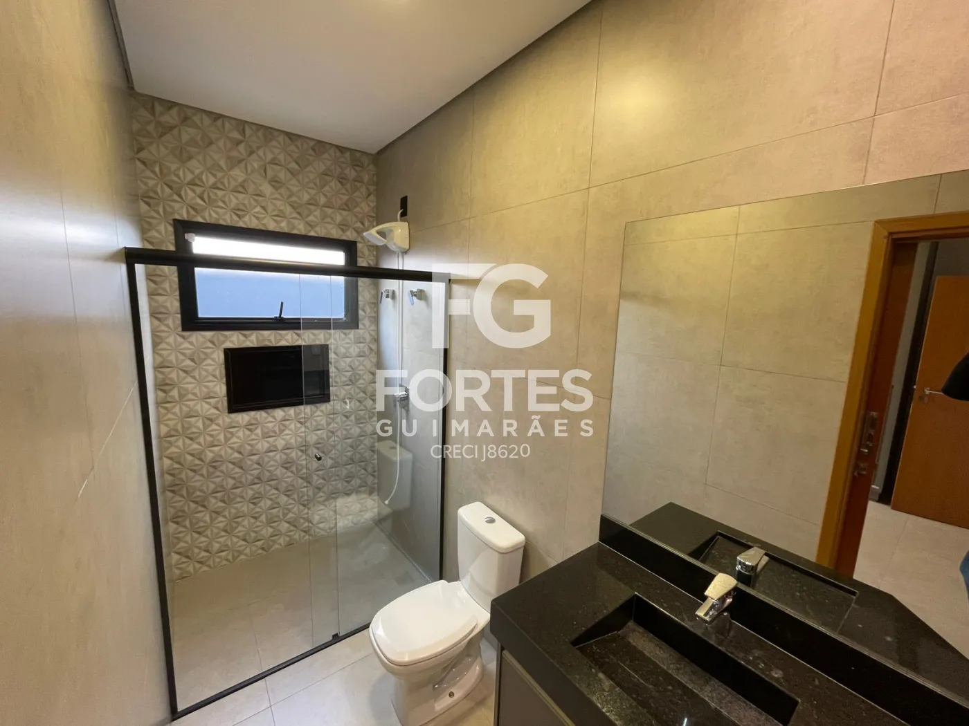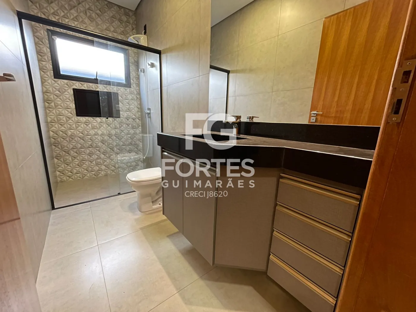 Banheiro social com armário gabinete, espelho, box em vidro e chuveiro elétrico,