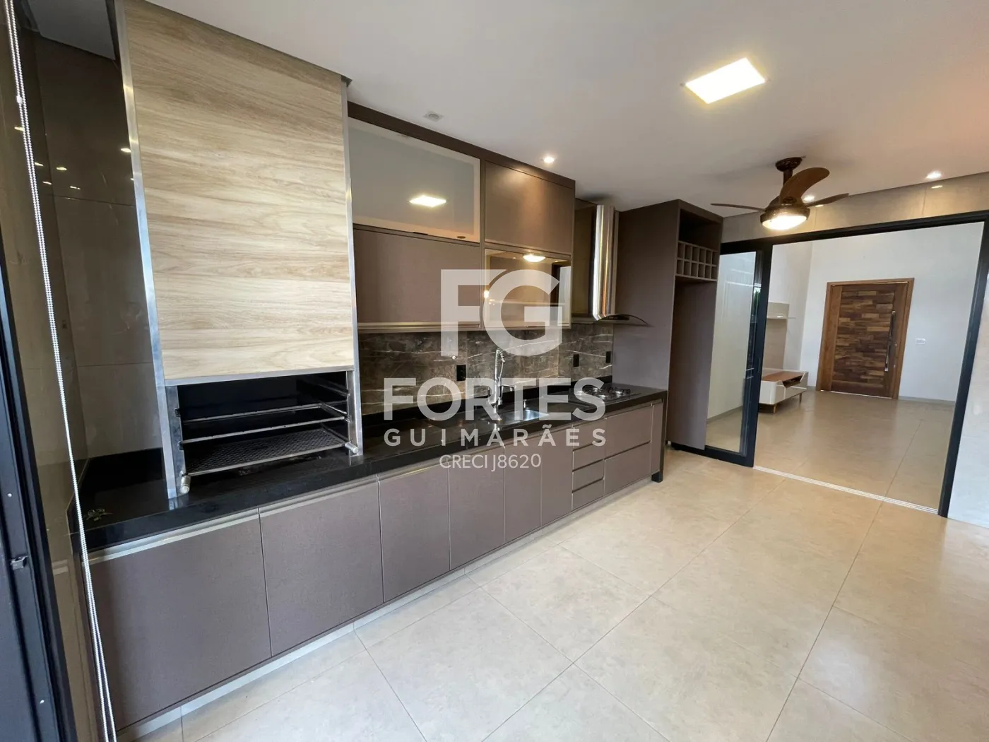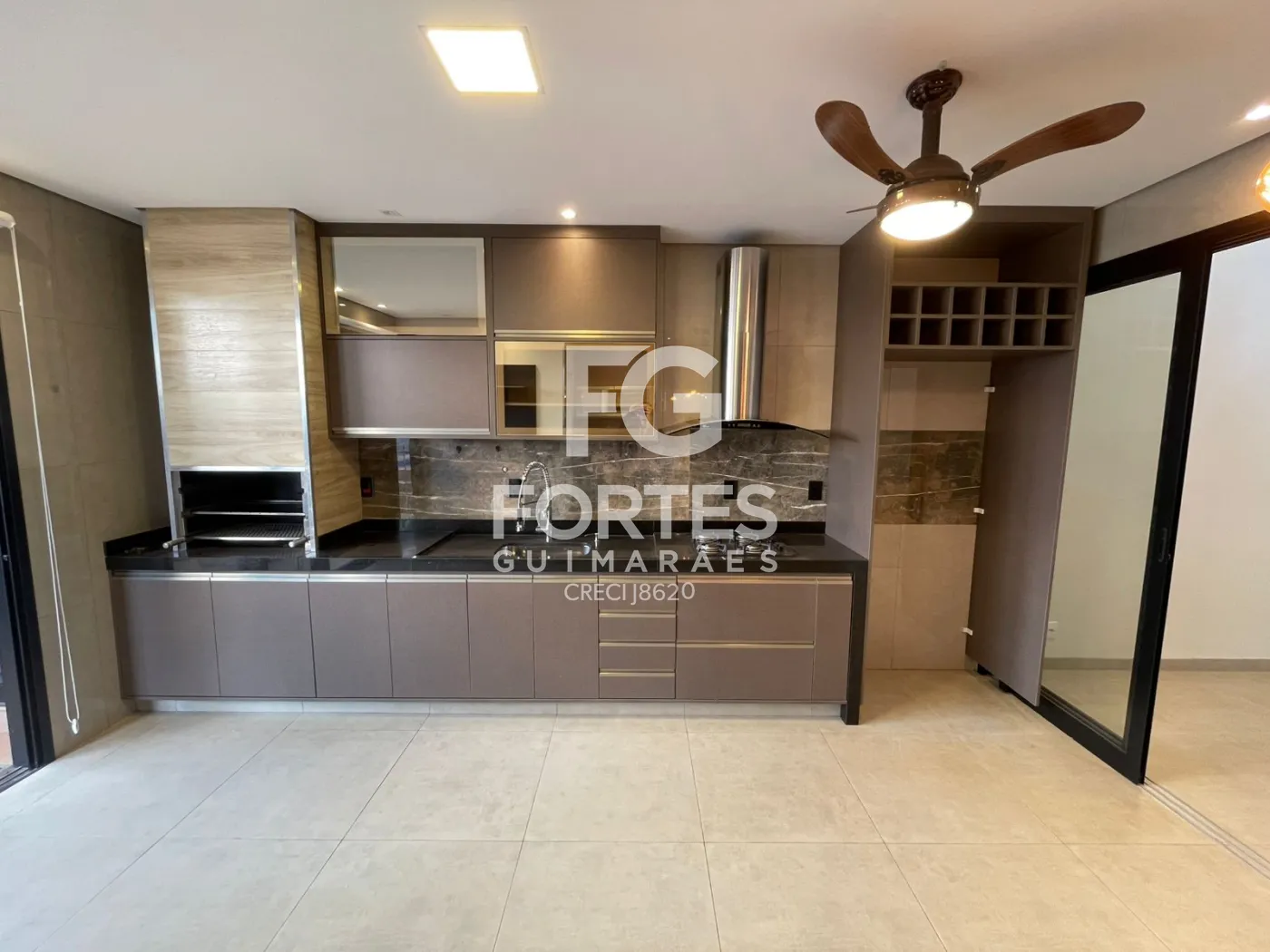 Cozinha gourmet rica em armários planejados, ventilador de teto, fogão cooktop, coifa e churrasqueira,