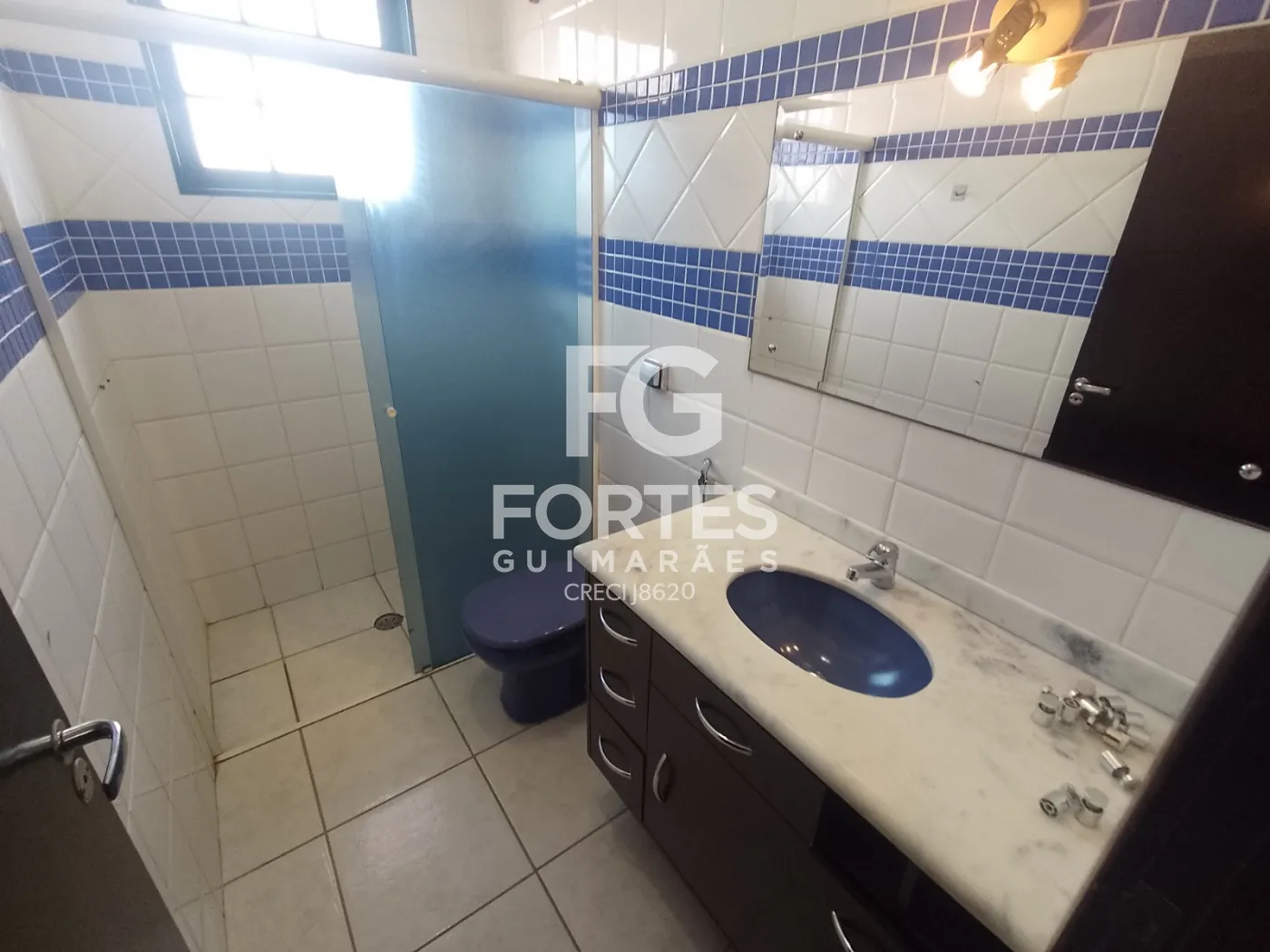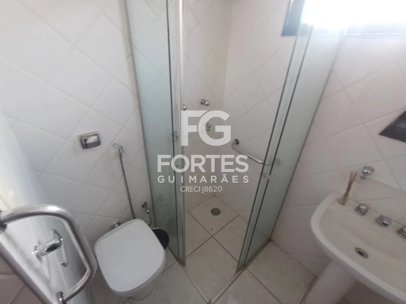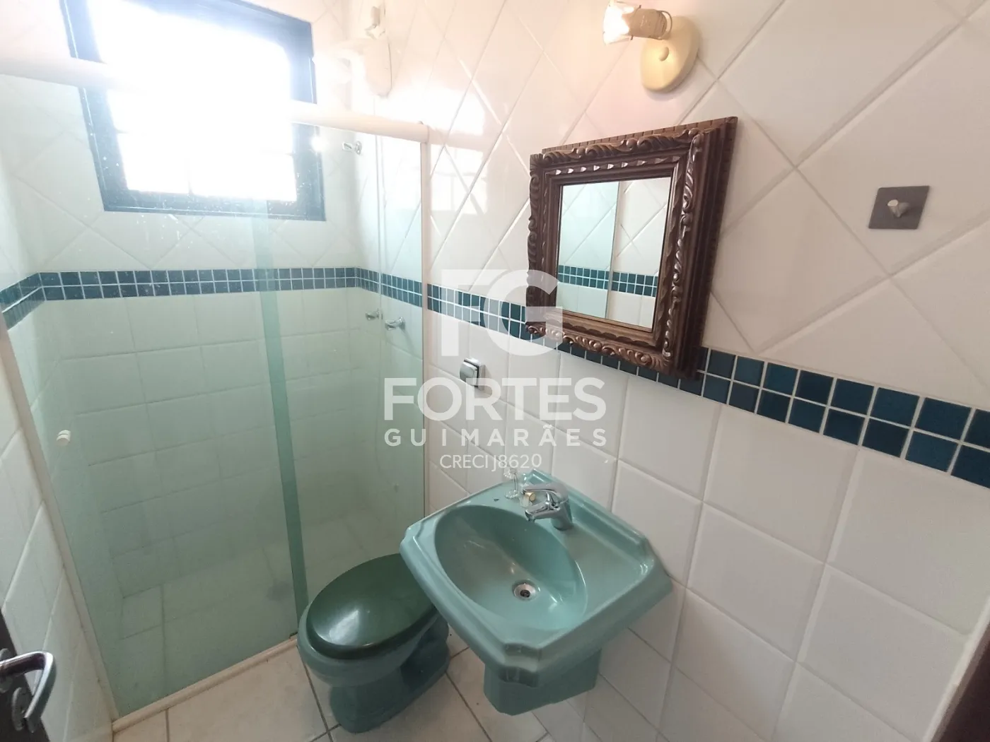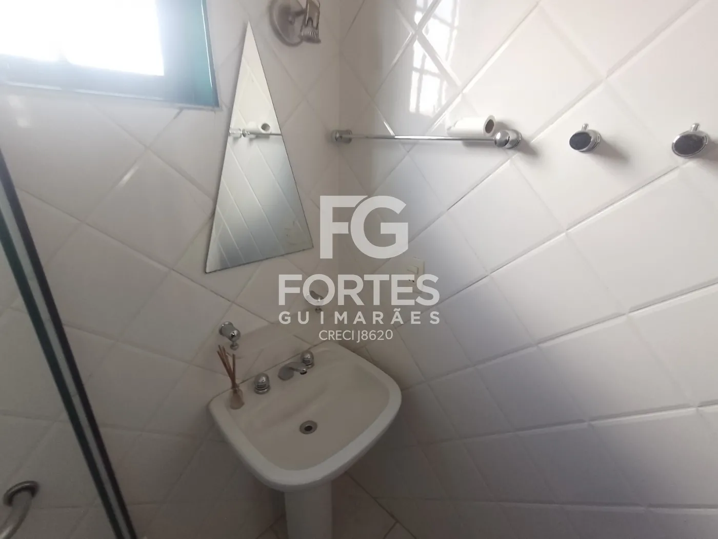 - Banheiro social com gabinete, box em vidro e espelho;