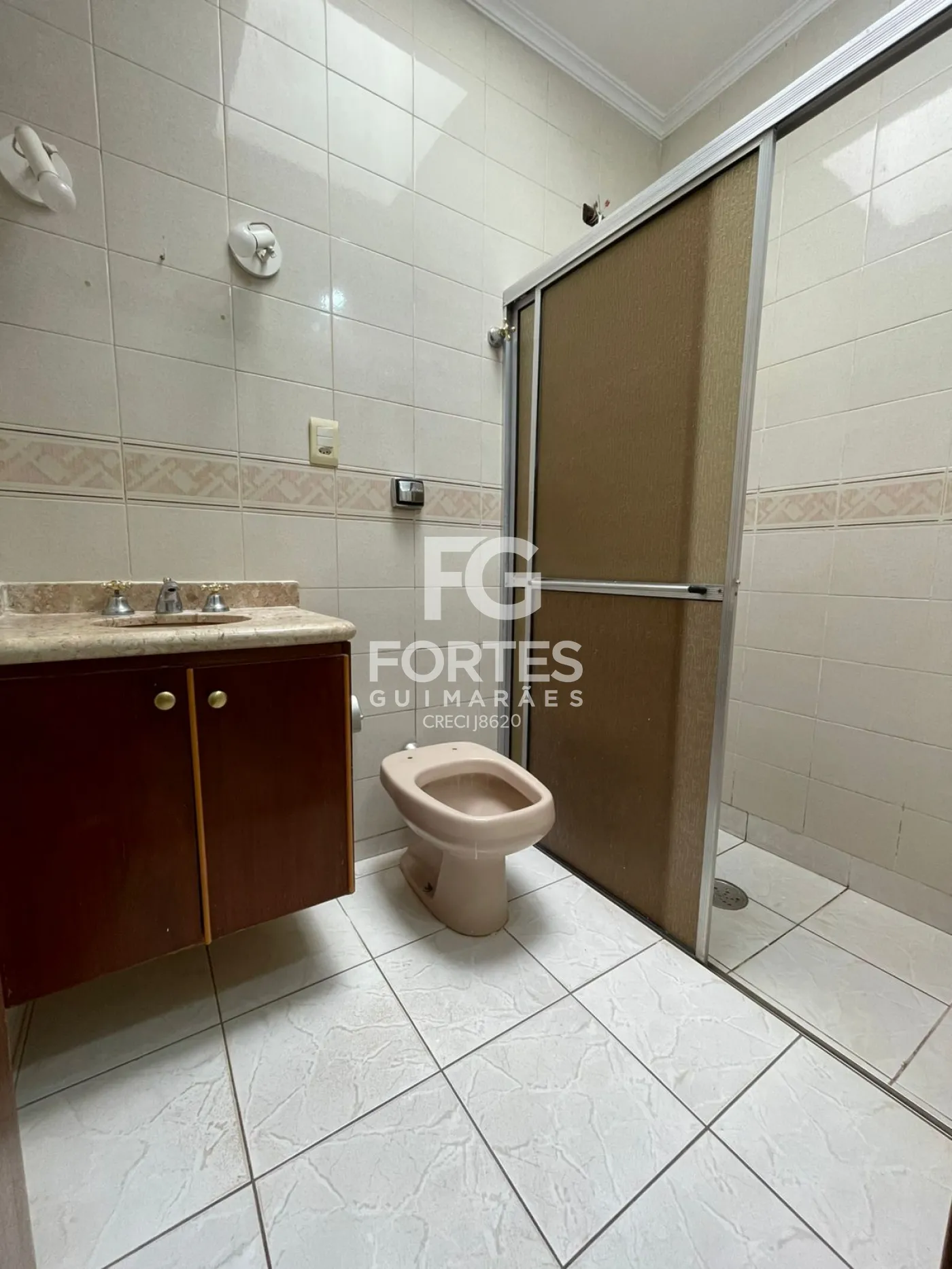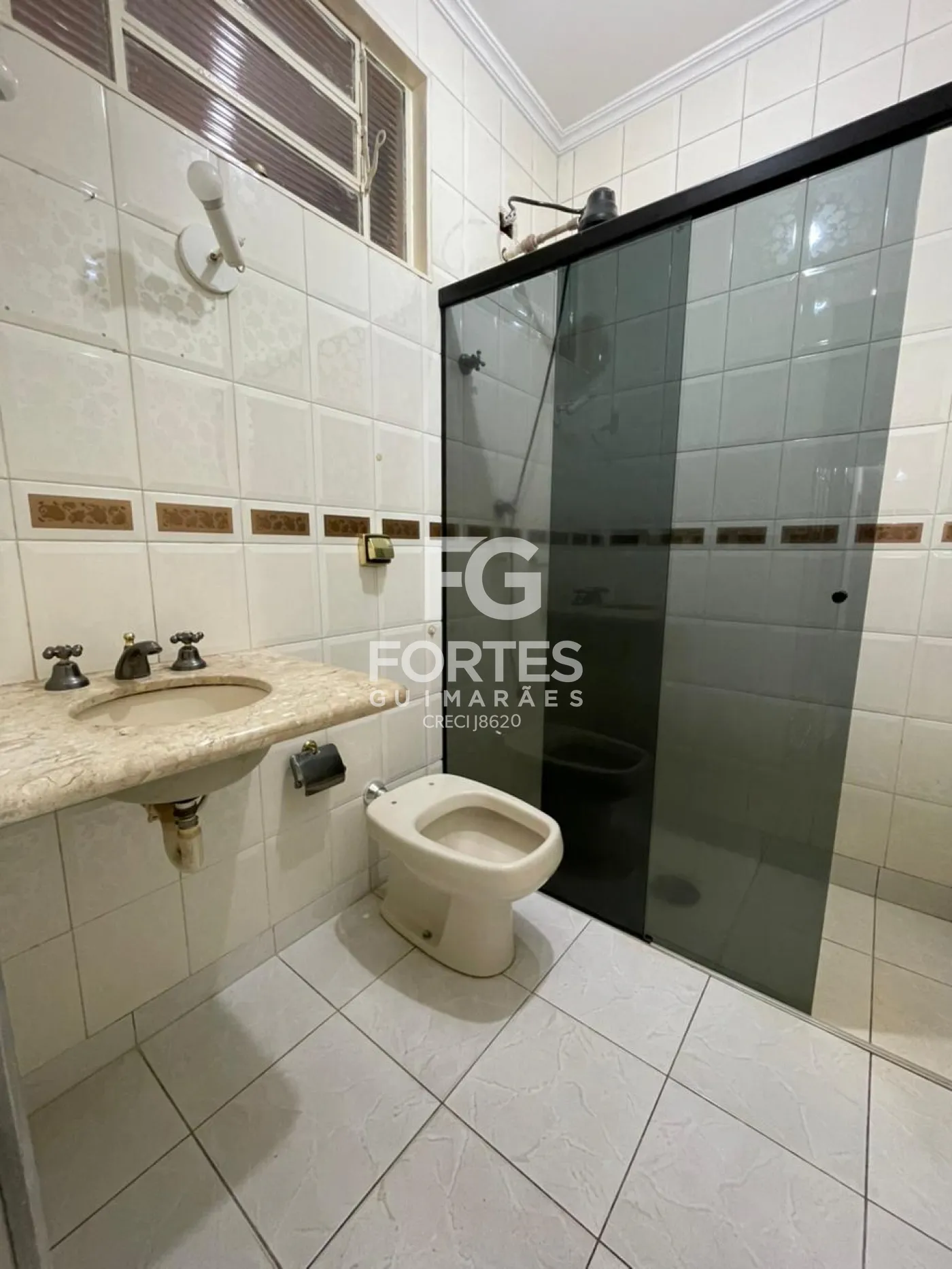 Banheiro da suite com box em vidro e chuveiro elétrico
